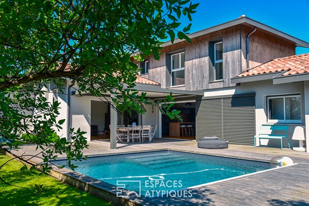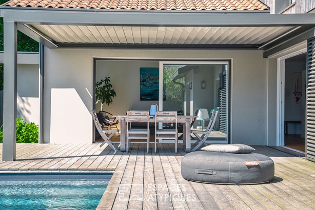 Sur les exterieurs, le jardin paysage d'especes mediterraneennes entourent la maison et transforment ce lieu de vie urbain en petit coin de paradis. La terrasse en bois exotique de plus de 100 m2 vient parfaire la piscine a la forme originale. La pergola bioclimatique permet de profiter tout au long de la journee de cet environnement calme et reposant.