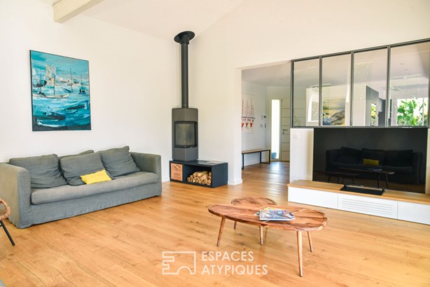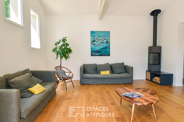 Le salon et sa charpente apparente revele une belle hauteur sous-plafond. Delimite par une verriere atelier, son volume confortable est faconne par son ouverture sur l'exterieur et son poele a bois moderne.