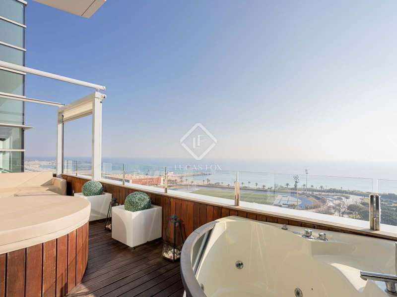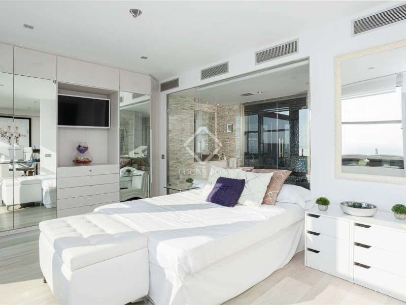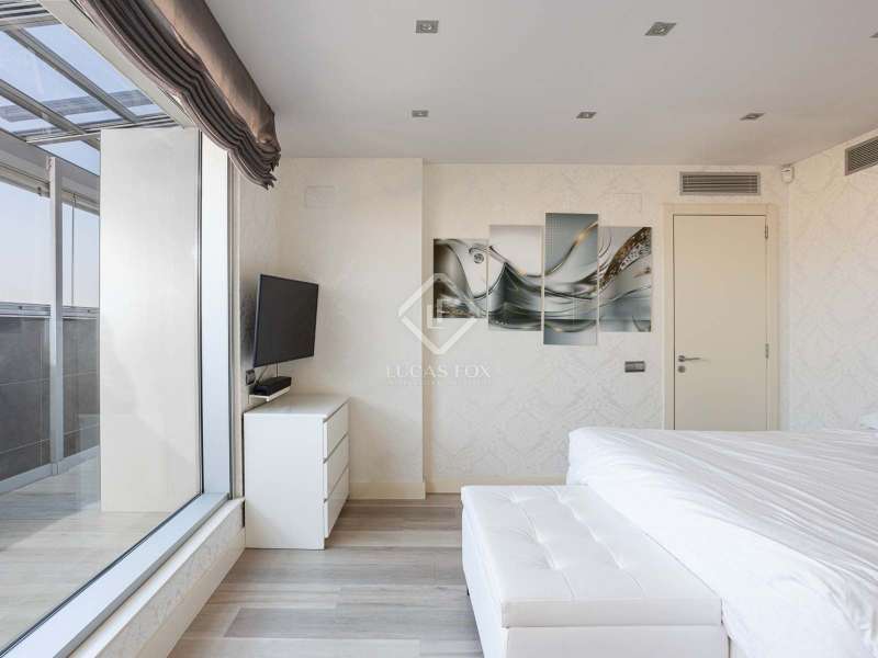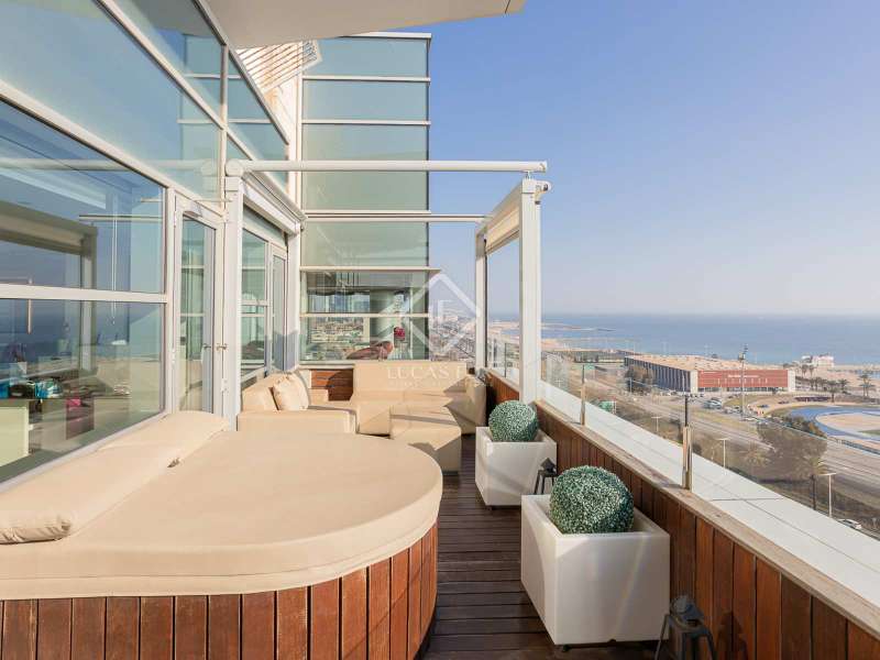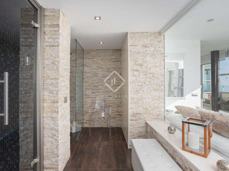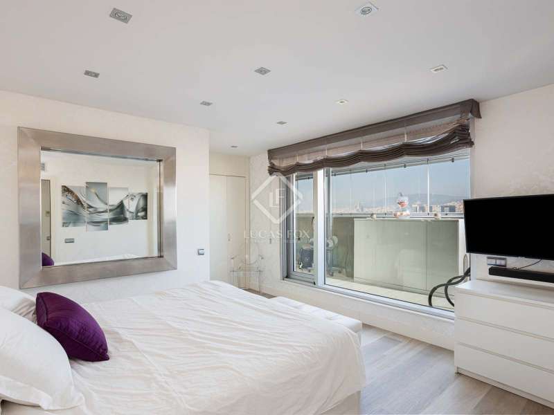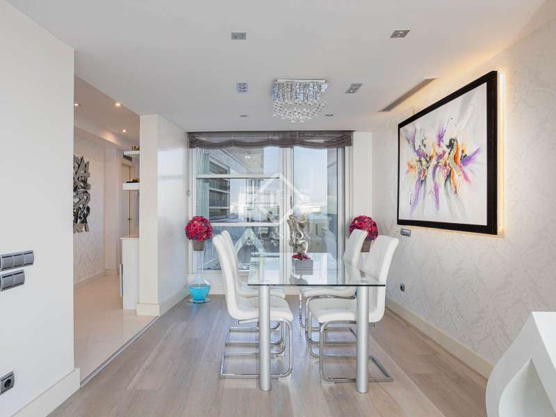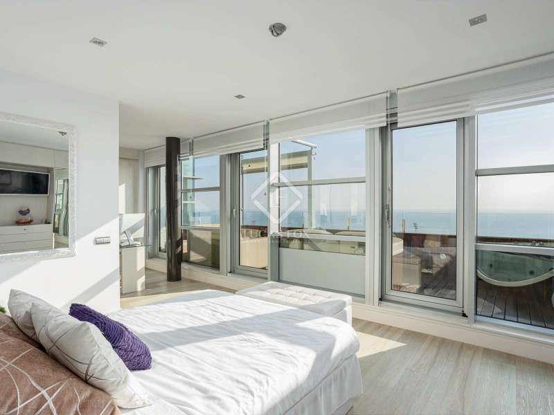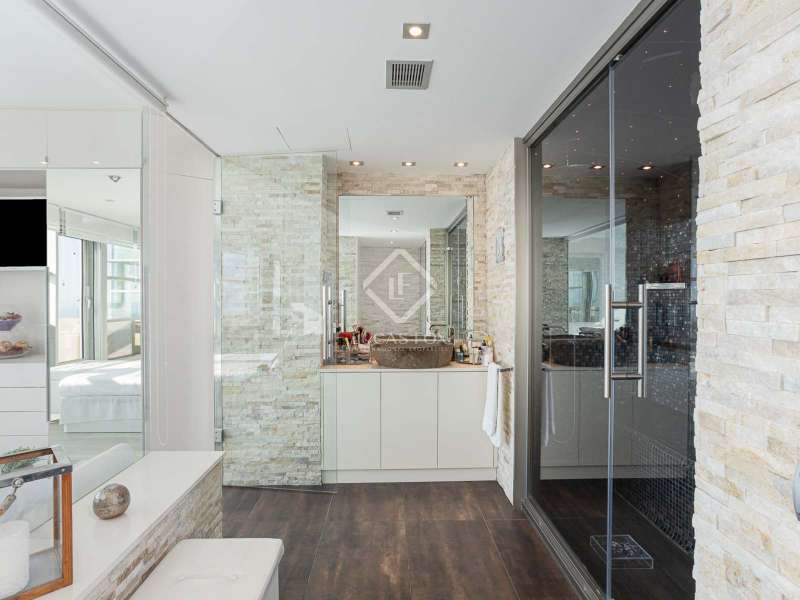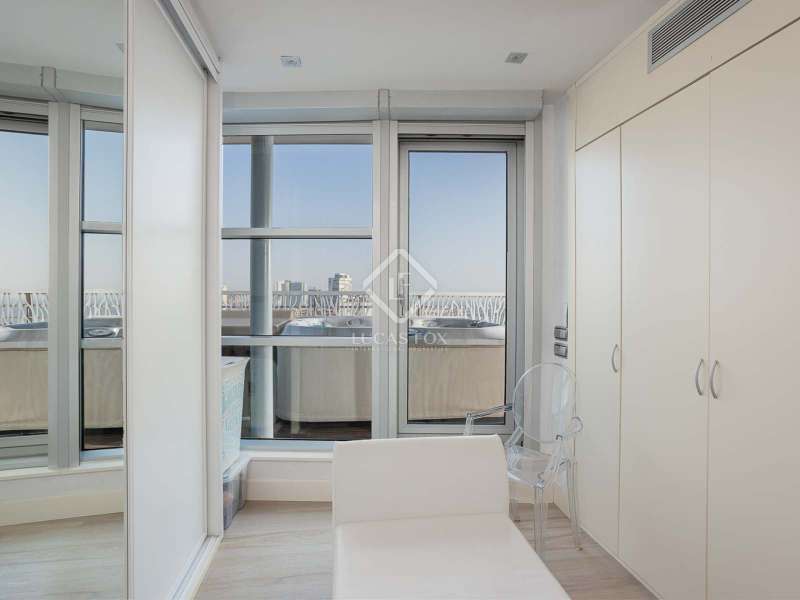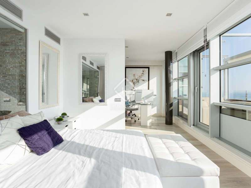 This modern penthouse is a provides complete luxury due to its characteristics, materials, perfect location within the city and of course, for the fantastic open views of the sea and the city that only very few penthouses in Barcelona offer. The layout consists of a large living-dining room with impressive windows that allow the entry of abundant natural light that fills the space and provides an enormous feeling of spaciousness. It comes prepared with a home automation system, surround sound system and designer lighting. The privileged views are not exclusive to the day area, since all the rooms on this floor, including its dressing room, enjoy views of the sea or the city. The night area houses 2 spacious double bedrooms with their own bathrooms. The main one, facing the sea, merges with one of the two outdoor terraces and includes a work or office area. The glass bathroom, designed with top quality materials, includes a waterfall shower and sauna from which you can continue enjoying the sea views. The second bedroom, facing the city, includes a large glazed gallery around the walls and ceiling that currently serves as a gym area. Like the master bedroom, it has access to its own terrace with a jacuzzi. An adjoining third bedroom serves as the main dressing room. Two large terraces complete the wonderful spaces of this penthouse, each with a chill-out area and jacuzzi, with personalized design of night lighting and audio for interior and exterior. Contact us to arrange a viewing of this exquisite city penthouse.