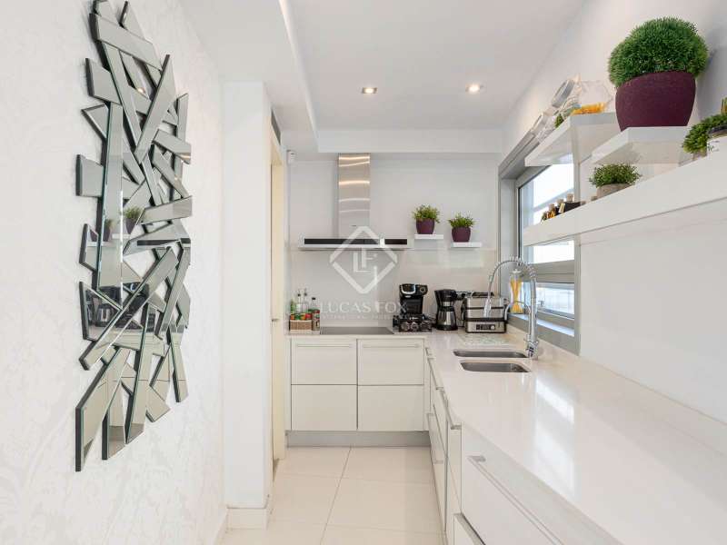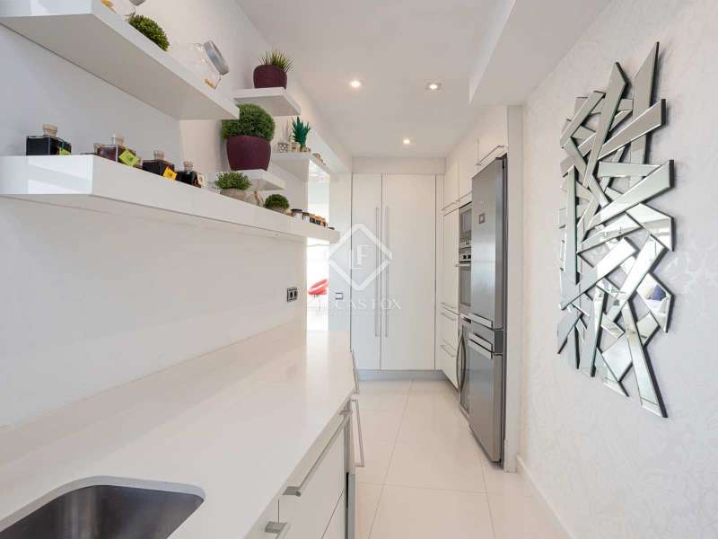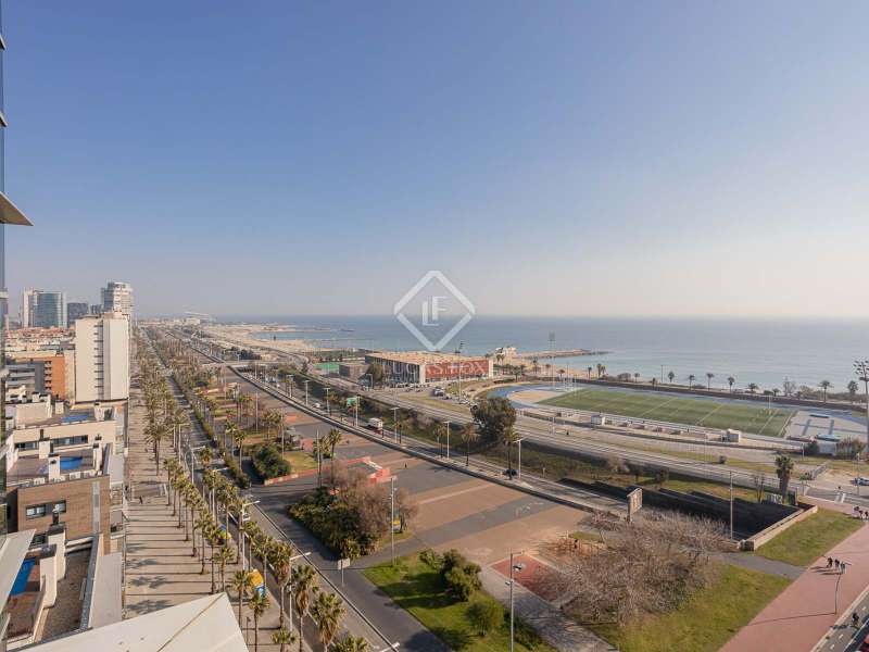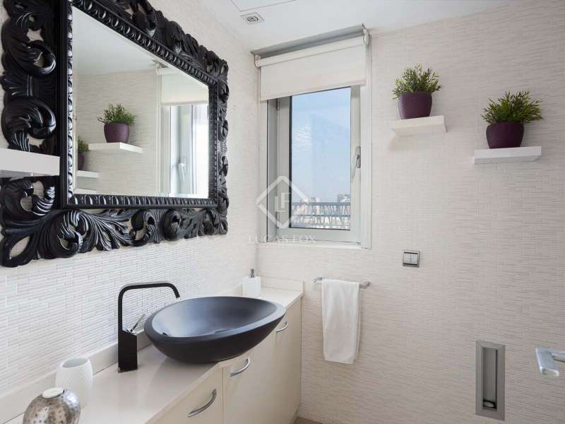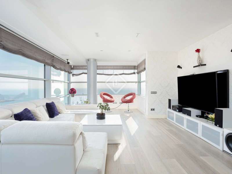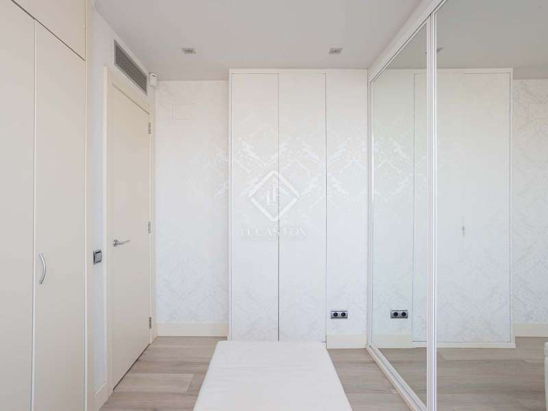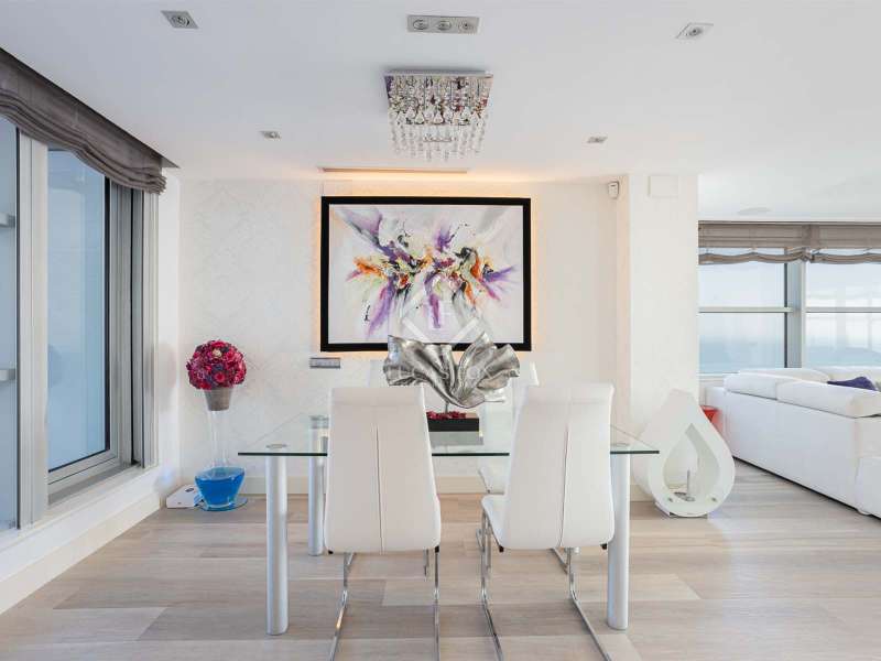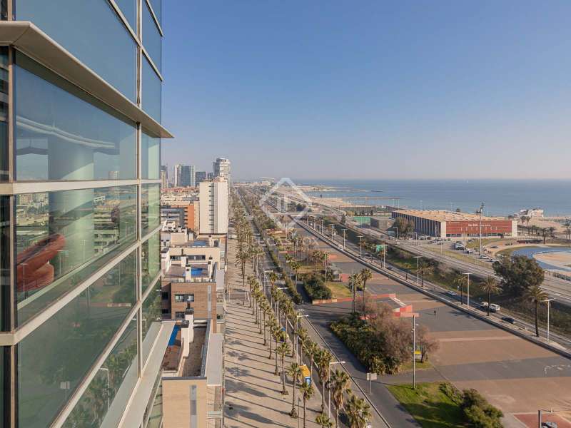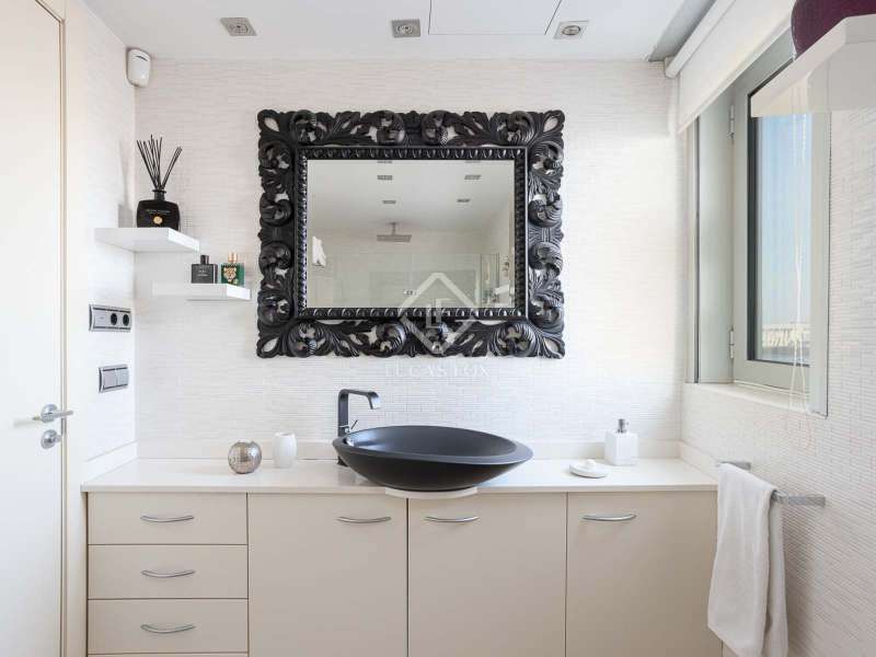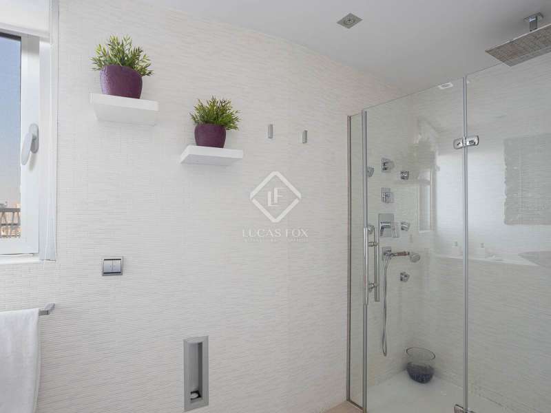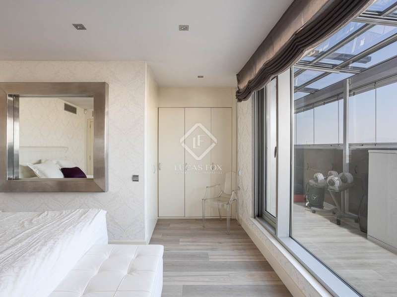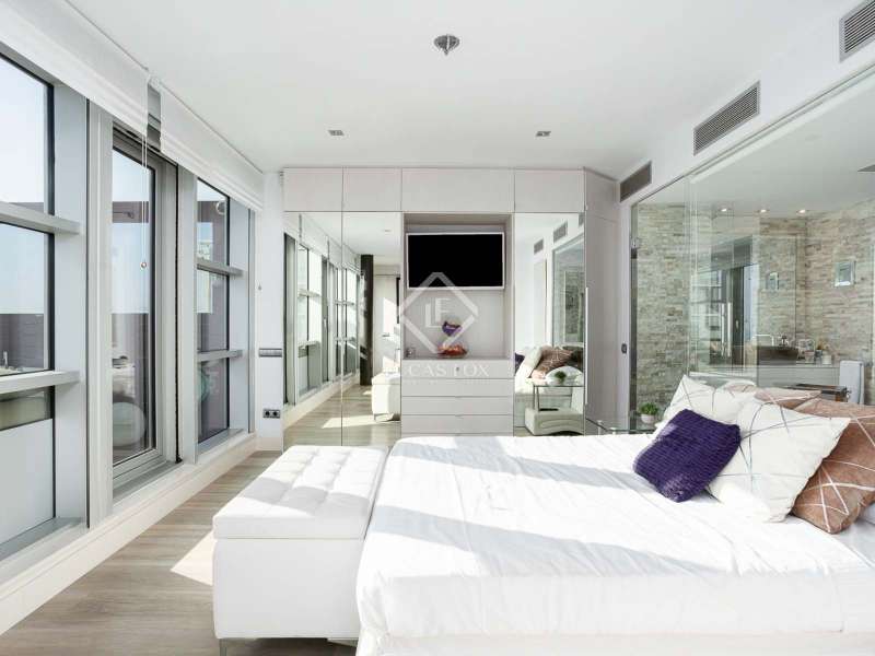 This modern penthouse is a provides complete luxury due to its characteristics, materials, perfect location within the city and of course, for the fantastic open views of the sea and the city that only very few penthouses in Barcelona offer. The layout consists of a large living-dining room with impressive windows that allow the entry of abundant natural light that fills the space and provides an enormous feeling of spaciousness. It comes prepared with a home automation system, surround sound system and designer lighting. The privileged views are not exclusive to the day area, since all the rooms on this floor, including its dressing room, enjoy views of the sea or the city. The night area houses 2 spacious double bedrooms with their own bathrooms. The main one, facing the sea, merges with one of the two outdoor terraces and includes a work or office area. The glass bathroom, designed with top quality materials, includes a waterfall shower and sauna from which you can continue enjoying the sea views. The second bedroom, facing the city, includes a large glazed gallery around the walls and ceiling that currently serves as a gym area. Like the master bedroom, it has access to its own terrace with a jacuzzi. An adjoining third bedroom serves as the main dressing room. Two large terraces complete the wonderful spaces of this penthouse, each with a chill-out area and jacuzzi, with personalized design of night lighting and audio for interior and exterior. Contact us to arrange a viewing of this exquisite city penthouse.