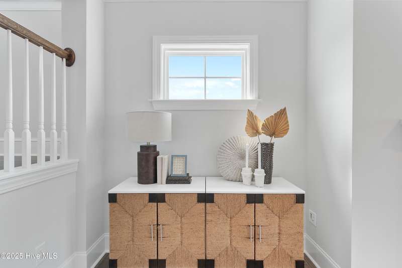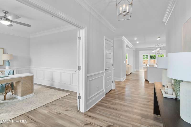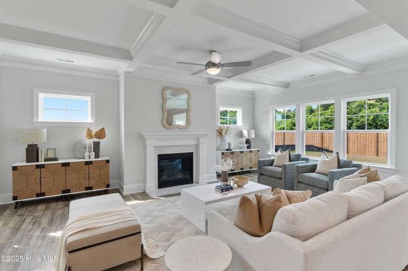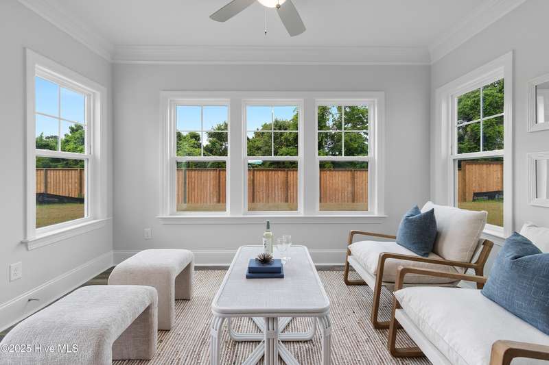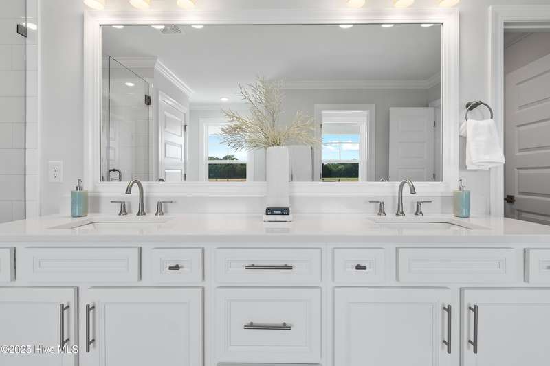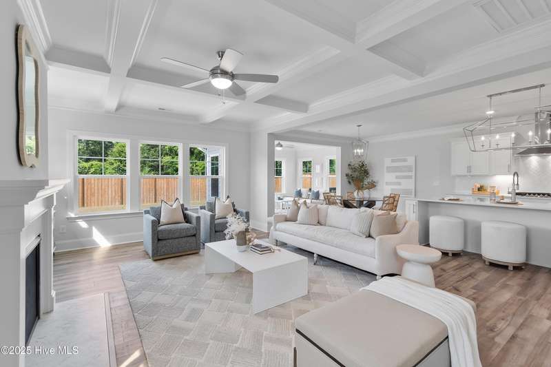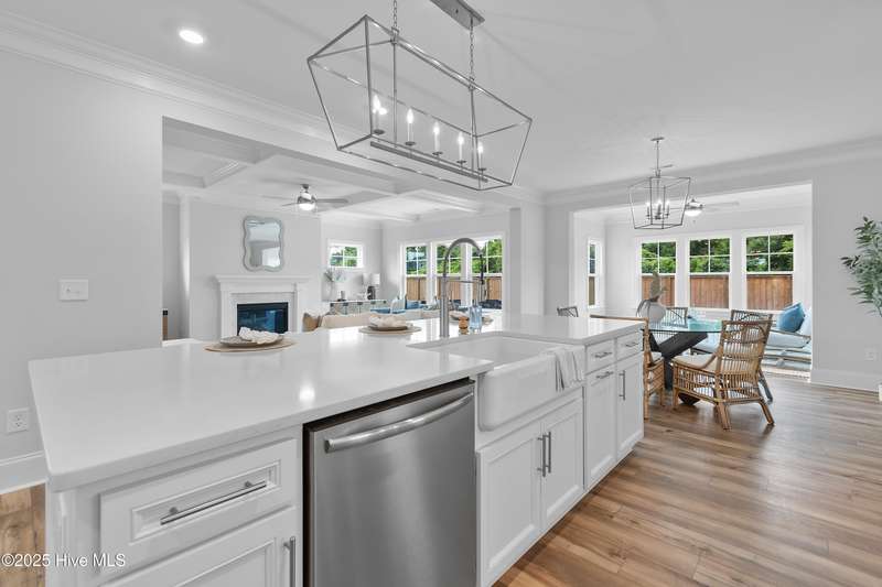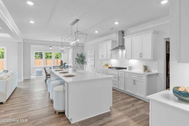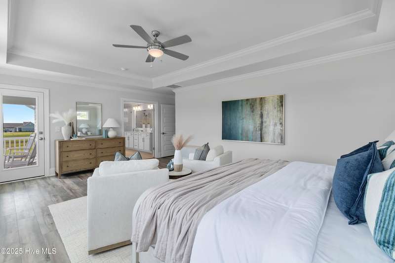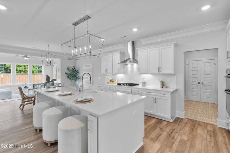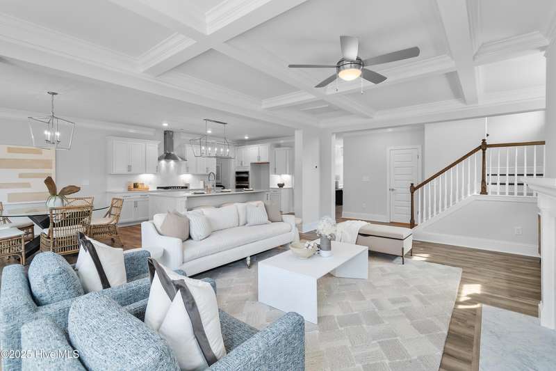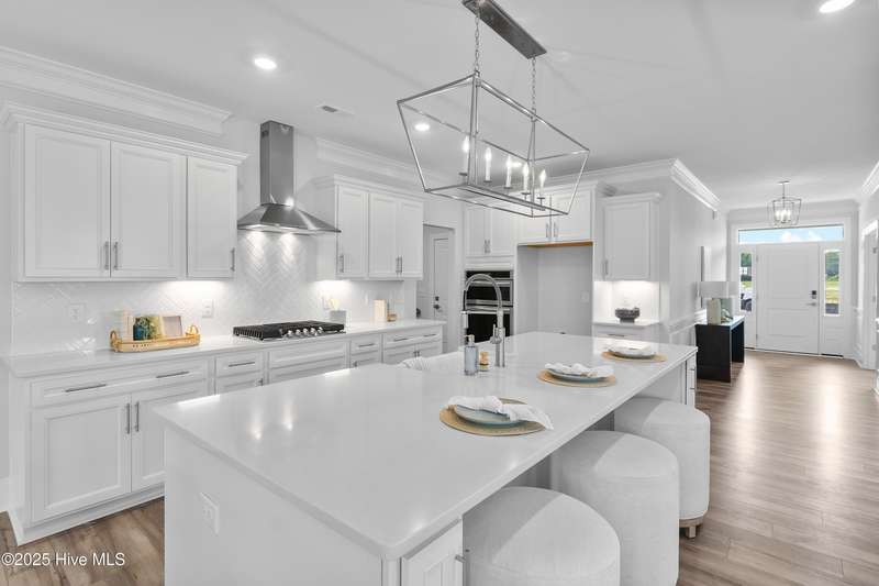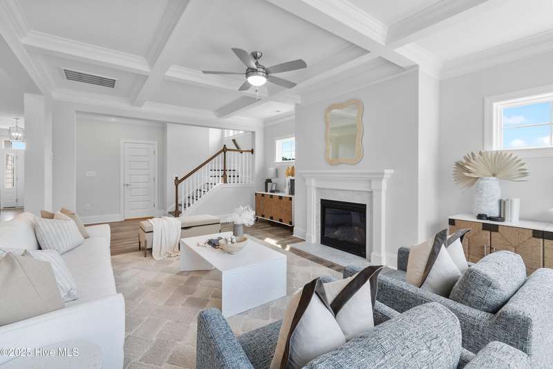 NEW CONSTRUCTION, Never-Lived-In Home. East Wynd - Hampstead's exclusive gated waterfront community with Intracoastal Dock/Kayak launch, public water/sewer, natural gas, high-speed AT&T fiber internet and sought-after Topsail School District. Thoughtfully designed home with custom refined finishes and modern comforts, 5-bedroom, 4.5-bath home offers 3,735 square feet of coastal elegance. Double front porches welcome you into a light-filled foyer with intricate millwork and double crown molding throughout the main living spaces. The gourmet kitchen features a large quartz island, farmhouse apron sink, soft-close Aristokraft cabinetry with pullouts, subway tile backsplash in an elegant herringbone pattern, a premium Frigidaire Gourmet Gallery stainless steel appliance package to include a gas cooktop, built-in hood, and electric wall oven/microwave combo. The kitchen flows into the sunroom, where seven windows and a glass door open to the outdoor patio. The adjacent great room features a stunning coffered ceiling and fireplace with upgraded mantel and marble surround. A versatile flex room with wainscoting and French doors offers the perfect setting for a home office, library or formal dining room. A nearby hallway leads to a beautifully appointed drop zone with navy blue cubbies, decorative tiles, and a spacious walk-in pantry closet. The main floor guest suite offers a private retreat with an ensuite bathroom and walk-in closet ideal for visitors or multi-generational living. The primary suite is a private haven, featuring a spa-like ensuite bathroom with dual quartz-topped vanities, two linen closets, oversized tiled shower with a wall-mounted rain can showerhead, hand sprayer on a slide bar and a private balcony to enjoy serene water views. Additionally, there are four bedrooms upstairs, each includes crown molding and its own walk-in closet. A Jack and Jill bath connects two bedrooms, while a third full bath serves the remaining two rooms. A spacious bonus room offers flexibility like a media room, or playroom. The laundry room is both stylish and functional with decorative tile flooring, built-in cabinetry, a folding table, a utility sink and window. The garage is well-appointed, complete with utility sink, crown molding, baseboards, two garage door openers, keypad, and a tankless water heater. Just five minutes from a free public boat ramp and located within the sought-after Topsail School District, East Wynd offers a lifestyle of ease, recreation, and beauty - just minutes from Surf City and Topsail Beach.