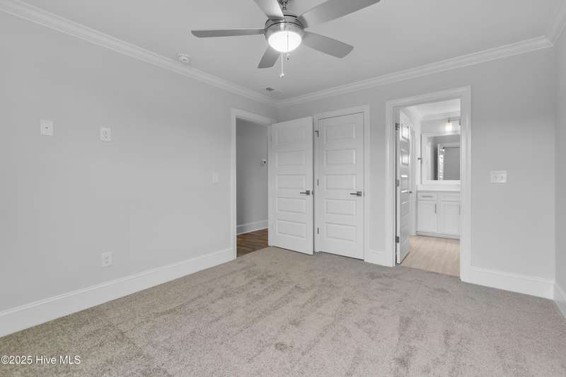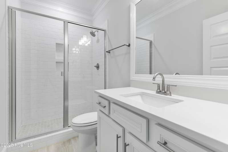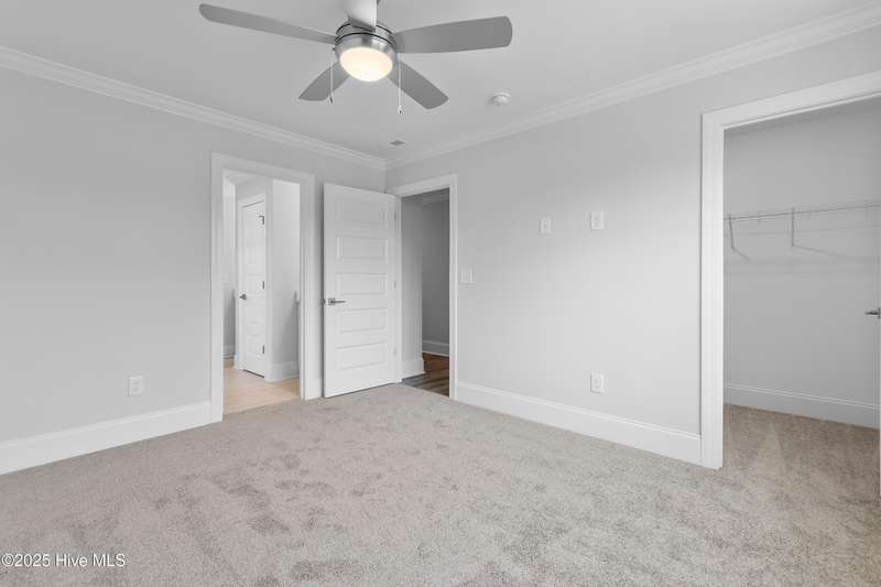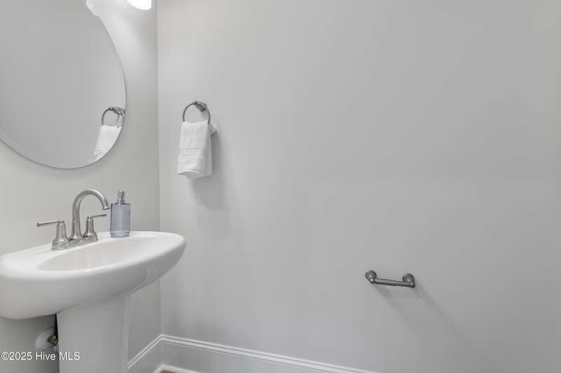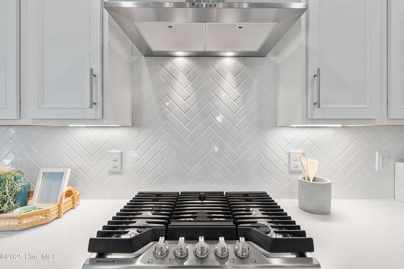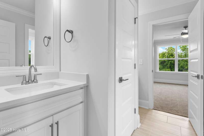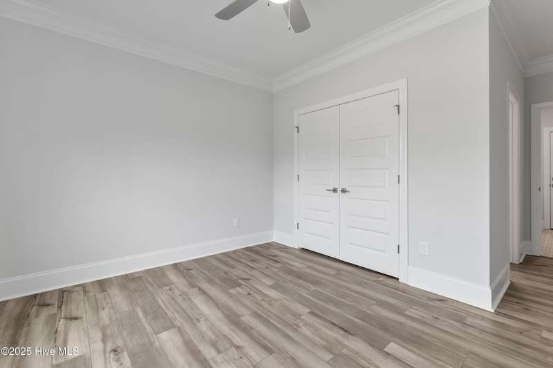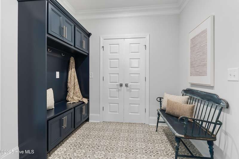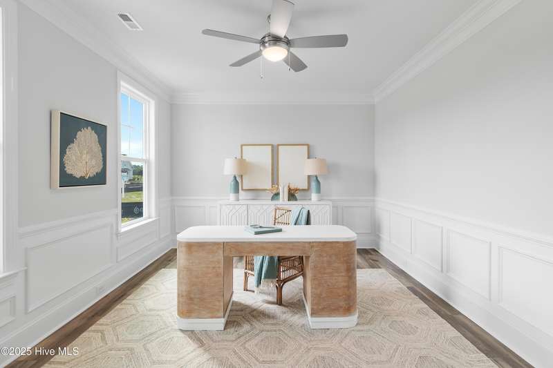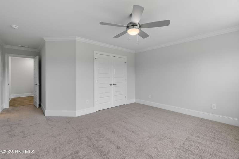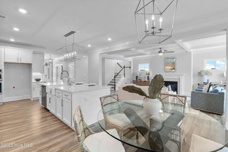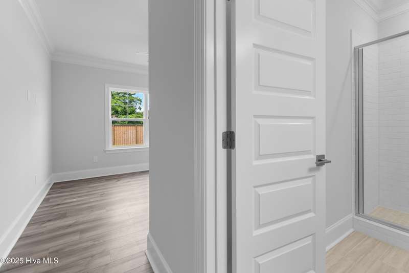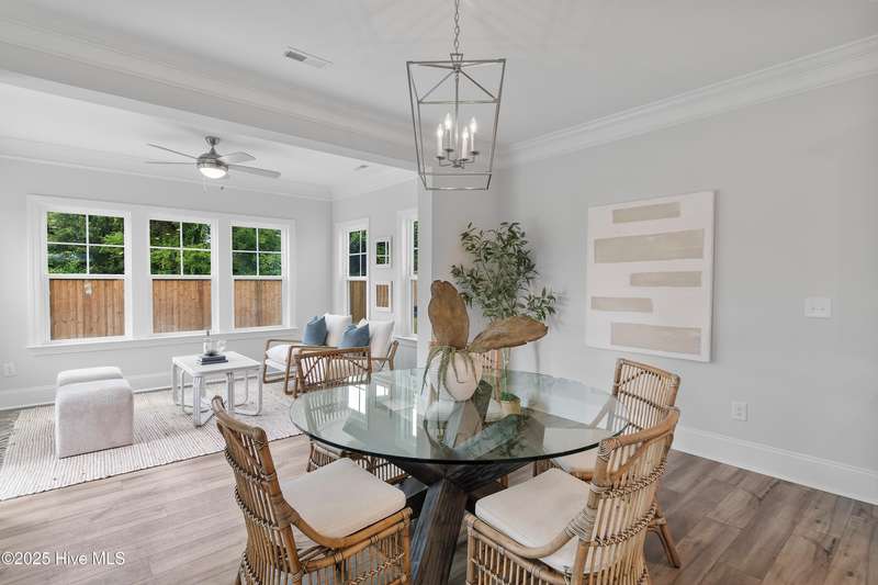 NEW CONSTRUCTION, Never-Lived-In Home. East Wynd - Hampstead's exclusive gated waterfront community with Intracoastal Dock/Kayak launch, public water/sewer, natural gas, high-speed AT&T fiber internet and sought-after Topsail School District. Thoughtfully designed home with custom refined finishes and modern comforts, 5-bedroom, 4.5-bath home offers 3,735 square feet of coastal elegance. Double front porches welcome you into a light-filled foyer with intricate millwork and double crown molding throughout the main living spaces. The gourmet kitchen features a large quartz island, farmhouse apron sink, soft-close Aristokraft cabinetry with pullouts, subway tile backsplash in an elegant herringbone pattern, a premium Frigidaire Gourmet Gallery stainless steel appliance package to include a gas cooktop, built-in hood, and electric wall oven/microwave combo. The kitchen flows into the sunroom, where seven windows and a glass door open to the outdoor patio. The adjacent great room features a stunning coffered ceiling and fireplace with upgraded mantel and marble surround. A versatile flex room with wainscoting and French doors offers the perfect setting for a home office, library or formal dining room. A nearby hallway leads to a beautifully appointed drop zone with navy blue cubbies, decorative tiles, and a spacious walk-in pantry closet. The main floor guest suite offers a private retreat with an ensuite bathroom and walk-in closet ideal for visitors or multi-generational living. The primary suite is a private haven, featuring a spa-like ensuite bathroom with dual quartz-topped vanities, two linen closets, oversized tiled shower with a wall-mounted rain can showerhead, hand sprayer on a slide bar and a private balcony to enjoy serene water views. Additionally, there are four bedrooms upstairs, each includes crown molding and its own walk-in closet. A Jack and Jill bath connects two bedrooms, while a third full bath serves the remaining two rooms. A spacious bonus room offers flexibility like a media room, or playroom. The laundry room is both stylish and functional with decorative tile flooring, built-in cabinetry, a folding table, a utility sink and window. The garage is well-appointed, complete with utility sink, crown molding, baseboards, two garage door openers, keypad, and a tankless water heater. Just five minutes from a free public boat ramp and located within the sought-after Topsail School District, East Wynd offers a lifestyle of ease, recreation, and beauty - just minutes from Surf City and Topsail Beach.