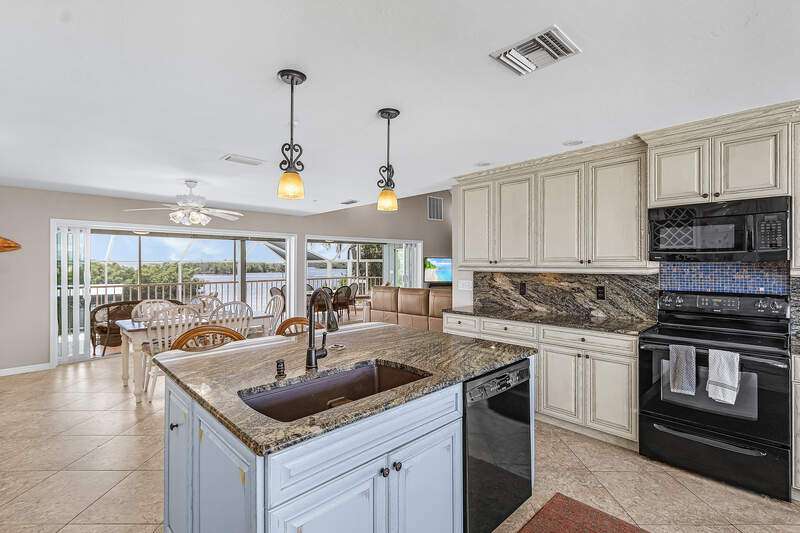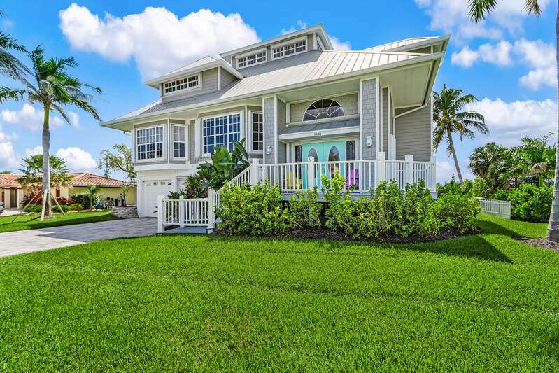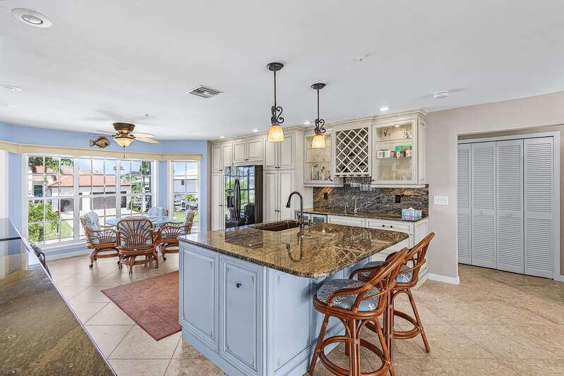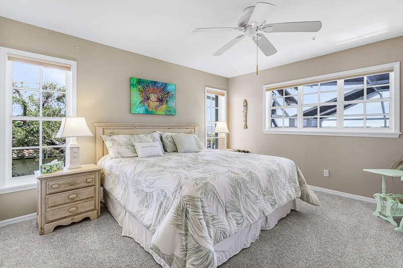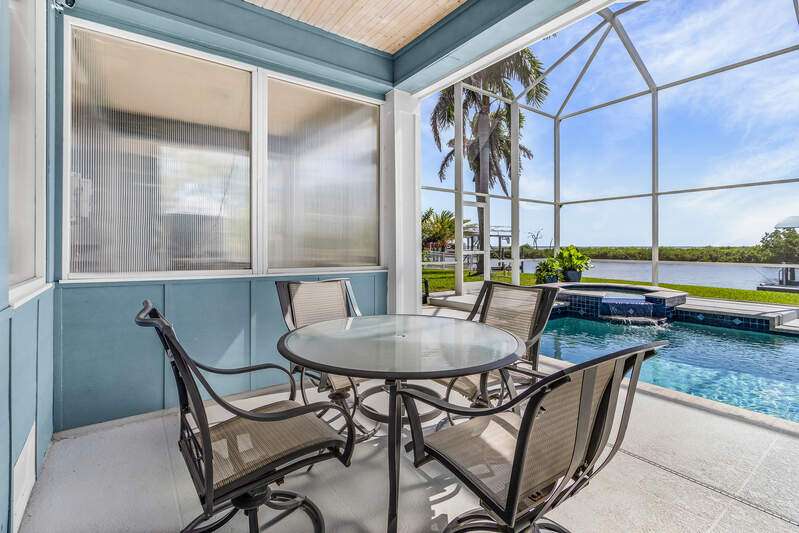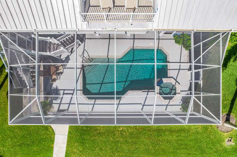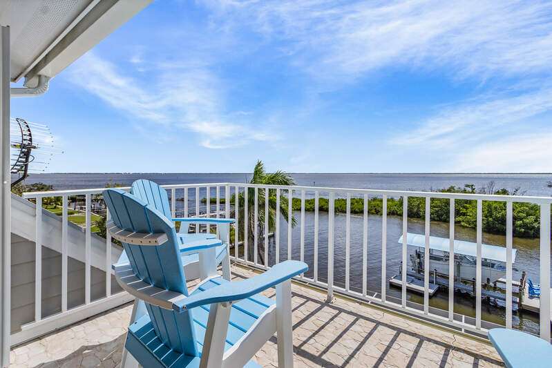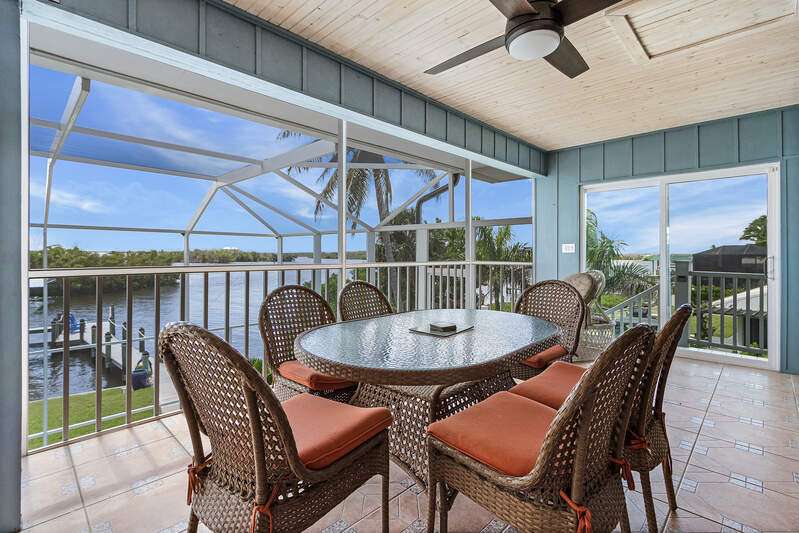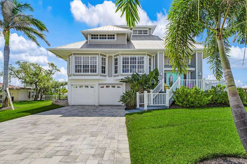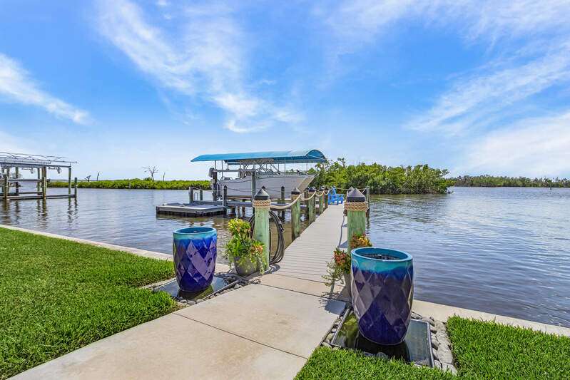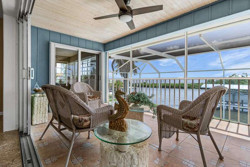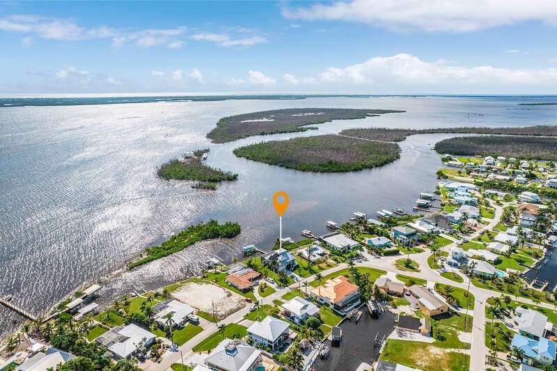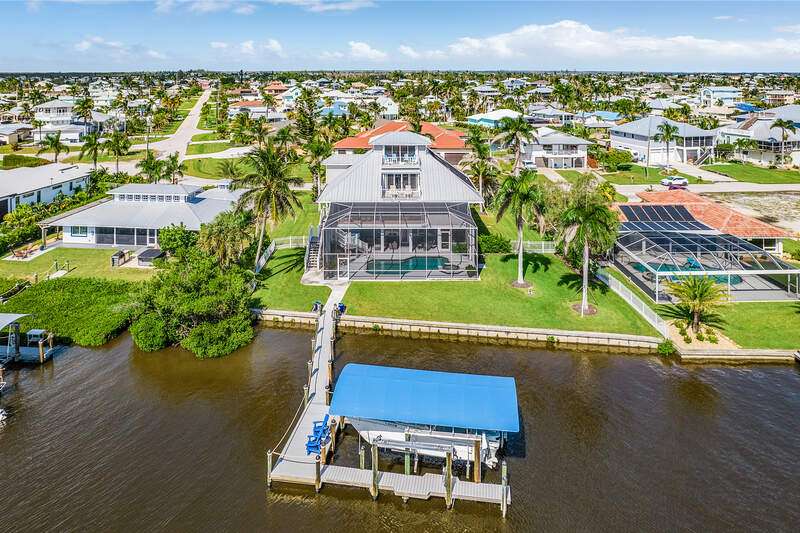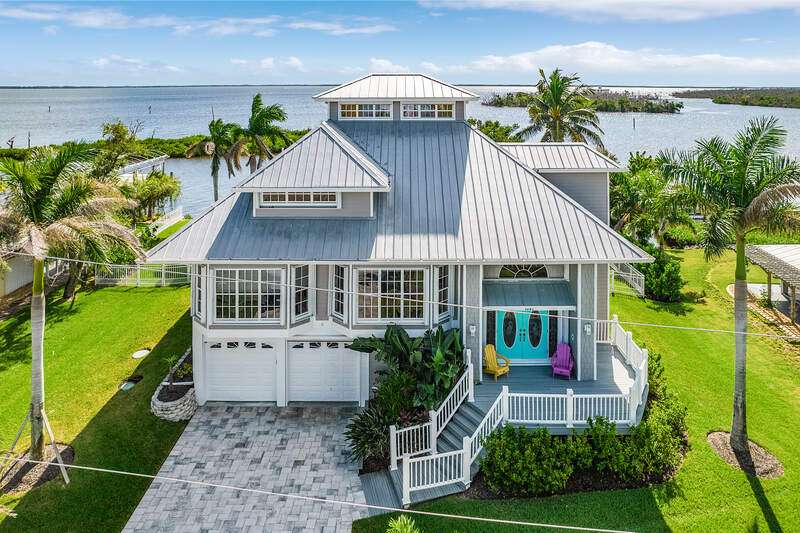 With the BEST view on Pine Island, this getaway stilt home has amazing amenities and upgrades including a wrap around composite boat dock with a 10,000# covered boat lift. Well constructed and maintained, this 4 bedroom, 3 bath home features one of the highest views of San Carlos Bay, Sanibel, and Pine Island Sound. Come and watch the dolphins and birds play. This home features a stone entry and an interior elevator that allows easy access to every floor. The first floor has a stunning open living area, kitchen, living room, and dining room with views of the bay. Impact pocket sliders lead to a large balcony and the two story pool cage allows for truly open living floor plan. The second floor has a spacious primary suite and luxurious bathroom with a sun porch overlooking the bay. The third floor is a den/4th bedroom and balcony looking out at the bay, with views of the Sanibel bridge and Punta Rasa. The ground floor has a paver driveway, an extra long and high 2 car garage, full bath, laundry, workshop, storage and a beautifully resurfaced in ground pool with cage, solar and electric pool heat, and a new pool pump. There is a fully automated AquaLink system to control pool functions. The backyard is aluminum fenced for a pet safe backyard. City water plus a well plumbed for Rainbird automated/zoned lawn irrigation. This home has optimum hurricane protection with cement board siding, accordion and roll down shutters, impact sliders on main level, closed cell spray foam insulation, shear walls, and upgraded hurricane strapping. It is fully wind mitigated. This home has new electric service panel and meter in 2022, retractable garage door automatic roll down screen in 2024, new composite front porch and rear stairs in 2024, and new washer and dryer in 2023. All new air conditioning. Two story pool cage was also new is 2023. Make your appointment to see this fantastic home.