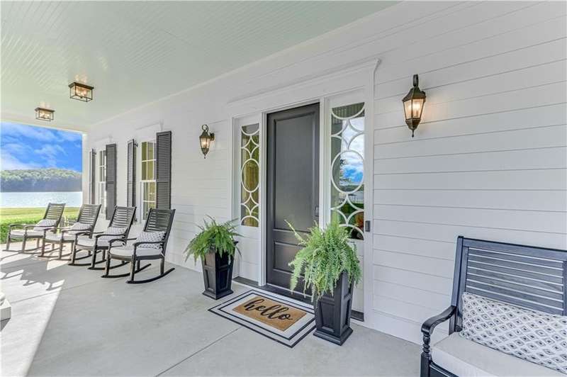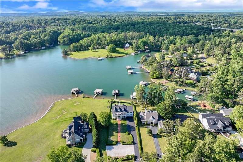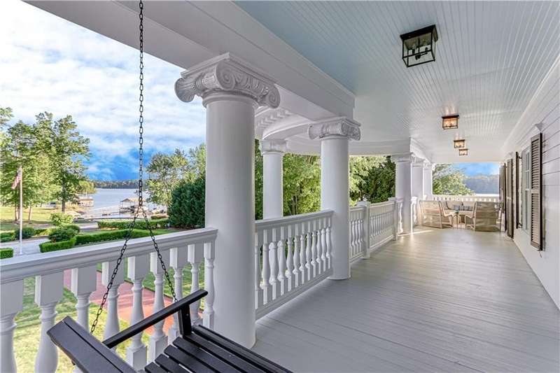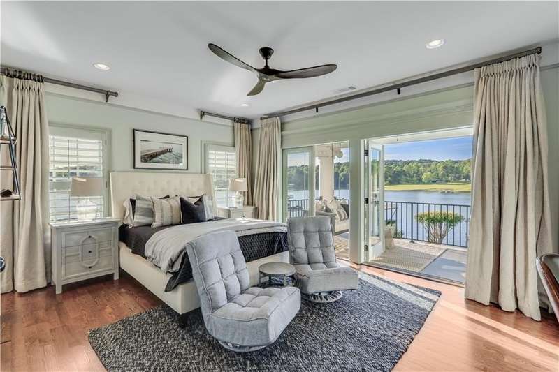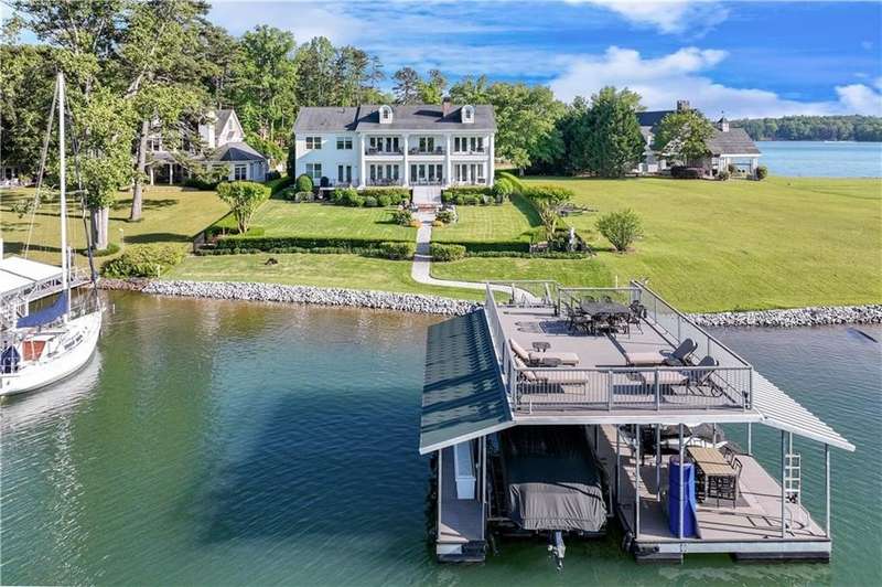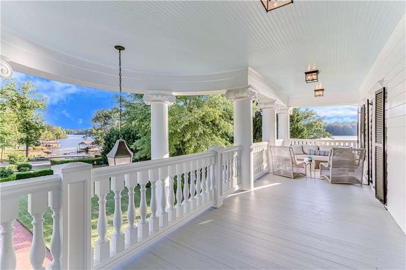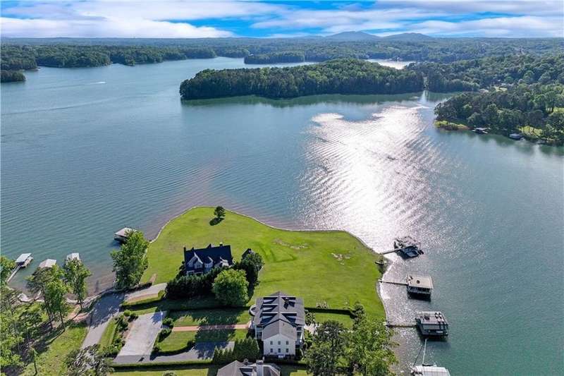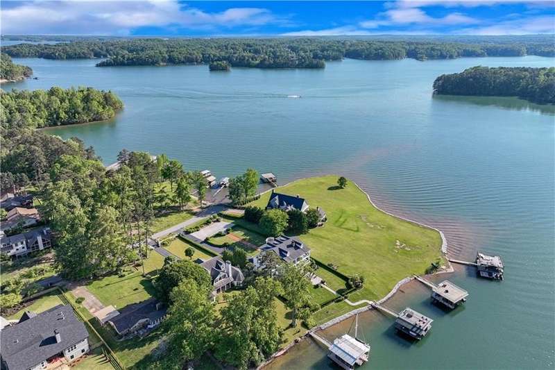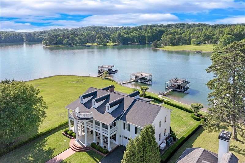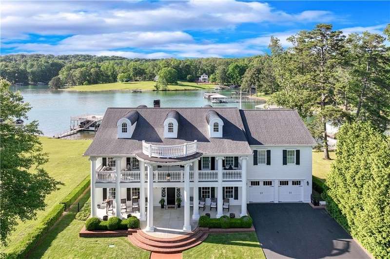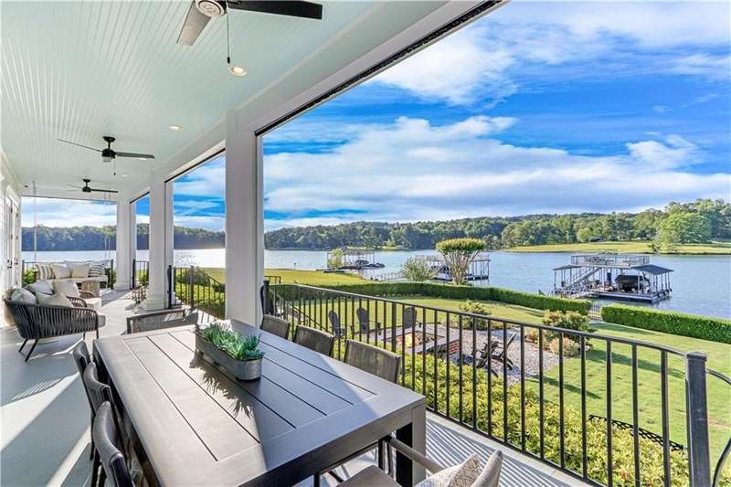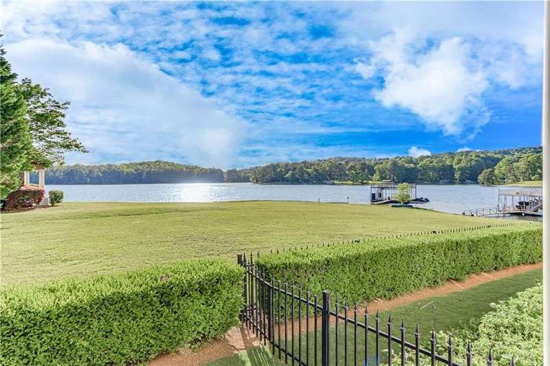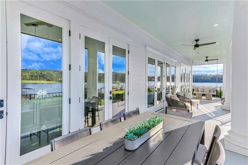 Southern coastal living meets lakefront luxury in this spectacular gated home on Lake Lanier. Live the lifestyle you've been dreaming of! Situated on a quiet peninsula street in the sought-after Six Mile Creek area, this one-of-a-kind property offers 270-degree stunning water views and a rare, level, grass-to-water lot. The CORPS line is IN the water, allowing full use of the fenced backyard right to the beautiful rip rap shoreline. Enjoy over 1,900 square feet of covered outdoor living across four spacious covered porches, with breathtaking sunrises or sunsets from every room. French doors in every space, including ensuite bedrooms, open to covered verandas for seamless indoor-outdoor living. Just steps from the home, a private 32'x32' twin-slip dock with party deck awaits your boats and jet skis! Equipped with a boat lift, jet ski ports, and irrigation pump for irrigating to the yard, making lake life easy. Entertain or relax from the upper party deck enjoying nightly sunsets. Inside, the home features a grand two-story marble foyer, soaring ceilings, hardwood floors, detailed millwork, and updated lighting. The main level includes a formal dining room, home office or media room, and an open-concept great room with gas fireplace that flows into a chef's kitchen with a large island, Wolf professional range, and SubZero refrigerator. French doors lead to a covered porch with automatic remote control screens. There are two primary suites, one on the main level and one upstairs-plus three additional private ensuites, a guest suite, and a spacious bonus/bunk room share a full bath. A gathering room with wet bar and porch access is perfect for relaxing. Additional highlights: oversized garage with half bath, whole-house generator, security system with cameras, two tankless water heaters, foam insulation, natural gas, and Forsyth County senior property tax exemptions available at age 65.