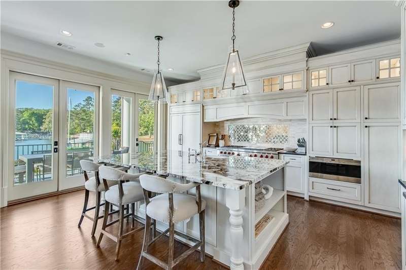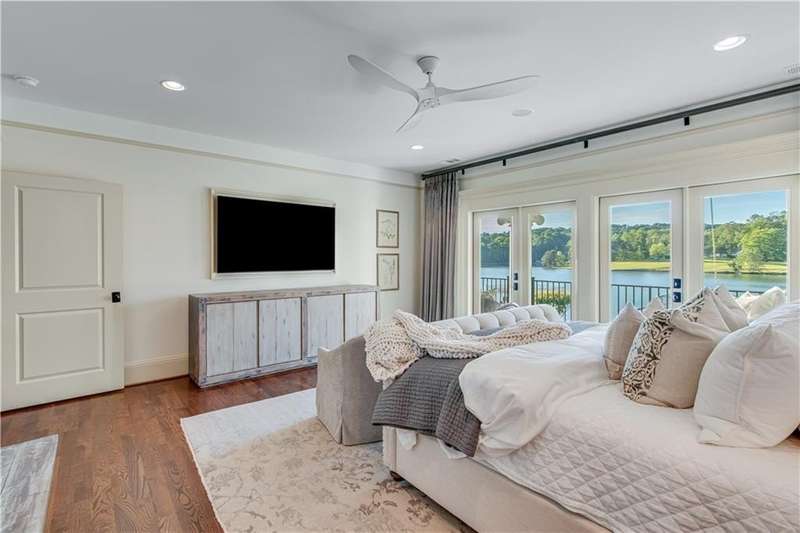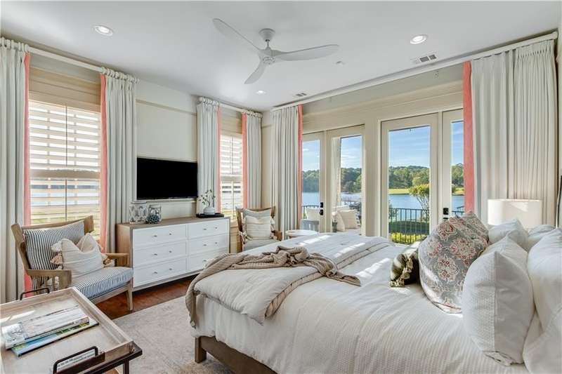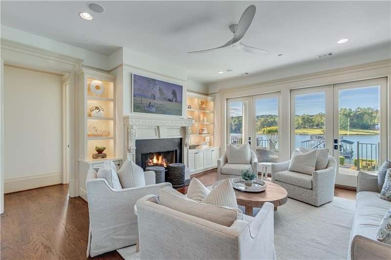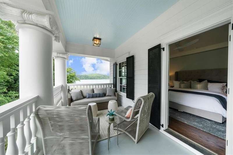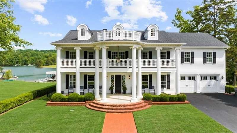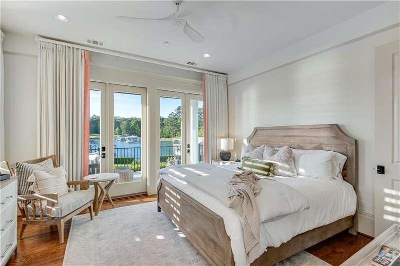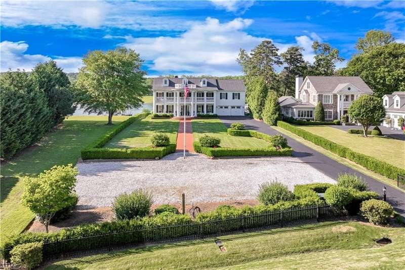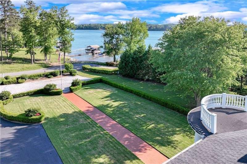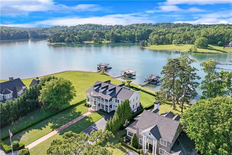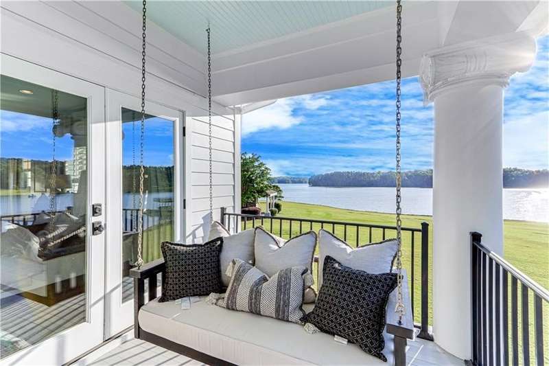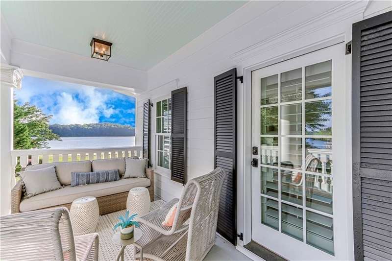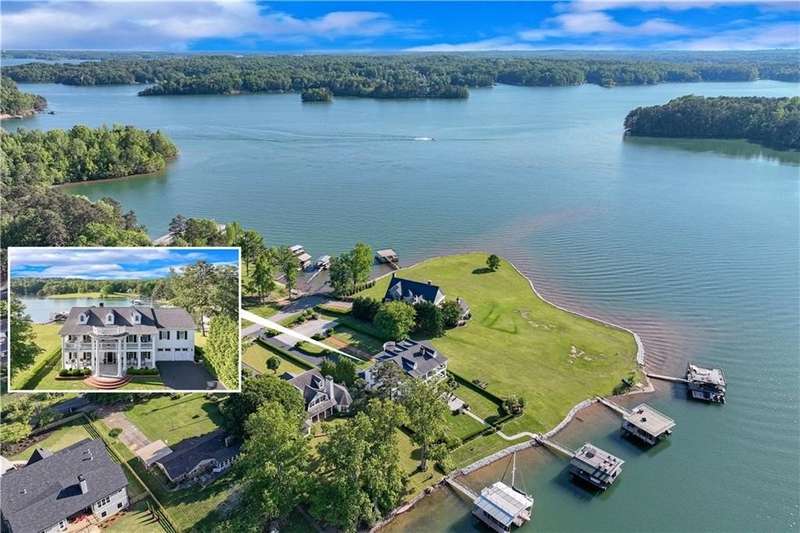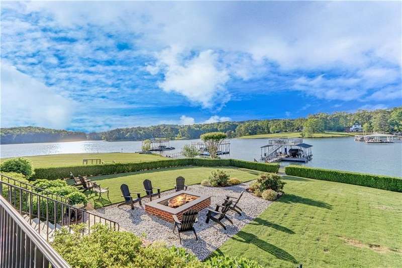 Southern coastal living meets lakefront luxury in this spectacular gated home on Lake Lanier. Live the lifestyle you've been dreaming of! Situated on a quiet peninsula street in the sought-after Six Mile Creek area, this one-of-a-kind property offers 270-degree stunning water views and a rare, level, grass-to-water lot. The CORPS line is IN the water, allowing full use of the fenced backyard right to the beautiful rip rap shoreline. Enjoy over 1,900 square feet of covered outdoor living across four spacious covered porches, with breathtaking sunrises or sunsets from every room. French doors in every space, including ensuite bedrooms, open to covered verandas for seamless indoor-outdoor living. Just steps from the home, a private 32'x32' twin-slip dock with party deck awaits your boats and jet skis! Equipped with a boat lift, jet ski ports, and irrigation pump for irrigating to the yard, making lake life easy. Entertain or relax from the upper party deck enjoying nightly sunsets. Inside, the home features a grand two-story marble foyer, soaring ceilings, hardwood floors, detailed millwork, and updated lighting. The main level includes a formal dining room, home office or media room, and an open-concept great room with gas fireplace that flows into a chef's kitchen with a large island, Wolf professional range, and SubZero refrigerator. French doors lead to a covered porch with automatic remote control screens. There are two primary suites, one on the main level and one upstairs-plus three additional private ensuites, a guest suite, and a spacious bonus/bunk room share a full bath. A gathering room with wet bar and porch access is perfect for relaxing. Additional highlights: oversized garage with half bath, whole-house generator, security system with cameras, two tankless water heaters, foam insulation, natural gas, and Forsyth County senior property tax exemptions available at age 65.