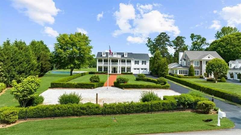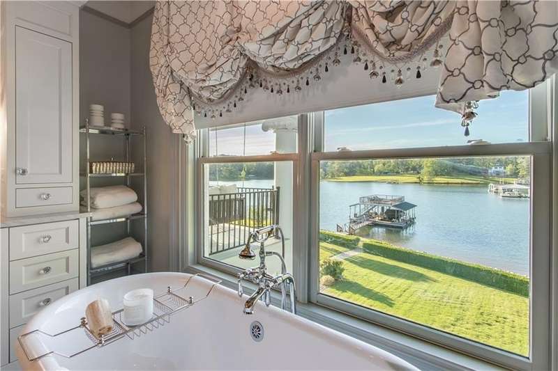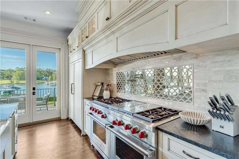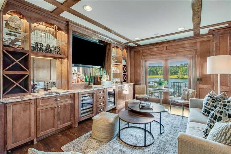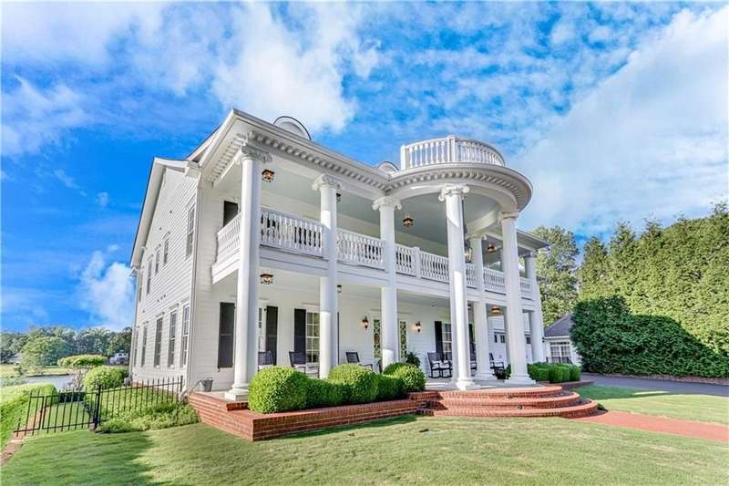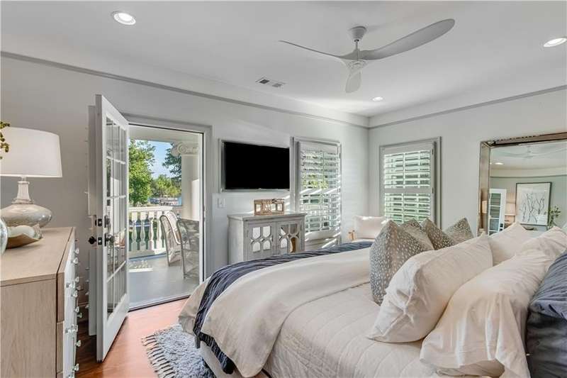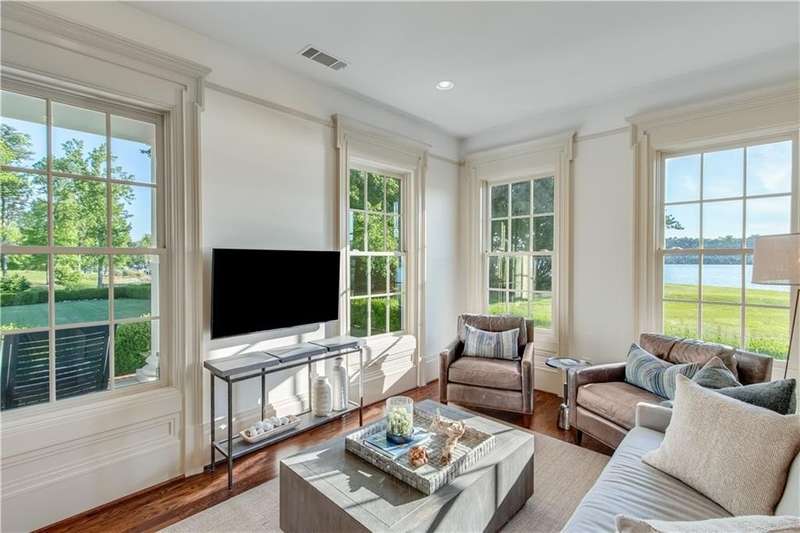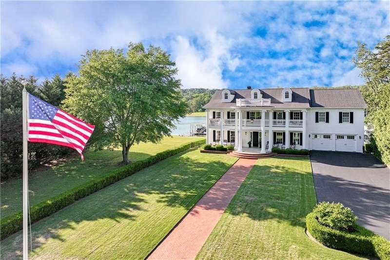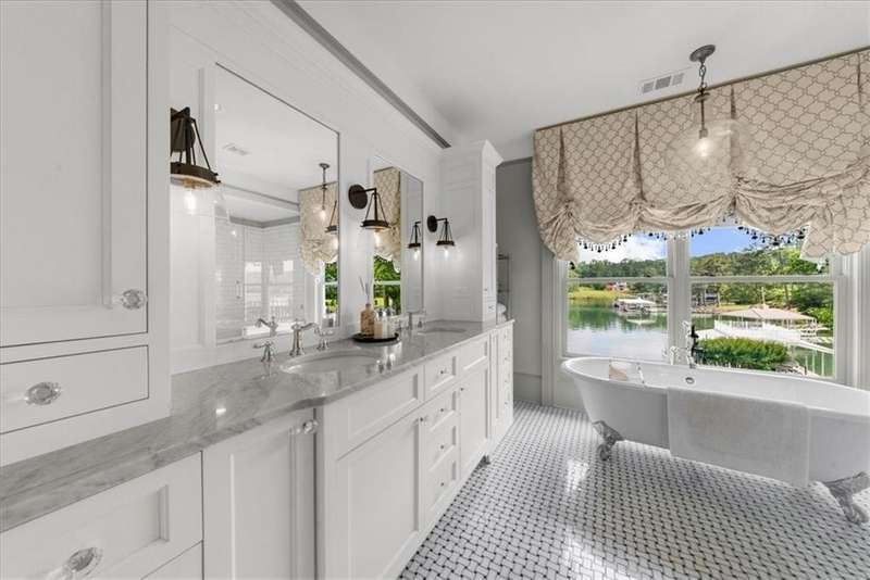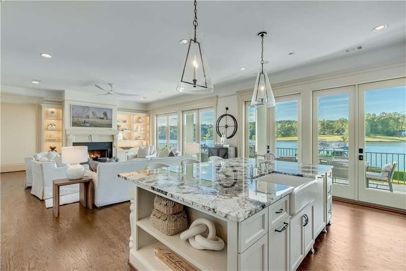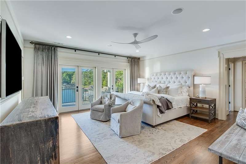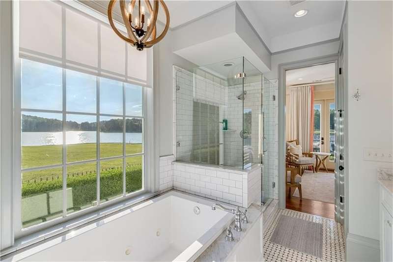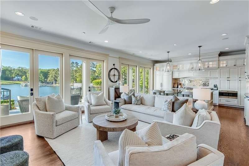 Southern coastal living meets lakefront luxury in this spectacular gated home on Lake Lanier. Live the lifestyle you've been dreaming of! Situated on a quiet peninsula street in the sought-after Six Mile Creek area, this one-of-a-kind property offers 270-degree stunning water views and a rare, level, grass-to-water lot. The CORPS line is IN the water, allowing full use of the fenced backyard right to the beautiful rip rap shoreline. Enjoy over 1,900 square feet of covered outdoor living across four spacious covered porches, with breathtaking sunrises or sunsets from every room. French doors in every space, including ensuite bedrooms, open to covered verandas for seamless indoor-outdoor living. Just steps from the home, a private 32'x32' twin-slip dock with party deck awaits your boats and jet skis! Equipped with a boat lift, jet ski ports, and irrigation pump for irrigating to the yard, making lake life easy. Entertain or relax from the upper party deck enjoying nightly sunsets. Inside, the home features a grand two-story marble foyer, soaring ceilings, hardwood floors, detailed millwork, and updated lighting. The main level includes a formal dining room, home office or media room, and an open-concept great room with gas fireplace that flows into a chef's kitchen with a large island, Wolf professional range, and SubZero refrigerator. French doors lead to a covered porch with automatic remote control screens. There are two primary suites, one on the main level and one upstairs-plus three additional private ensuites, a guest suite, and a spacious bonus/bunk room share a full bath. A gathering room with wet bar and porch access is perfect for relaxing. Additional highlights: oversized garage with half bath, whole-house generator, security system with cameras, two tankless water heaters, foam insulation, natural gas, and Forsyth County senior property tax exemptions available at age 65.