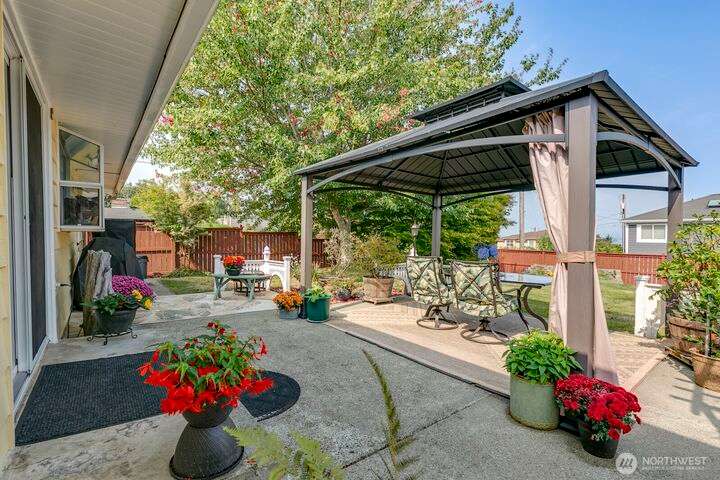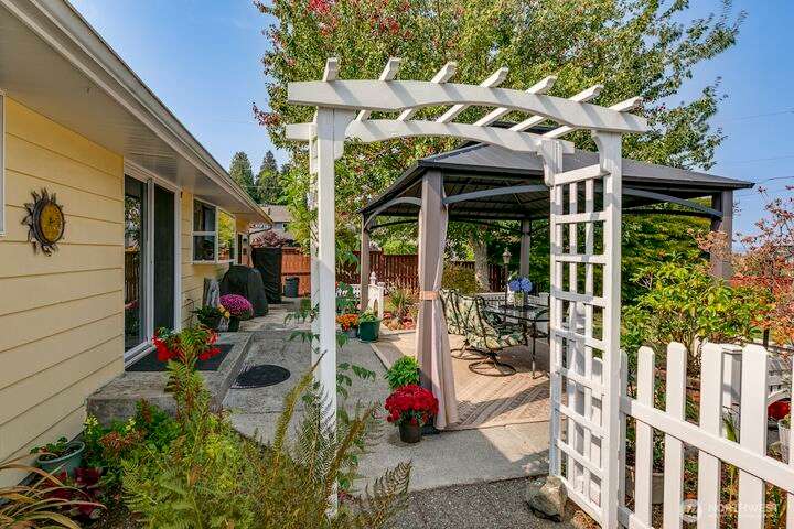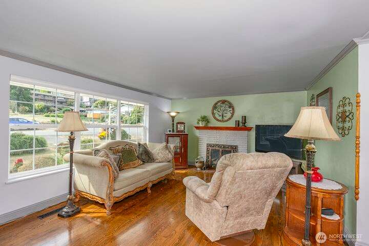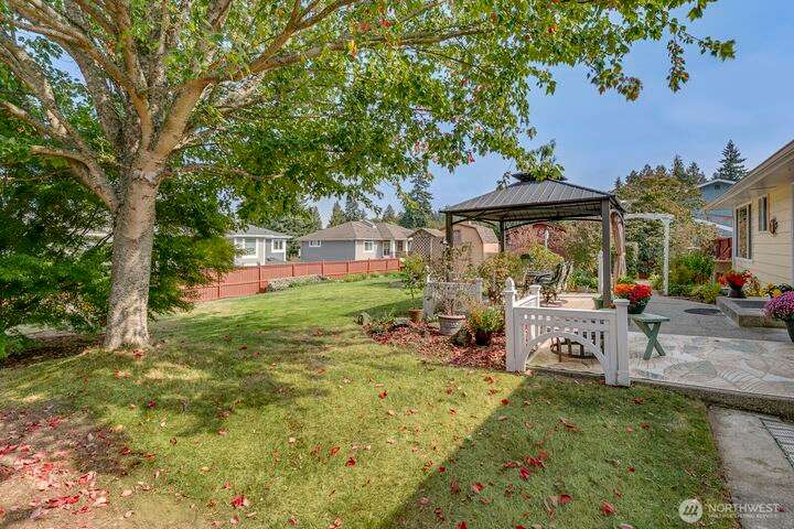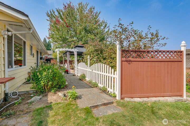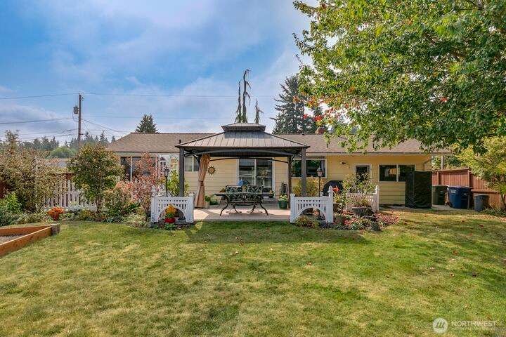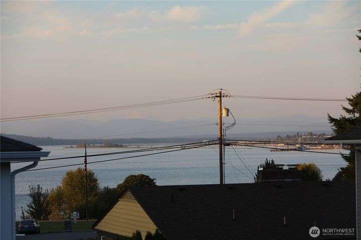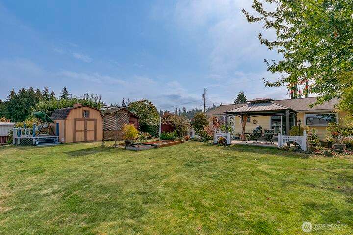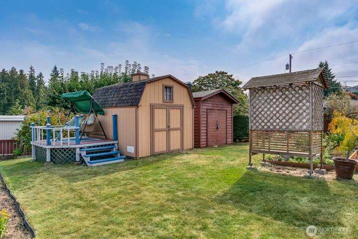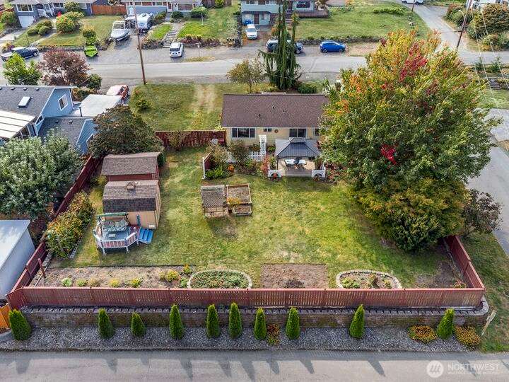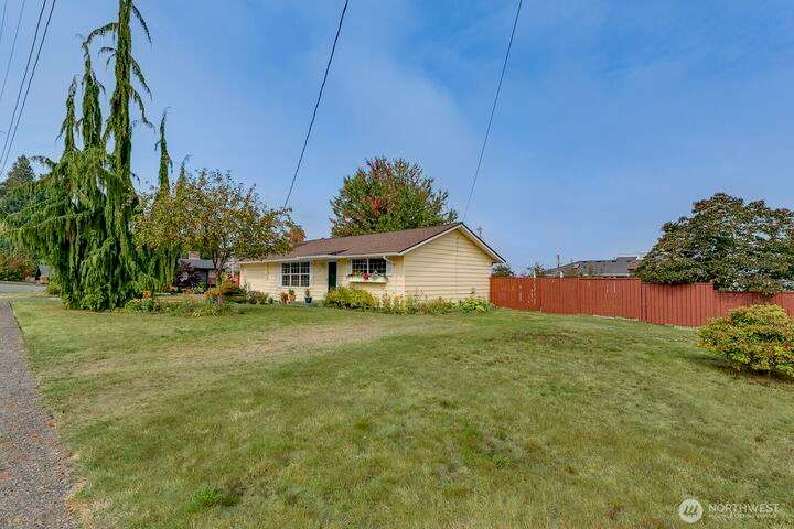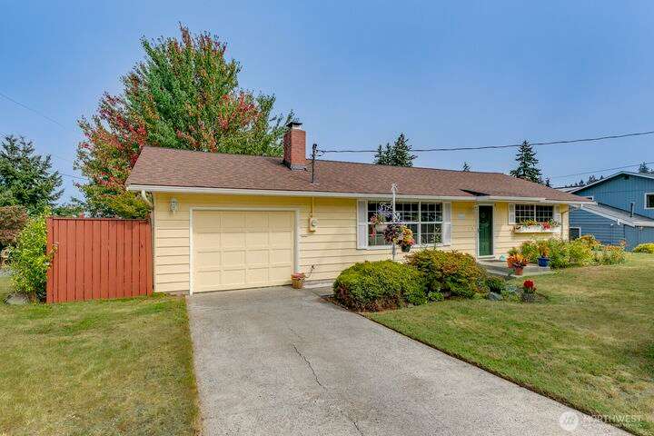 Fantastic opportunity off of Mukilteo Blvd (by Harborview Park)! This one-story home sits on a large level lot (.28 acres) that features a covered patio, two sheds, and some views of Puget Sound, the Olympic Mountains, and city fireworks! This quaint rambler offers two bedrooms, a full bathroom, gorgeous hardwood floors, a gas fireplace in the living room, and a kitchen with huge garden window that looks out over the expansive back yard. A great location - equidistant from Everett's exciting Waterfront Place and old-town Mukilteo's restaurants and beach. The garage has been partially finished and is great for an office or second TV room. Extra storage and RV parking. Don't miss out on this home!