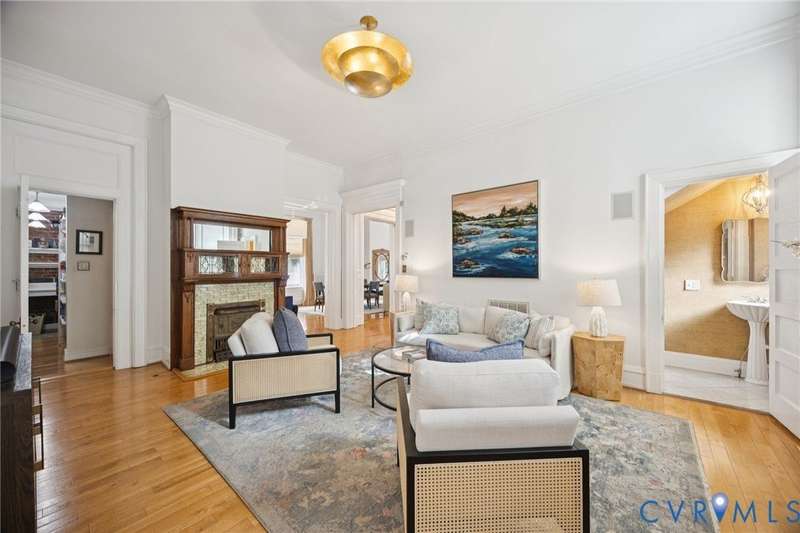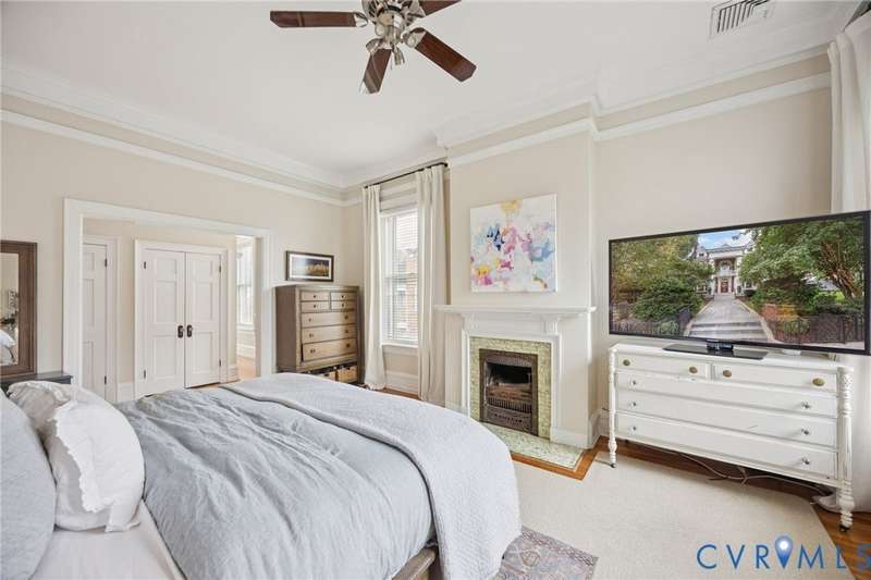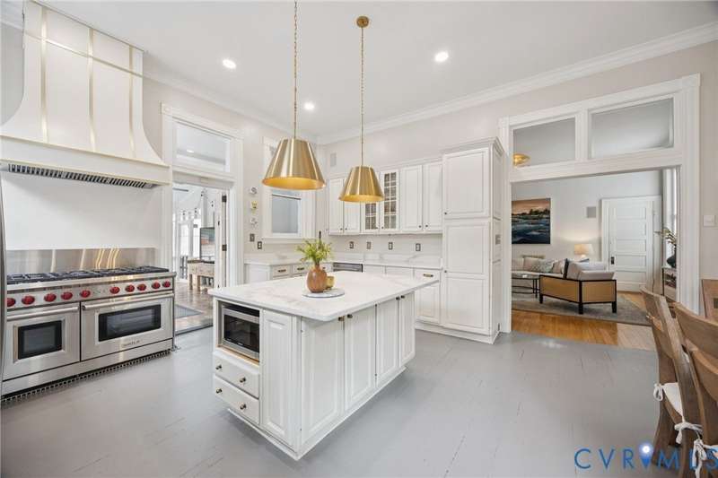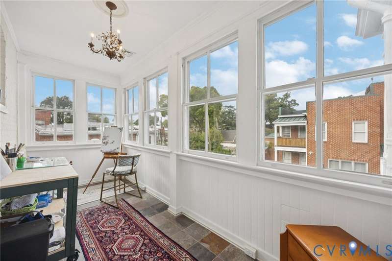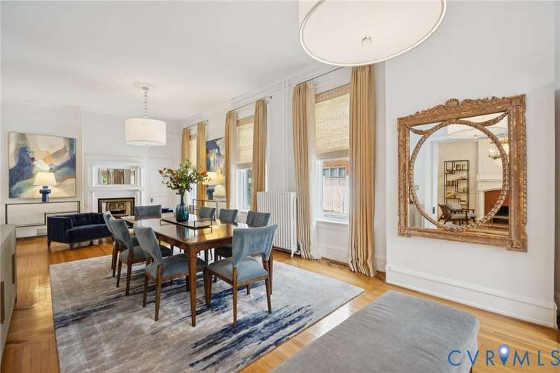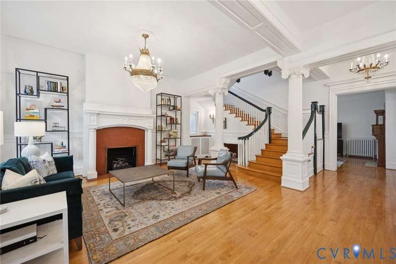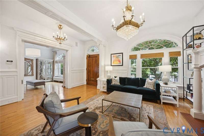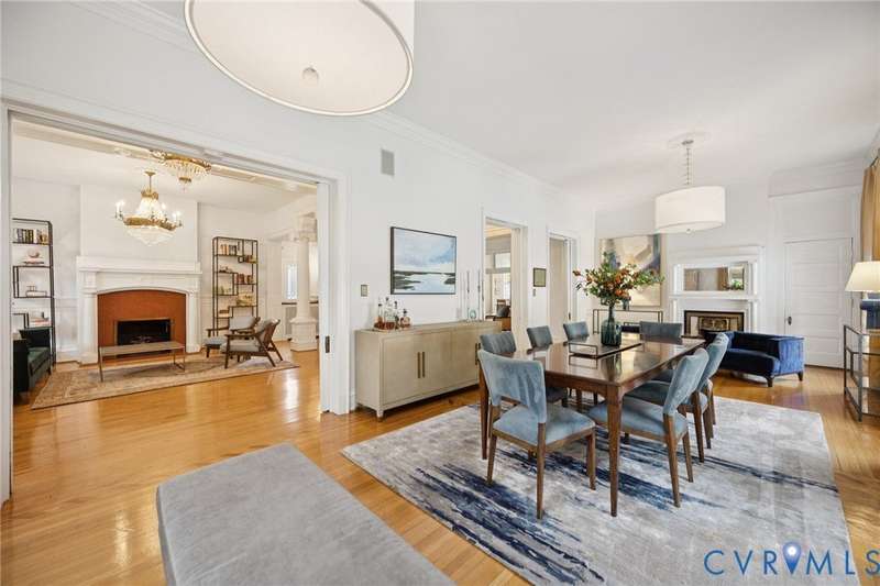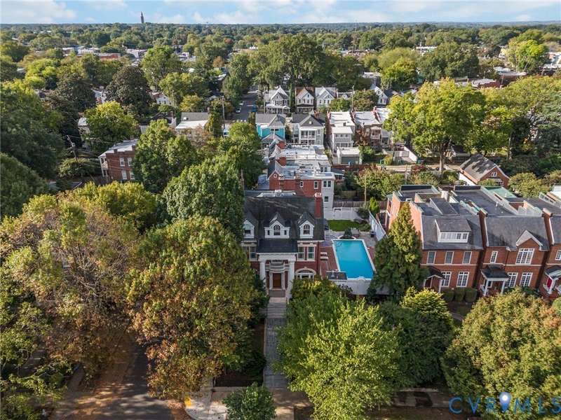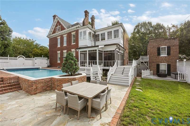 This stunning Wiley Anderson-designed Classic Revival historic home blends timeless architecture with luxurious modern updates, offering graciously scaled rooms, stately columns and exquisite millwork throughout. A grand entry and center hall welcome you into oversized formal and informal living spaces, ideal for elegant entertaining and casual living. The spacious family room opens to a large, updated eat-in kitchen featuring quartz countertops, a center island, stainless appliances, Wolf range with professional hood and a spacious breakfast area. The kitchen opens to an expansive screened porch overlooking a private yard with an in-ground Gunite pool with retractable safety cover. Upstairs, the grand staircase leads to a luxurious primary suite with a walk-in closet and an updated bath with double vanity. Three additional bedrooms with large closets, two renovated full baths, a laundry room and a sun-filled studio or office complete the second level. The third floor boasts a fifth bedroom, full bath and a bright, airy rec room with tall ceilings. A detached guest or carriage house offers a separate retreat with its own bedroom, bathroom, kitchenette and living room. Set on a beautifully manicured lot with mature landscaping, the property includes two separate flat green lawns ideal for play or garden space and offers potential for off-street parking accessed via a private alley. Enjoy the walkability to the VMFA, Carytown and numerous great restaurants and coffee shops. A rare opportunity to own an architecturally significant home that effortlessly combines classic elegance with everyday comfort.