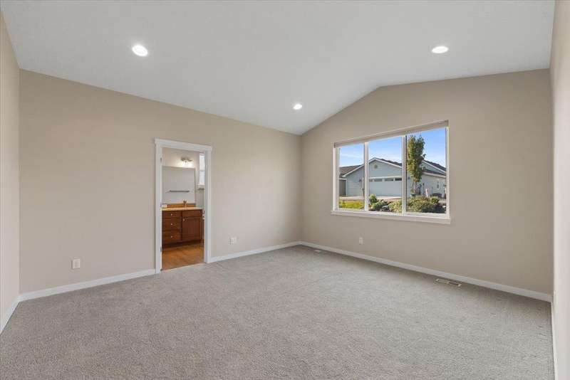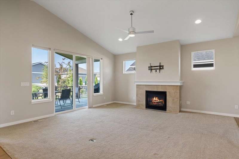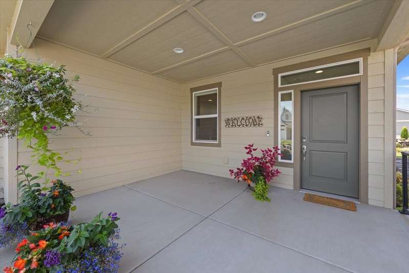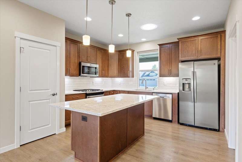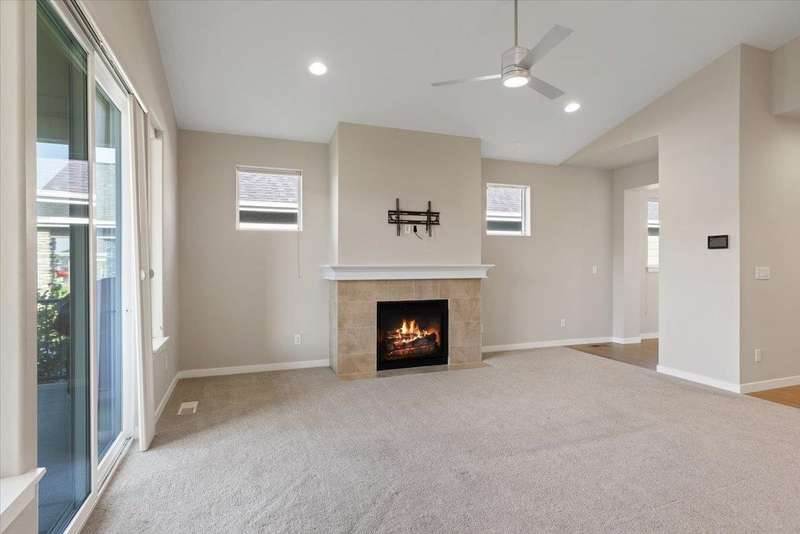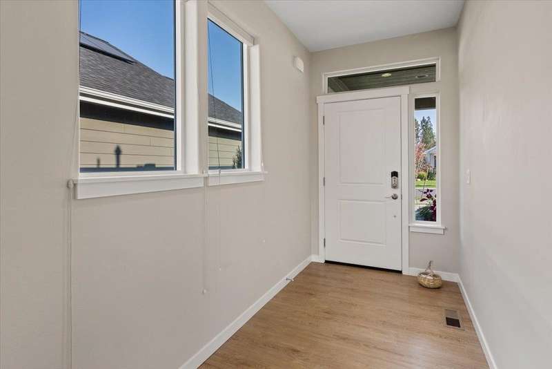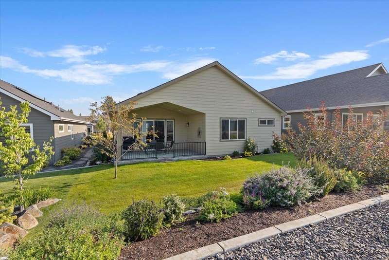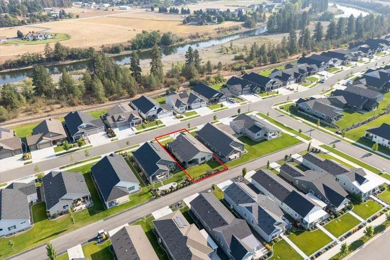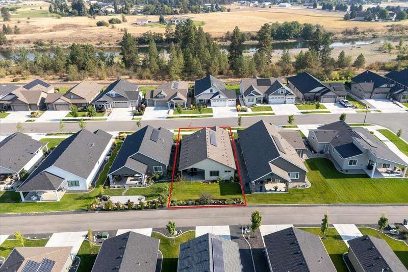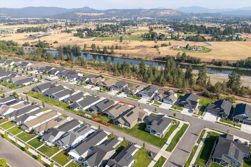 Why wait to build? Enjoy this nearly new Springfield rancher on a premium lot in the Trutina 55+ Community at Liberty Lake. The open layout features numerous upgrades including quartz countertops, upgraded cabinetry and plumbing fixtures, gas range, Solatube for extra light in kitchen, additional windows in garage and luxury vinyl plank flooring for easy care. The great room's gas fireplace creates a warm gathering space, while the primary suite offers a private retreat with a fully tiled mud-set shower, dual vanity, and generous closet. Enjoy morning coffee on the covered patio overlooking the beautifully landscaped yard. Solar panels add to the energy efficiency of this low maintenance home. Residents of Trutina enjoy access to a vibrant community lodge, an indoor saltwater pool, hot tub, fitness center, movie room, community kitchen, gathering spaces, pickleball, gardens, and a covered patio with river and trail views.