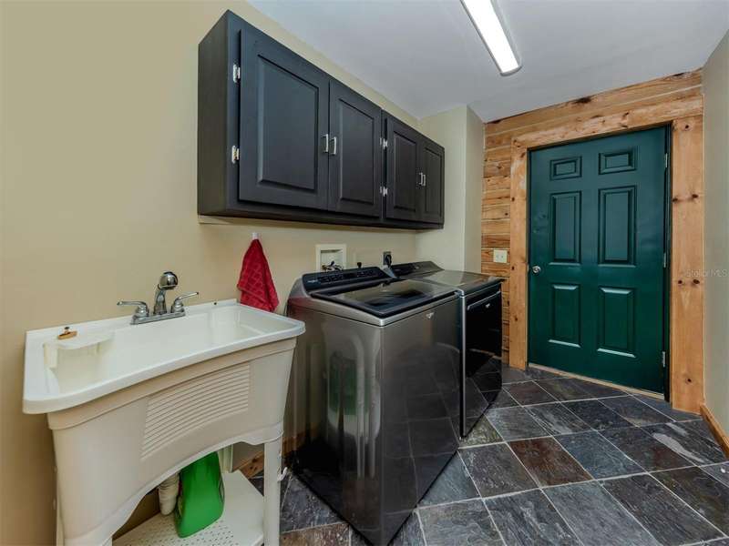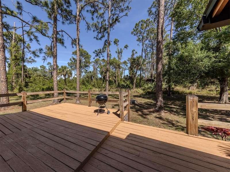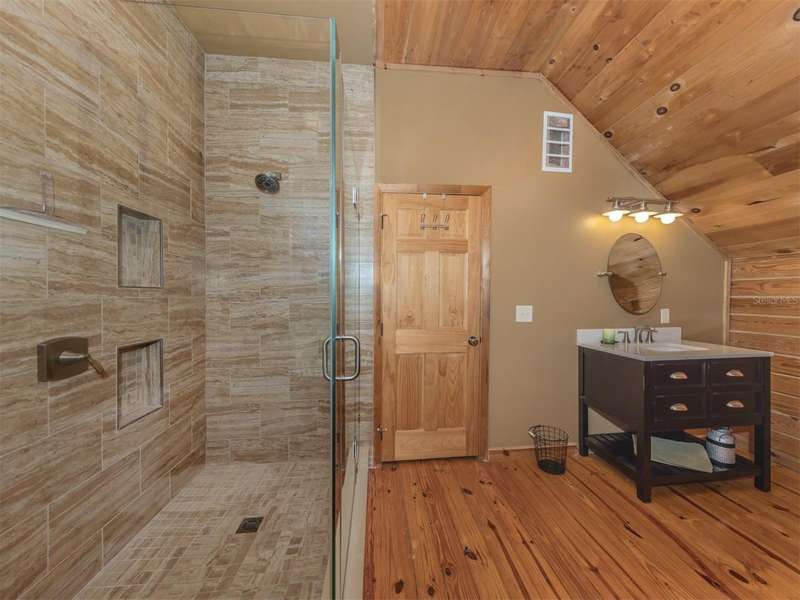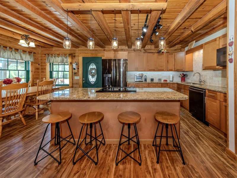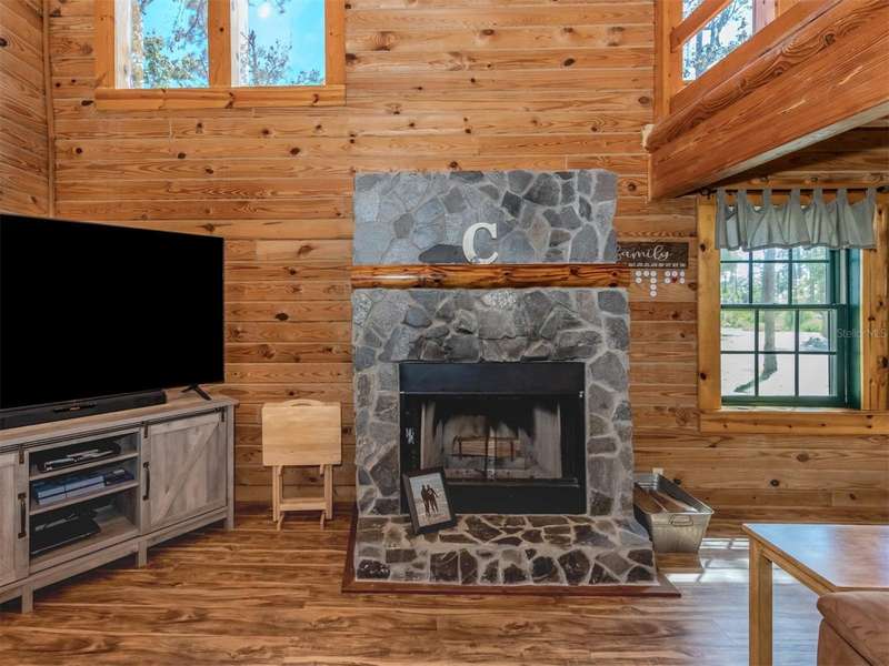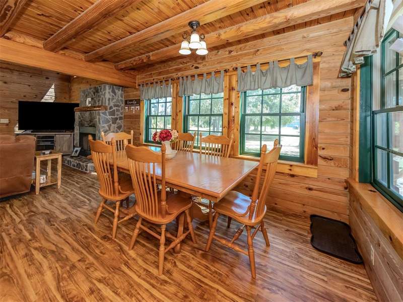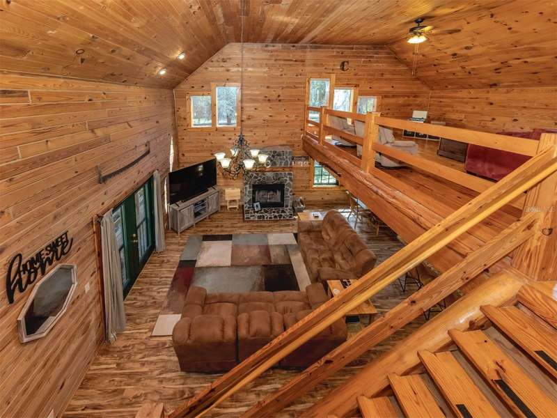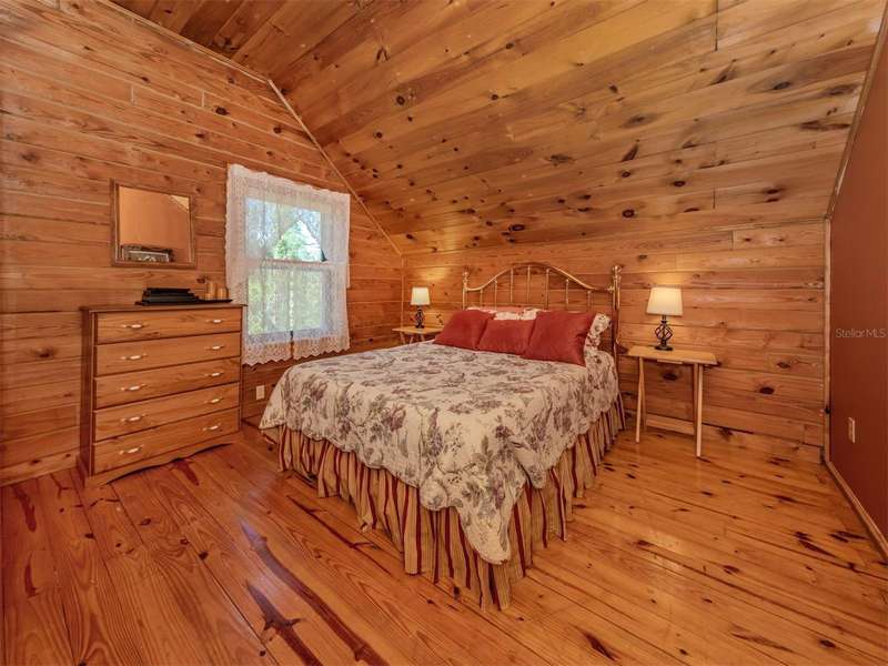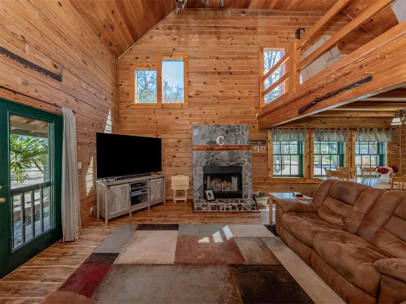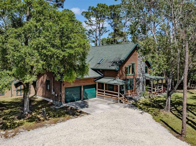 Here is the high quality, custom log home that most have only dreamed of, nestled on natural 3+ acres site. The first impression from the street takes you back to quaint, simpler times but once inside, it totally lives in the modern world with gleaming newer appliances and up-to-date conveniences throughout. The kitchen, dining and great room are one welcoming open space, featuring 2-story-high ceiling and impressive woodburning stone fireplace. The knotty pine stairway leads to a 22 by 13 ft loft adding perfect extra living space and a skylight high above under the soaring wood-clad ceilings. There are 2 good sized bedrooms and baths, one on the main level and the other upstairs. Enjoy the spacious wood decking just outside, offering even more areas for fun. There are 2 detached buildings for storage, a workshop...or maybe even a conversion to a hobby spot. While the grounds near the house are like a big happy yard, much of the 3+ acres is natural-growth Florida foliage creating a live buffer of privacy on 3 sides of the property.