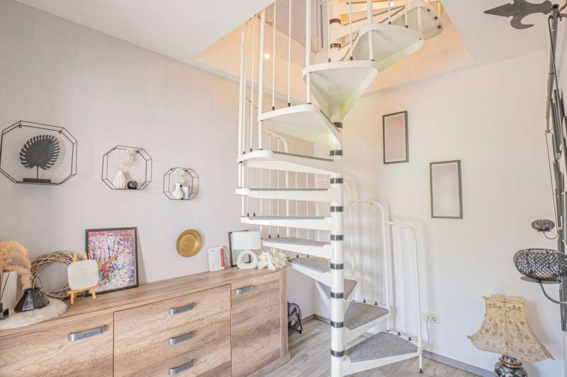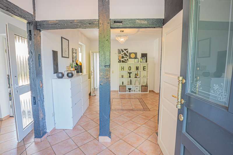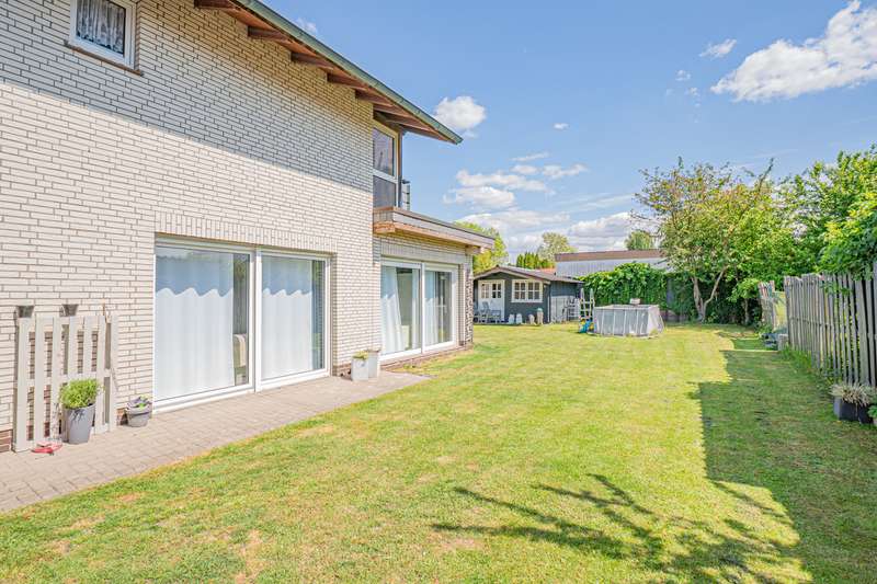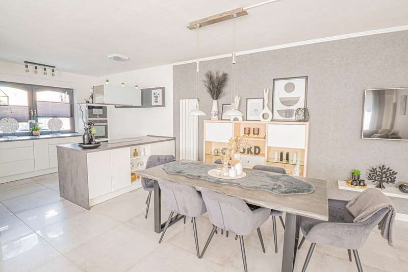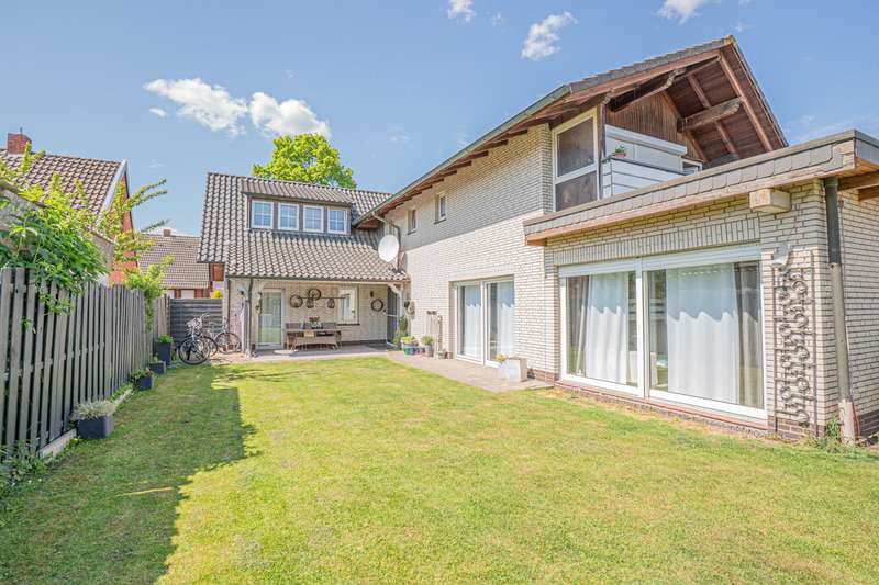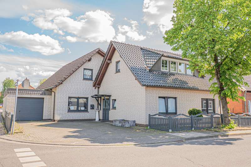 This spacious two-family house is situated in an extremely central location in Quakenbrück and impresses with a total of approx. 227 m² of living space on a plot of approx. 564 m². Originally built in 1930 as a detached house, the property was completely renovated in 1991 and extended into a two-family house in the process. Today, the property offers a wide range of possible uses and sufficient space for families or investors looking for an attractive rental option. On the first floor, you will find a spacious, open-plan living, dining and cooking area, which impresses with its brightness and friendly atmosphere. The first floor is complemented by two good-sized bedrooms, a bathroom with bathtub, shower and double washbasin, a guest WC and a utility room with direct access to the garage. A beautiful spiral staircase takes you to the top floor, where you will find the spacious master bedroom with a walk-in closet. The separate granny apartment is accessible via its own external staircase and offers a complete living solution with a living and dining room, bedroom, separate kitchen and a bathroom. The ideally oriented garden area is fully fenced and equipped with a practical garden shed as well as a covered terrace that invites you to relax and linger. The property has also been continuously modernized, with the last comprehensive measures completed in 2023 (including the renewal of the heating system). The central location and spacious areas in particular make this an attractive property for a wide range of requirements. If we have aroused your interest, we look forward to hearing from you!