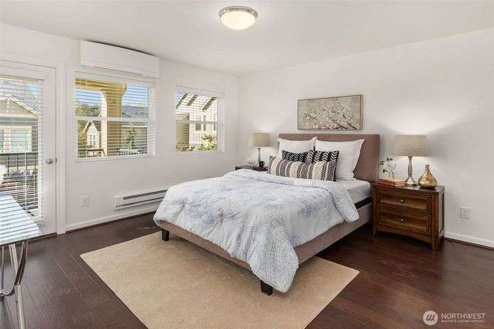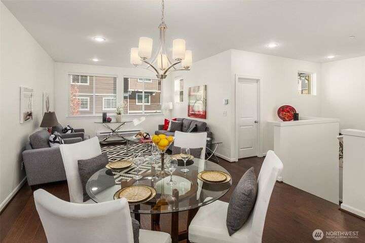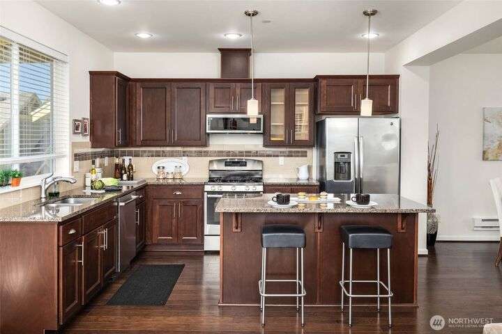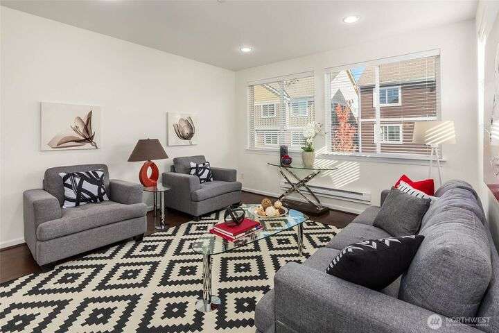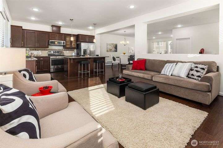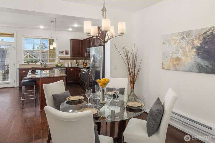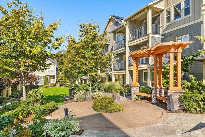 Exceptionally crafted end-unit townhome in the coveted View Ridge community! The expansive island kitchen is a standout, featuring slab granite countertops, stainless steel appliances, & abundant cabinetry ideal for both everyday living and effortless entertaining. A gas fireplace adds warmth to the open concept living area, bathed in natural light and seamlessly extends to a private deck and patio overlooking the beautifully landscaped courtyard. Luxurious primary suite boasts serene views, a spacious walk-in closet, & a spa-inspired ensuite bath. Additional highlights include A/C, two-car garage w/ Level 2 charger, nationally recognized schools & neighborhood transit access to Microsoft & Meta + Park & Ride express to Bellevue & Seattle!