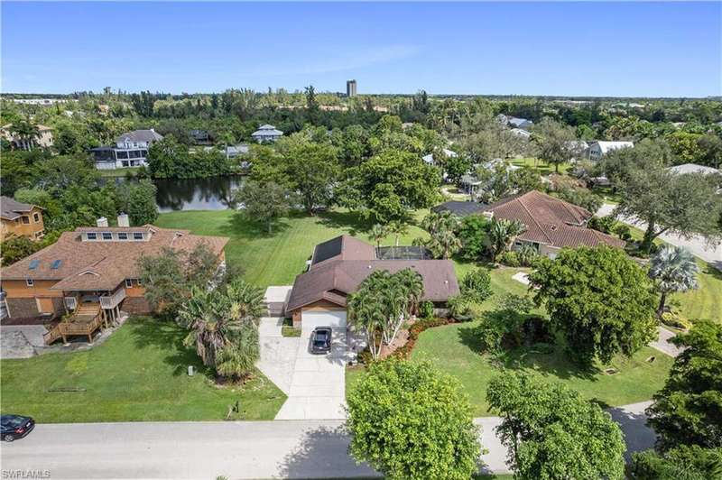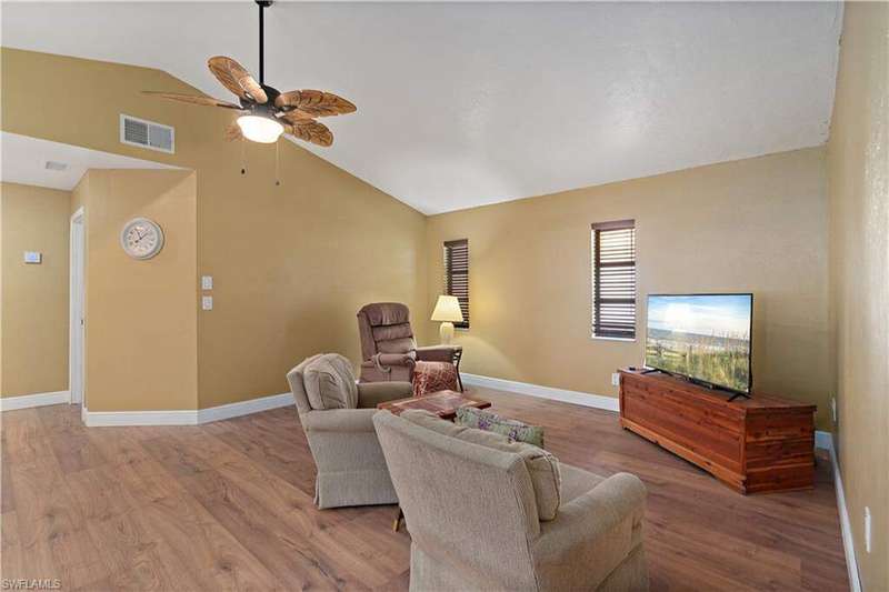 Beautifully maintained lakefront home with breathtaking water views, perfectly situated on nearly half an acre in the sought-after Gulf-access community of Hendry Creek. Thoughtfully updated, this residence is West of US-41 and offers a new roof (2018), HVAC (2018), water heater (2022), appliances (2022), and oak-style flooring (2022). Spanning 1,930 sq. ft. under air, this home features 3 bedrooms plus a den, 2 bathrooms, a 2-car garage, and soaring vaulted ceilings. Step outside to your oversized screened lanai with a pool, rock waterfall feature, covered lounging space, convenient pool bath, and sweeping water views. Beyond the lanai, an expansive backyard provides ample room for pets, recreation, or simply enjoying the tranquil natural setting. The spacious primary suite includes private lanai access and an en-suite bath with dual vanities and a frameless glass shower enclosure. Hendry Creek is a hidden gem, offering Gulf-access, rare, oversized lots, low HOA fees, lush scenery, and unmatched privacy. Community amenities include a boat slips, fishing docks, and tennis courts just a few doors down from this residence. Located just minutes from US-41, Coconut Point, world-class dining, pristine beaches, and RSW Airport.