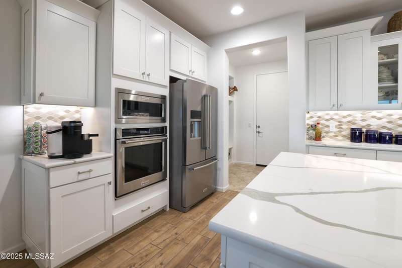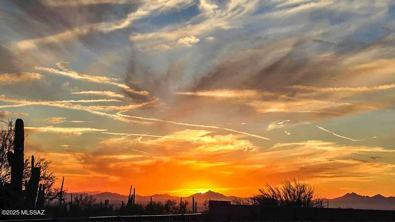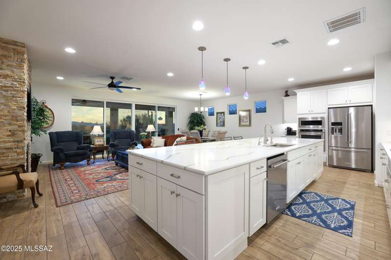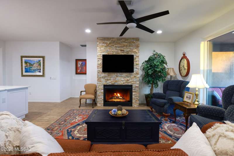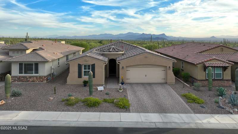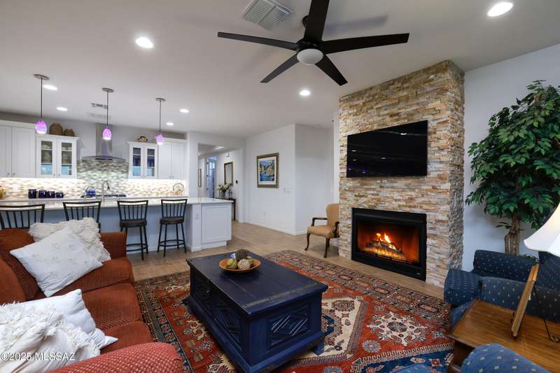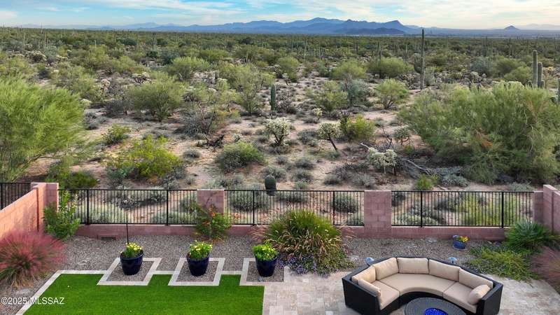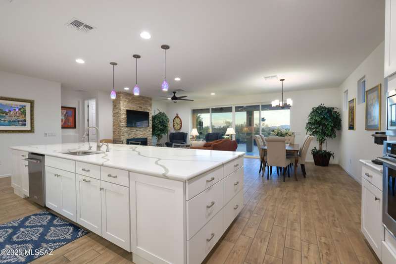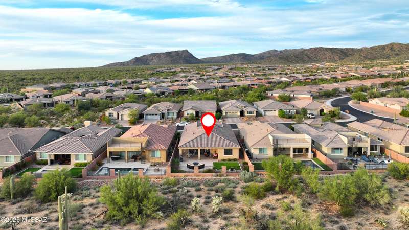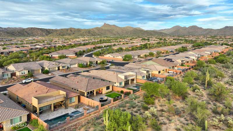 Views Views Views! Perfectly positioned against the open desert of the Tortolita Preserve, this beautifully appointed Dove Mountain residence blends modern sophistication with timeless comfort. Every detail--from the elegant fireplace to the stunning quartz finishes--has been carefully selected for effortless living.The open-concept layout is filled with natural light, anchored by a warm great room with a striking stacked-stone, floor-to-ceiling fireplace, and enhanced by porcelain tile flooring that flows seamlessly through every room. A 16-foot, four-panel sliding glass door opens to the patio, blending indoor and outdoor living while showcasing the beautiful desert and mountain views beyond. The chef's kitchen combines beauty and function with glass-front, upgraded cabinetry,