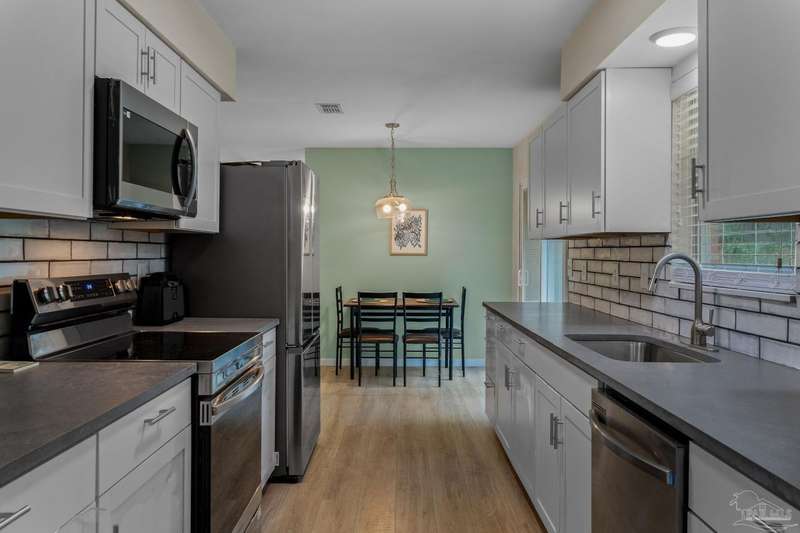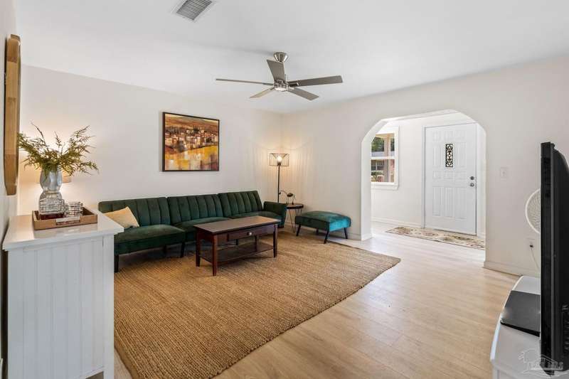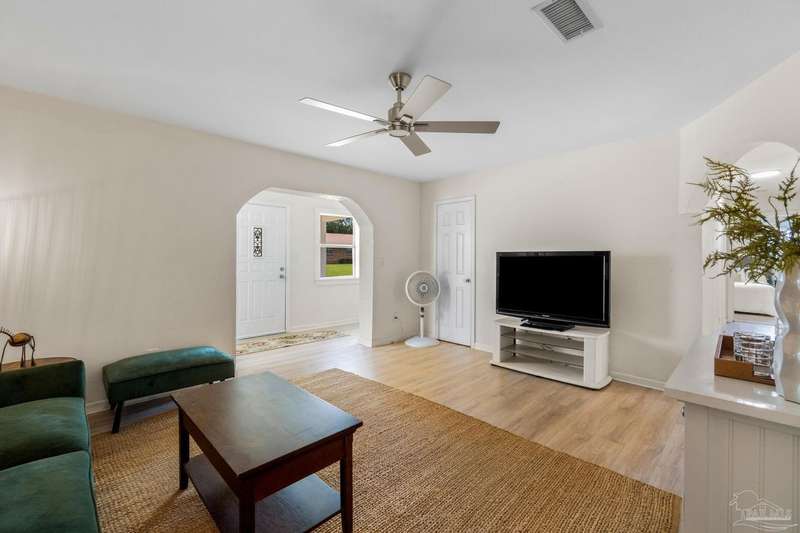 Welcome to this beautifully remodeled 3-bedroom, 2-bathroom home, designed for modern comfort and style. Step into a light and bright foyer that sets the tone for the inviting interior. Arch doorways add a touch of elegance, leading to spacious living areas. The galley kitchen boasts new cabinets paired with sleek, modern quartz countertops, and new stainless appliances, perfect for culinary enthusiasts. Enjoy the convenience of an indoor laundry room and the energy efficiency of newer windows throughout. New sliding doors open to a large backyard, ideal for outdoor entertainment or relaxation. The primary bedroom features an en suite bathroom, offering a private retreat. This home combines contemporary upgrades with timeless charm, ready for you to make it your own.