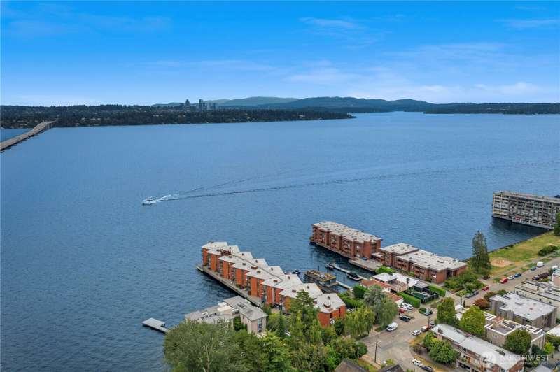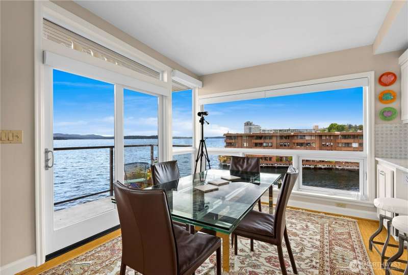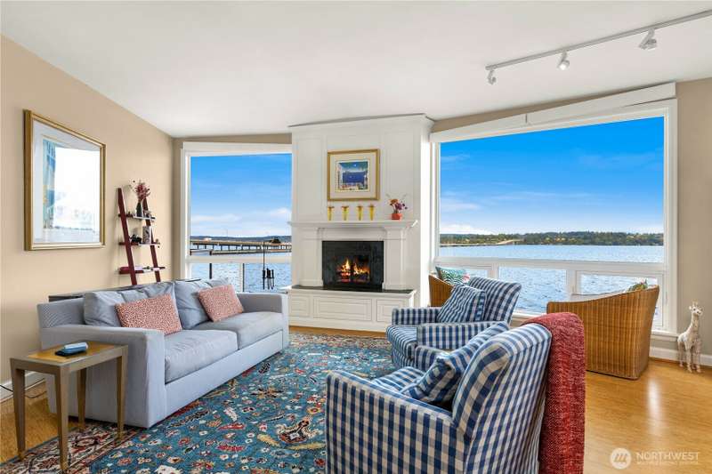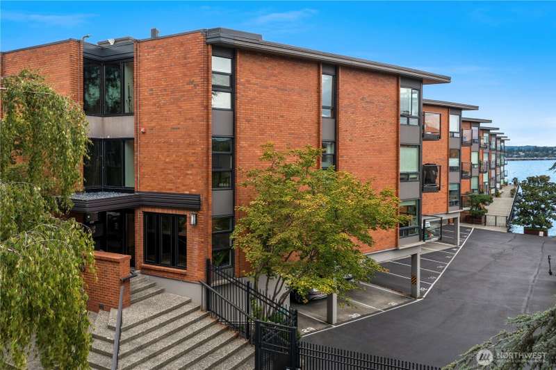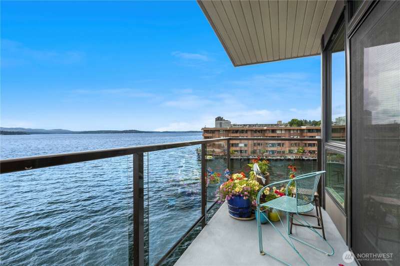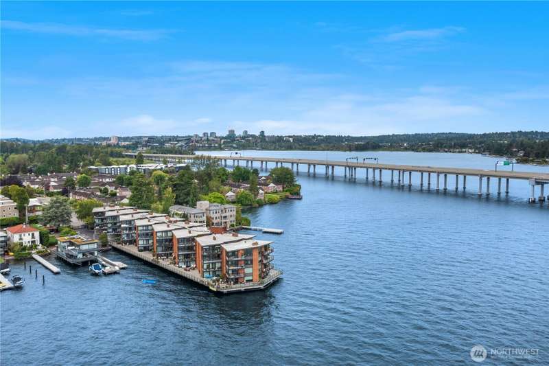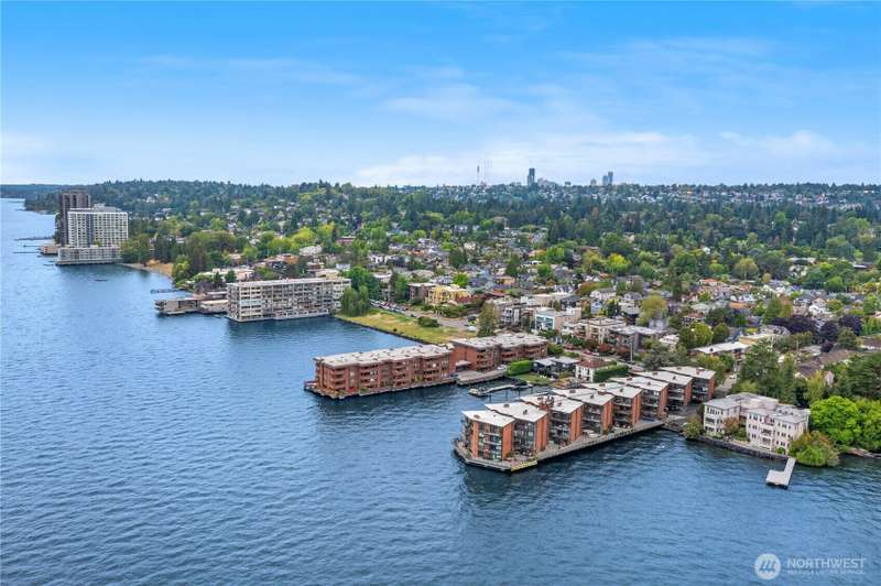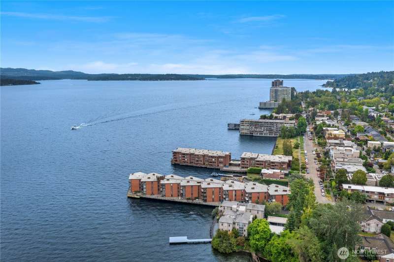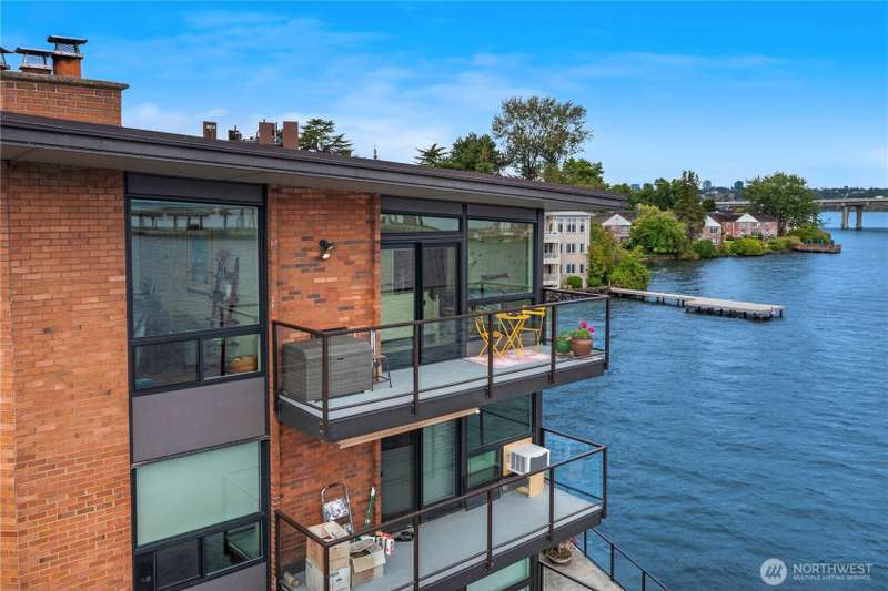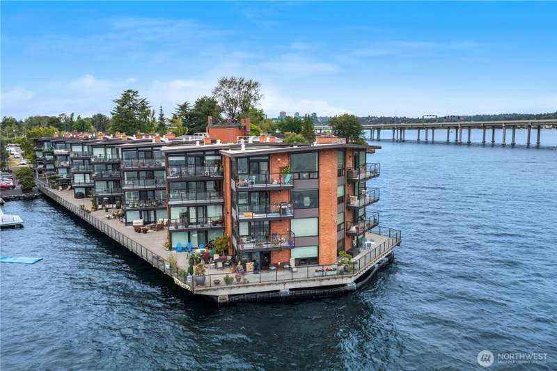 Stunning lakefront living in this exquisite Penthouse, end-unit condo perched above the serene waters of Lake Washington. You will feel as if you're floating over the lake, w/ 180-degree views that stretch from Mt. Rainier, the Cascades and the city of Bellevue. Floor-to-ceiling windows bathe every room in natural light, while the vaulted ceilings enhance the spaciousness of the living areas. The stunningly remodeled kitchen boasts marble countertops & new stainless steel appliances, perfect for the inner chef. Step outside to 2 spacious decks to savor the spectacular views. Enjoy 2 dedicated parking spots in a secure, gated parking lot. Enjoy a Community dock & a gym, making this a true sanctuary in the city. A short stroll to the Village.