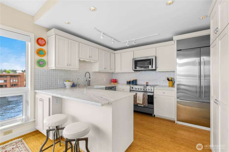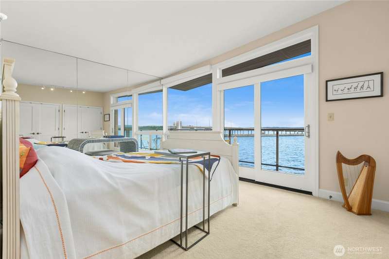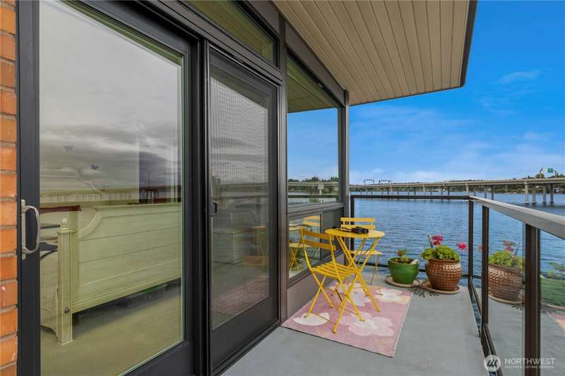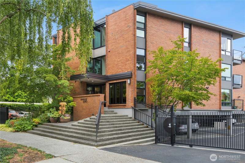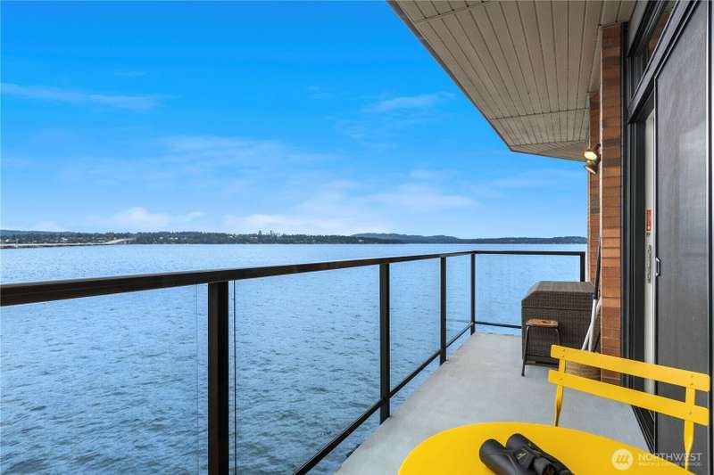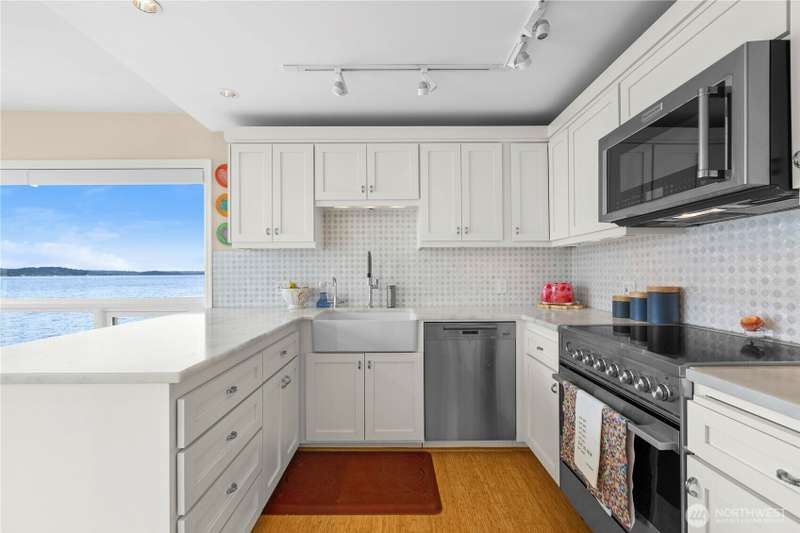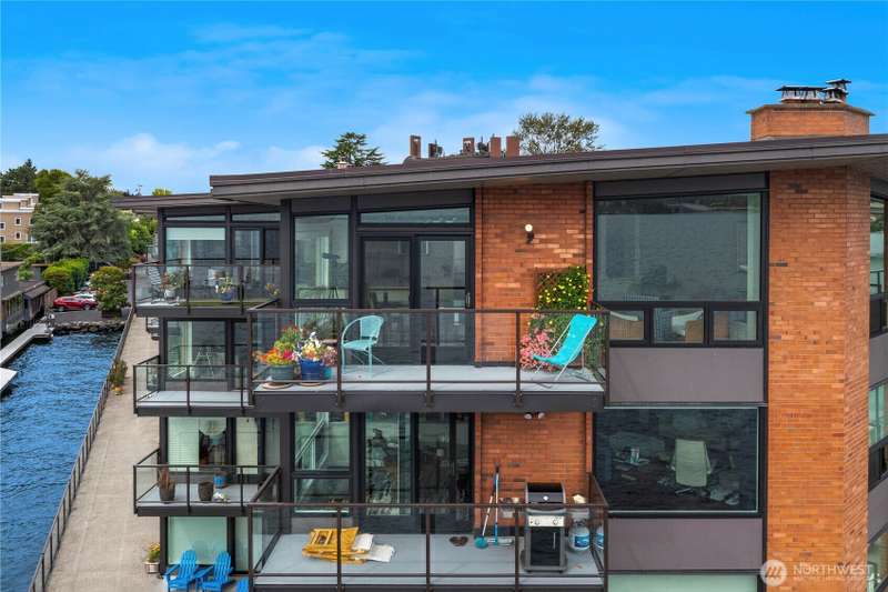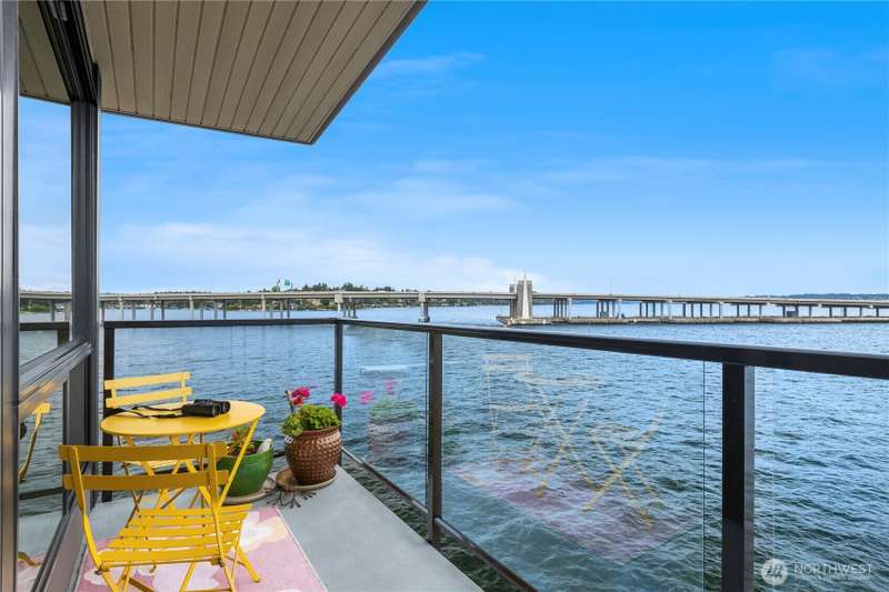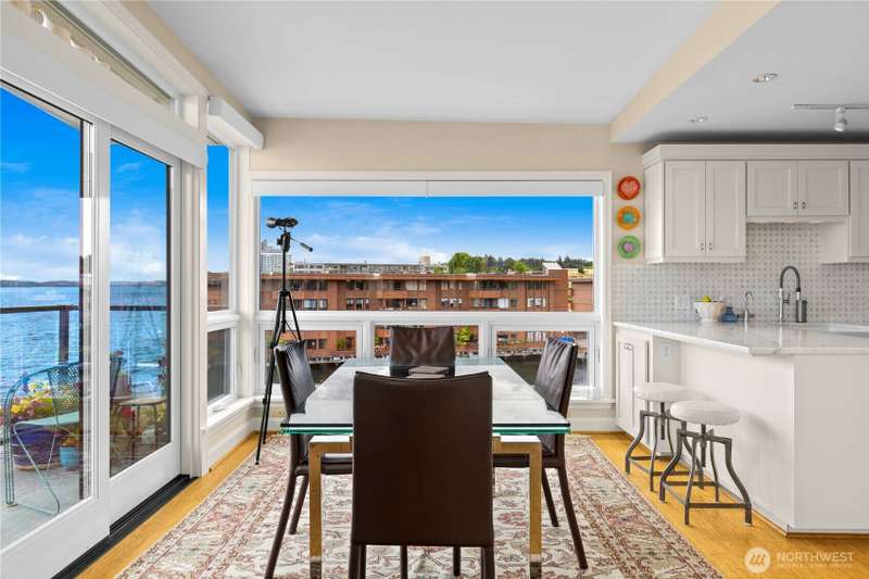 Stunning lakefront living in this exquisite Penthouse, end-unit condo perched above the serene waters of Lake Washington. You will feel as if you're floating over the lake, w/ 180-degree views that stretch from Mt. Rainier, the Cascades and the city of Bellevue. Floor-to-ceiling windows bathe every room in natural light, while the vaulted ceilings enhance the spaciousness of the living areas. The stunningly remodeled kitchen boasts marble countertops & new stainless steel appliances, perfect for the inner chef. Step outside to 2 spacious decks to savor the spectacular views. Enjoy 2 dedicated parking spots in a secure, gated parking lot. Enjoy a Community dock & a gym, making this a true sanctuary in the city. A short stroll to the Village.
