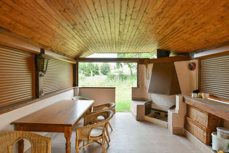 The beautiful 711 m2 garden features a mix of ornamental shrubs, mature fruit trees, and a privacy-enhancing hedge. A 12 m2 furnished summer terrace with a built-in fireplace and smokehouse creates the perfect setting for outdoor dining and entertaining.