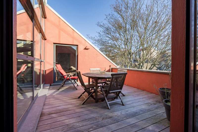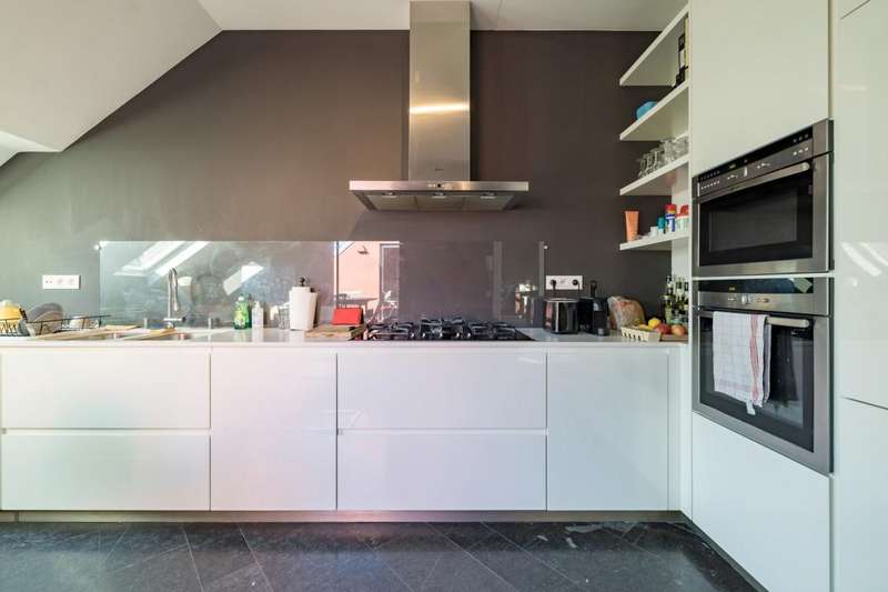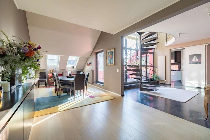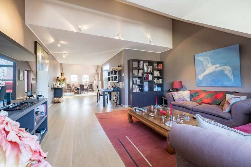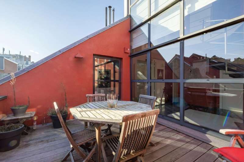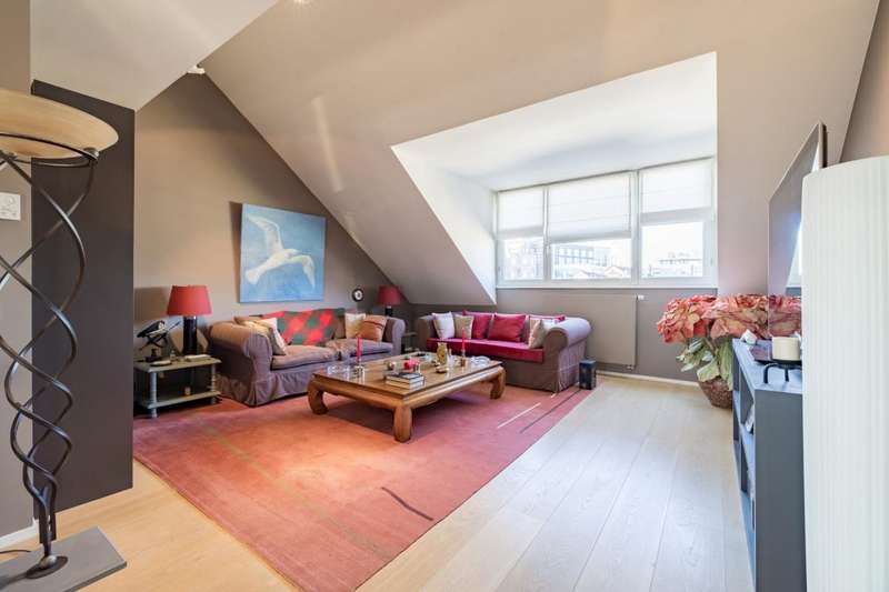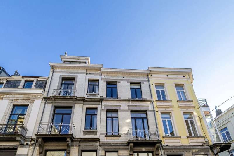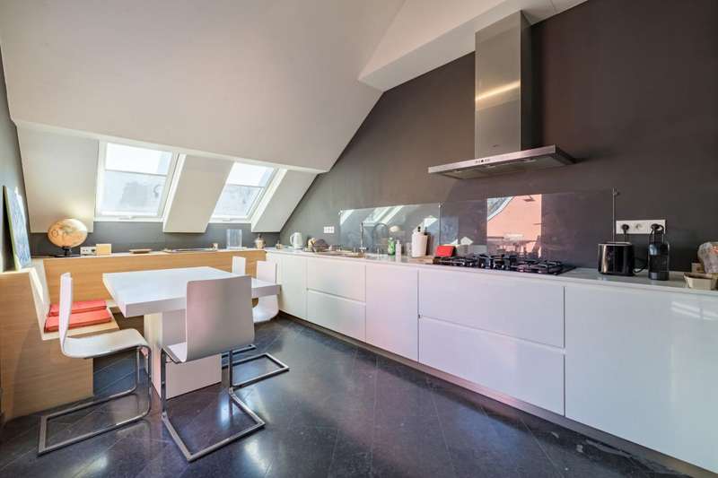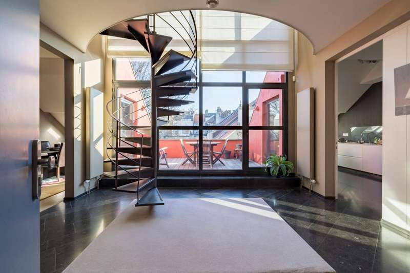 In a quiet street in the Louise district, very close to Place Stéphanie, magnificent duplex penthouse renovated by architect Joël Claisse, +/- 208 m² + +/- 14 m² terrace, on the 3rd and 4th floors of a beautiful manor house. Large reception room, fully equipped kitchen, 3 bedrooms including a large master suite, 2 bathrooms. 2 parking spaces. Cellar. EPC F (despite very good insulation).