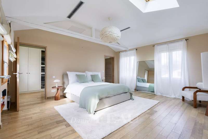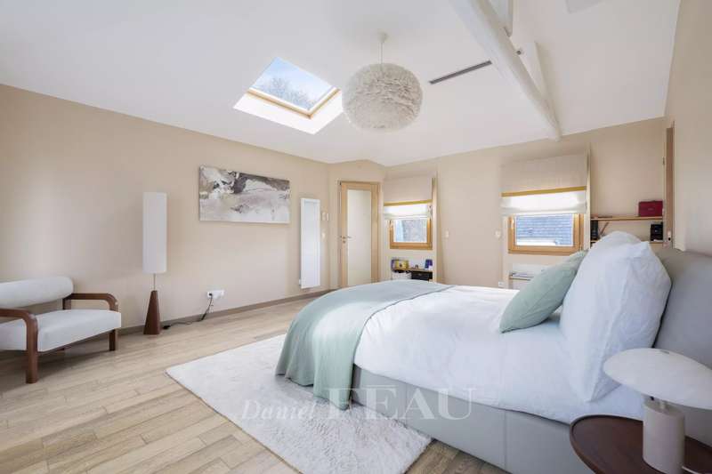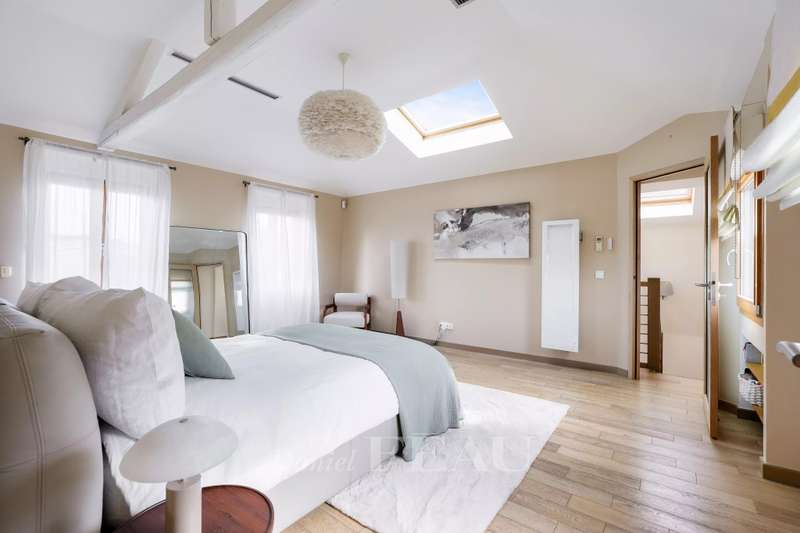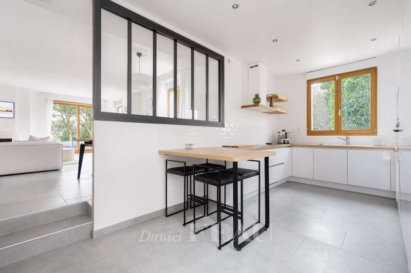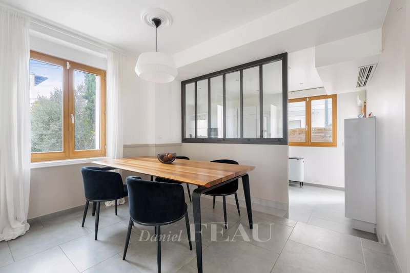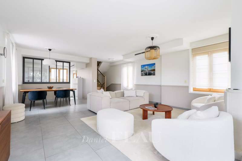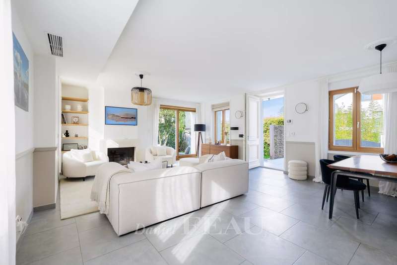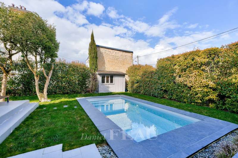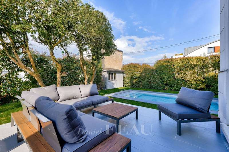 This beautifully appointed near 180 sqm late 19th century Mansart-style property is located at the bottom of a private no-through road under 10 minutes by foot from the town centre and near the schools. It includes a spacious living/reception room opening onto a south-west facing terrace and a landscaped garden with a swimming pool, and an equipped semi open-plan kitchen. Three bedrooms including a master suite with a bathroom and a dressing room, and a second bathroom are on the upper floors. A half-basement comprises a spacious family room, a guest bedroom with a shower room and dressing room, a utility room and a storage area. With parking space for two cars in the paved interior courtyard and for two more in the private alley. An ideal family home near the historic centre of Rueil-Malmaison a short distance west of the capital.