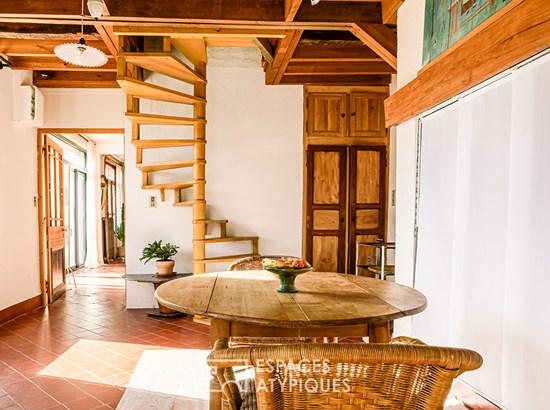 The building offers approximately 250 sqm of living space. Upon entering, the gaze is drawn to the English-style winding wooden staircase, a living sculpture around which the rooms are arranged. The cement tile floor leads to an office adorned with a trompe-l'oeil plant design and a marble fireplace, reminding us that this house is also an artist's studio. Further on, the living room and an elegant and welcoming dining room open wide onto the garden through large bay windows.