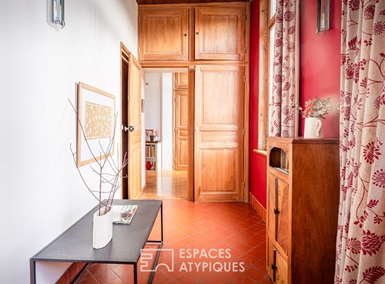The light gently glides over the antique woodwork, natural materials, and second-hand items. The kitchen, vaulted with red bricks, nestles like an alcove in one of the building's wings, blending authenticity and functionality, with its sleek furniture and direct access to the outdoors. On the sleeping side, five bedrooms with unique ambiances welcome family, friends, or passing visitors. Three bathrooms comfortably complete the spaces.