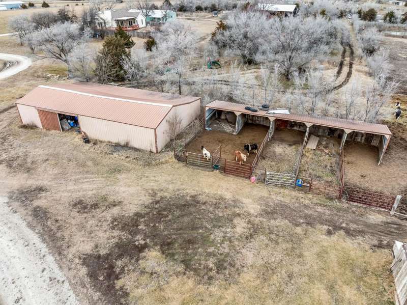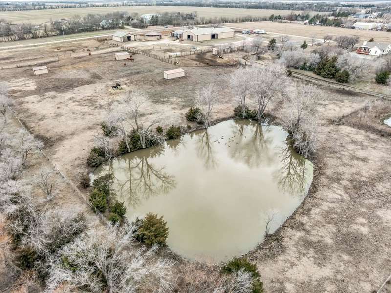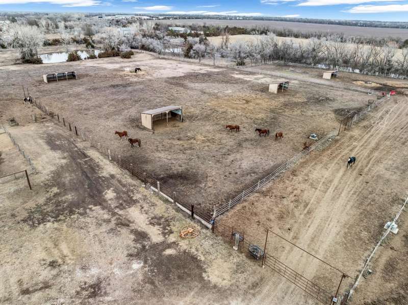 Premier 34.37 +/- acre equestrian estate in Southeast Wichita! This remarkable property features multiple stables, indoor and outdoor riding arenas, and expansive fenced pastures, making it a turnkey equestrian retreat. The main residence is a spacious 3-bedroom, 3-bath home with 2,897 +/- SF of finished living space. Designed for comfort and convenience, it includes a main-floor master suite, a wraparound deck, and an in-ground chlorine pool, providing the perfect setting for relaxation after a day with the horses. The equestrian facilities are top-tier, featuring a 132x42 main stable with 12 stalls, an office/apartment, two tack rooms, and a wash rack, all connected to an indoor riding arena(132x60). A secondary stable offers eight additional stalls and a tack room, while a 40 covered round pen and six-horse automatic walker ensure top-tier training options. The property also includes five fenced pastures, each with automatic waterers and individual horse shelters, as well as a 75x150 outdoor riding arena for events and training. Additional amenities include a 60x36 workshop with a studio apartment and garage space, a 60x40 hay barn, and a 61x24 Storage barn. The home runs on electric while a propane tank provides heat for the barn. There are two water wells and two lagoons that provide water and sewer services for the property.