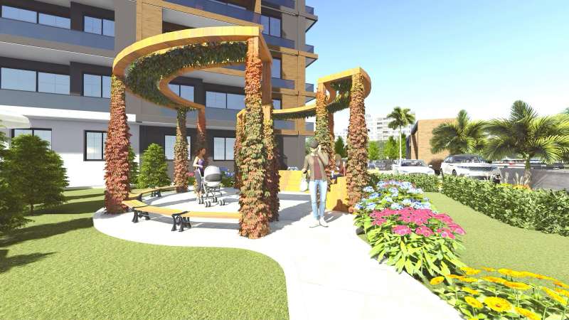 The apartment complex offers a single 11-storey block on its 3.370 m² total plots The complex offers an outdoor swimming pool, outdoor parking, playground, gazebo, barbeque area, Turkish bath, sauna, cinema, fitness, lift, generator, 24/7 security service, and security cameras.