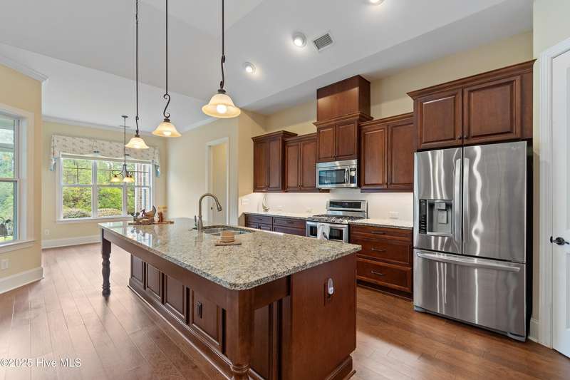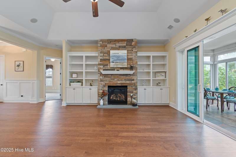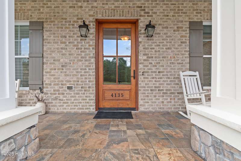 Welcome to 4135 Skeffington Court, a completely customized Shackleford Banks home by Hagood Homes, nestled in the heart of the gated St. James Plantation community. This exquisite 4-bedroom, 3-bathroom residence offers 2,737 square feet of thoughtfully designed living space and enjoys pristine water and nature views. Ideally located close to Players Clubhouse, pool, workout facility, and community garden, with easy access to the Regency Gate, this home combines luxury, convenience, and tranquility. The charming brick exterior, sideload garage, and oversized front porch exude timeless elegance. The beveled glass Mahogany front door offers an inviting entryway. Inside, custom wainscoting and crown molding welcome you into the foyer and formal dining room, where divider columns and rich Hickory wood floors create a seamless flow through the main living areas. The spacious great room features a sophisticated cove ceiling and a striking gas fireplace with stacked stone surround, flanked by built-ins designed for flexible TV placement. Ten-foot bi-directional sliding glass doors open to a serene sunroom with calming pond and nature views, while the backyard offers a spacious patio for grilling and outdoor dining, enhanced by a beautifully landscaped yard and stone retaining wall. The professionally maintained pond has a backdrop of protected green space, ensuring privacy and stunning vistas. The kitchen is a dream, featuring custom café wood cabinetry, stainless steel appliances including a dual fuel range with convection and grilling features, granite countertops, a large island with counter-height seating, and a walk-in pantry. A cozy breakfast nook completes the space. The private owner's suite offers peaceful pond views, rich wood flooring, and a spa-like en-suite bath with granite-topped dual-sink vanity, tiled walk-in shower with frosted glass, multiple shower heads, built-in seating, and a custom-organized walk-in closet. Two guest bedrooms with plush carpeting share a stylish hall bath, while a dedicated laundry room and garage entry enhance functionality. Upstairs, a spacious bonus room provides guest quarters or an ideal multi-generational living space, complete with a den, bedroom, full bath, and access to a floored attic. The two-car garage features durable epoxy flooring and a 10x12 conditioned workshopperfect for hobbies or extra storage. Built for safety and comfort, the home includes a whole-house surge protector, water filtration system, high-efficiency and Trane HVAC. Convenient access to a nearby gate for quick trips to Oak Island or local shopping. St. James Plantation is a private, gated, waterfront community boasting four golf courses, 81 holes right in your neighborhood, 4 distinct clubhouses, 3 fitness centers, tennis and pickleball courts, indoor and outdoor pools, a full-service Marina with 475 boat slips, The Apothecary of St. James full-service Pharmacy, Beacon 315 Restaurant and 2 parks. Nature enthusiasts will love the biking and walking trails that wind through scenic ponds and the Intracoastal Waterway. St. James has it all. Residents relax at the private beach club on Oak Island, with stunning views, pool, showers, picnic area, and private parking. Whether you like a peaceful retreat or an active lifestyle St. James Plantation has it all! Schedule your private tour today.