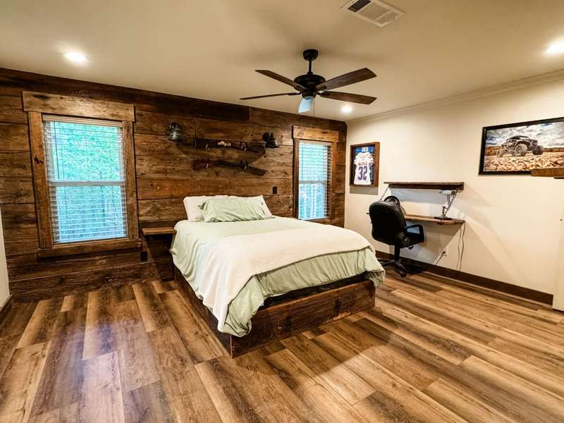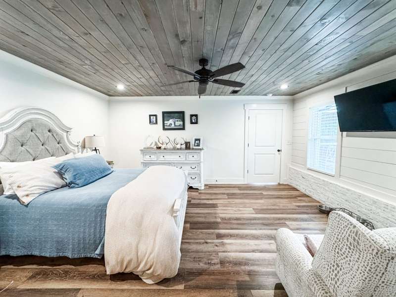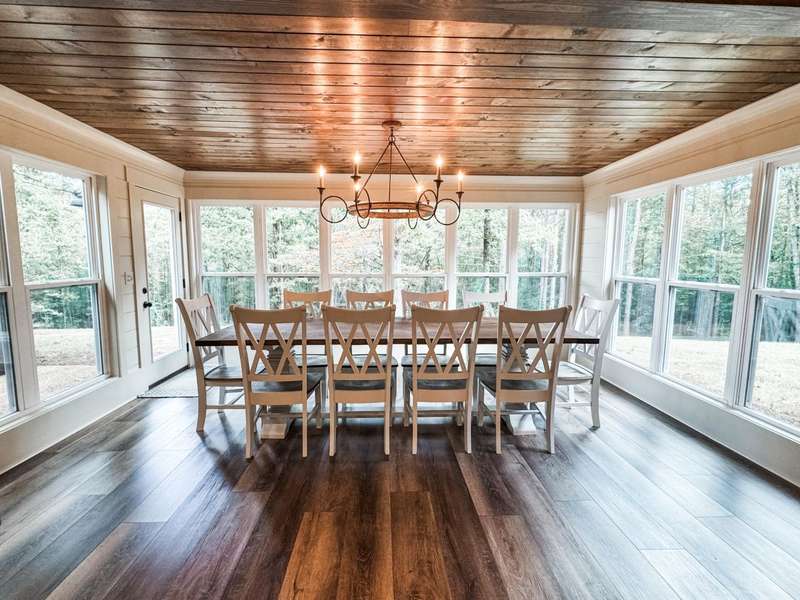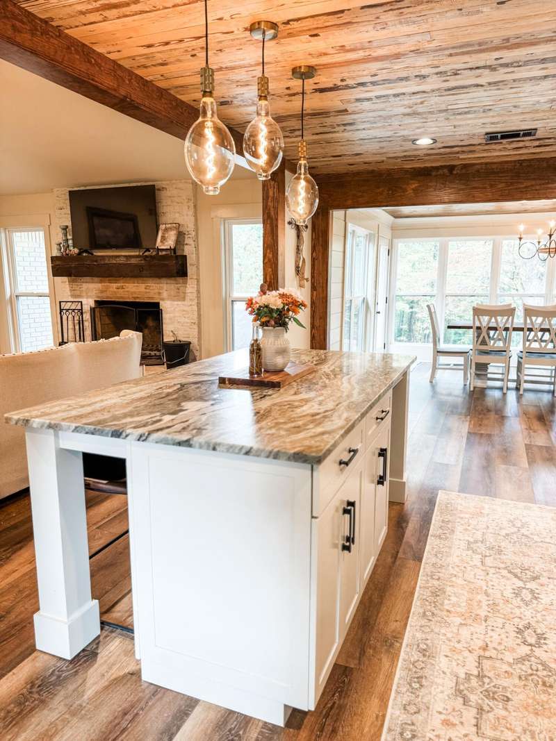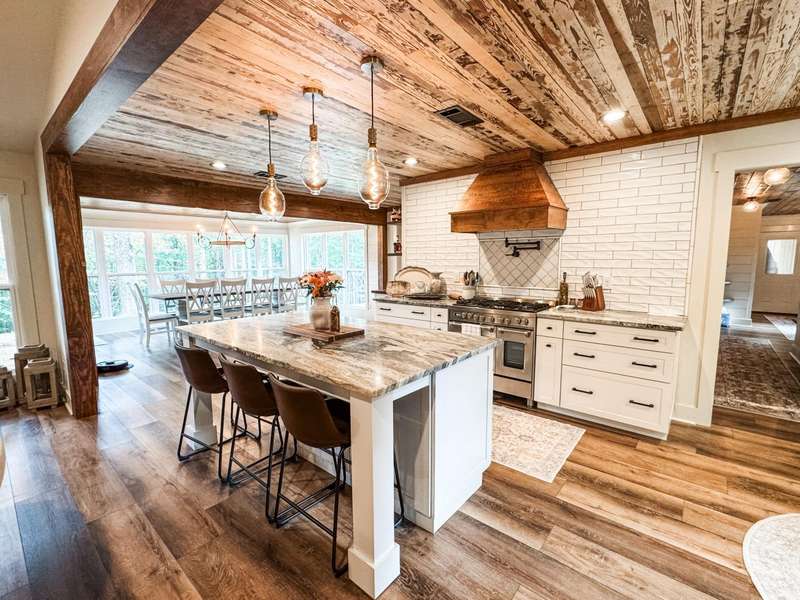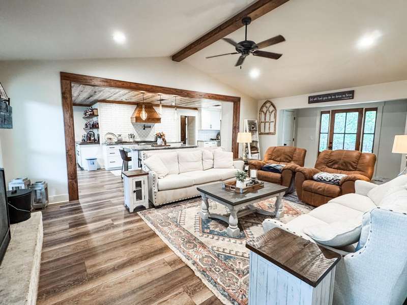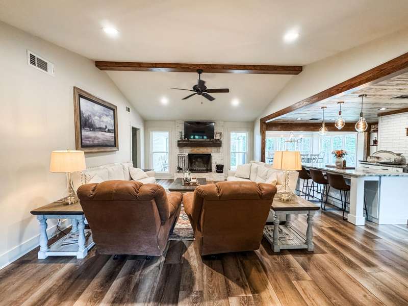 Every inch of this remarkable home has been transformed! This 4-bedroom, 3-bath showpiece was completely gutted and rebuilt from the studs up in 2020 leaving no detail untouched. From the new electrical, roof, HVAC, and windows to the custom cabinets, doors, lighting, and designer finishes, it's truly like new. Step inside and be captivated by the warm rustic-meets-modern design, where custom woodwork, exposed brick accents, and open-concept living spaces create a one-of-a-kind atmosphere. The massive kitchen, dining, and living area is an entertainer's dream featuring a wet bar, eat-at island, and cozy wood-burning fireplace perfect for gathering. Walls of windows bring the outdoors in, offering panoramic views of 12 private acres a serene landscape of rolling hills, woods, and