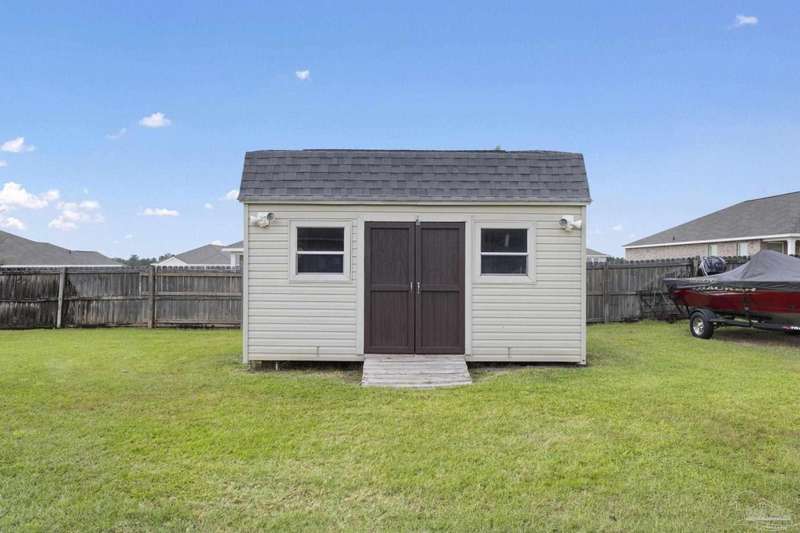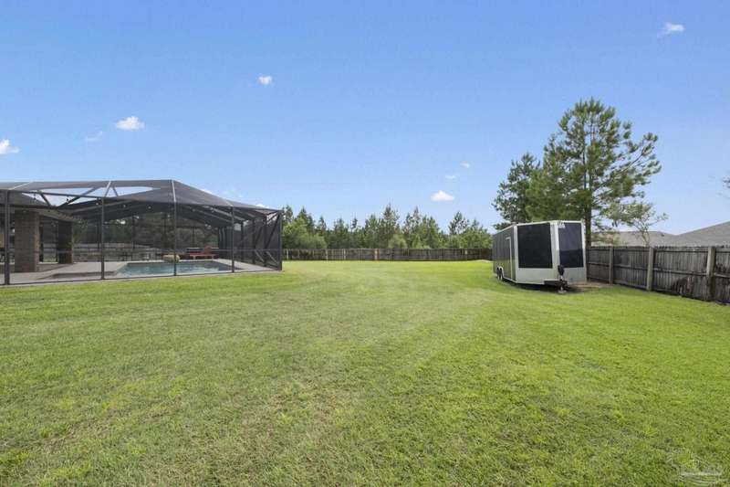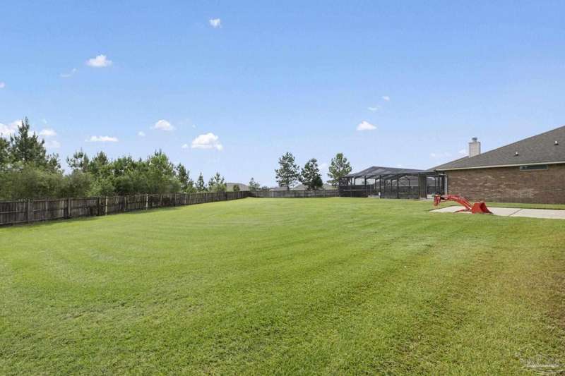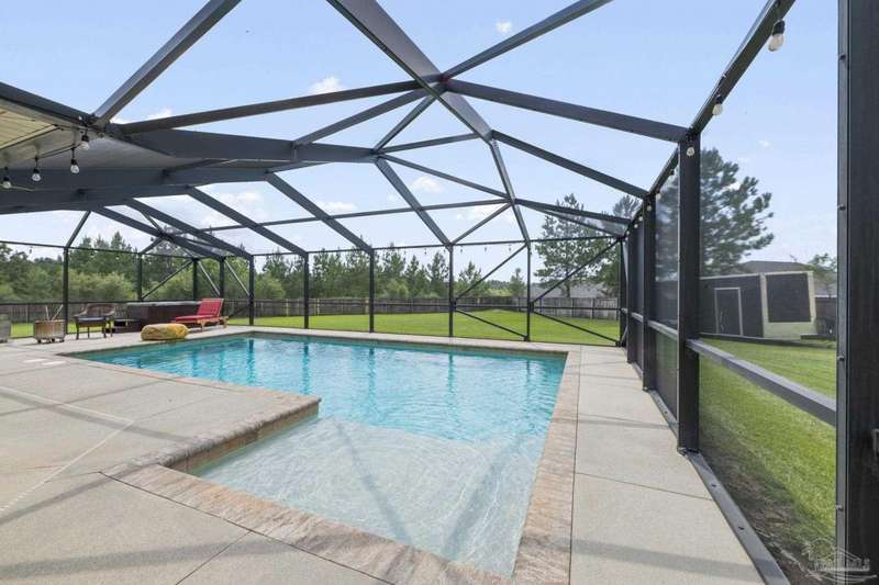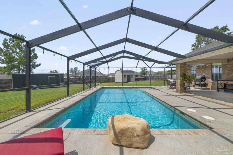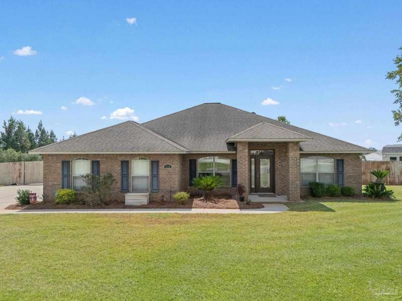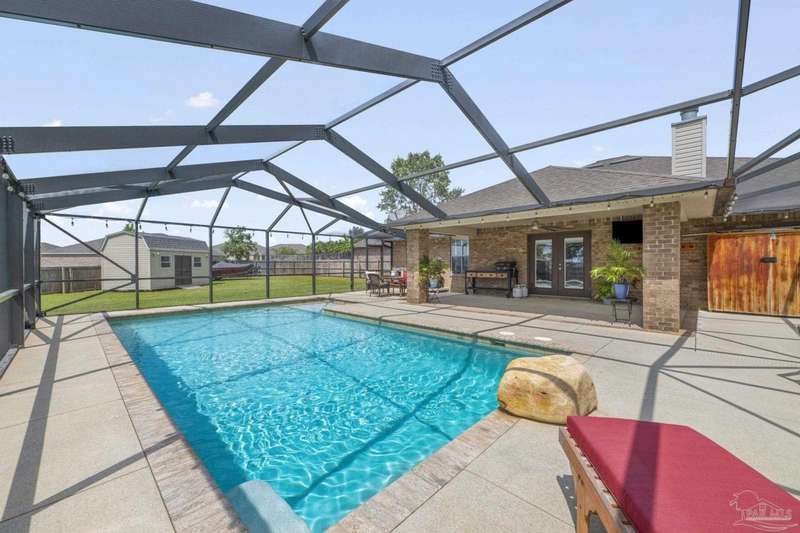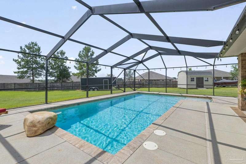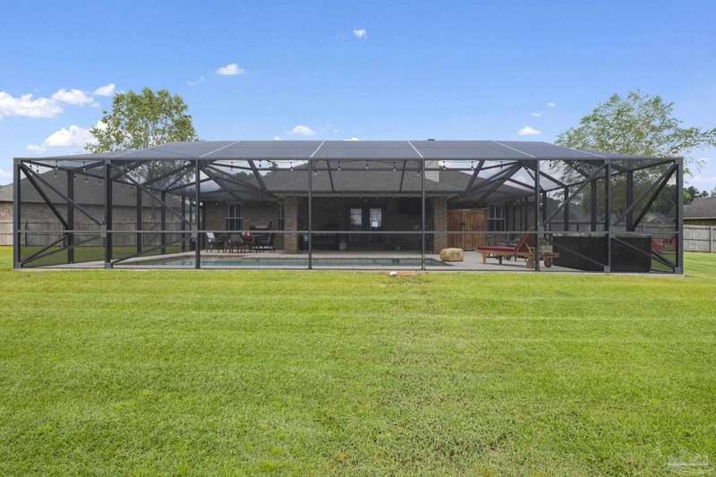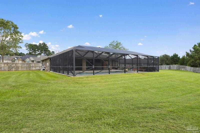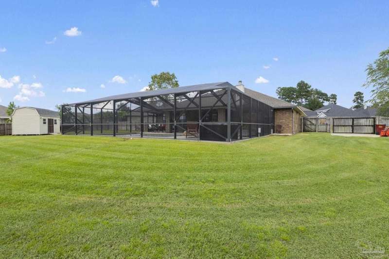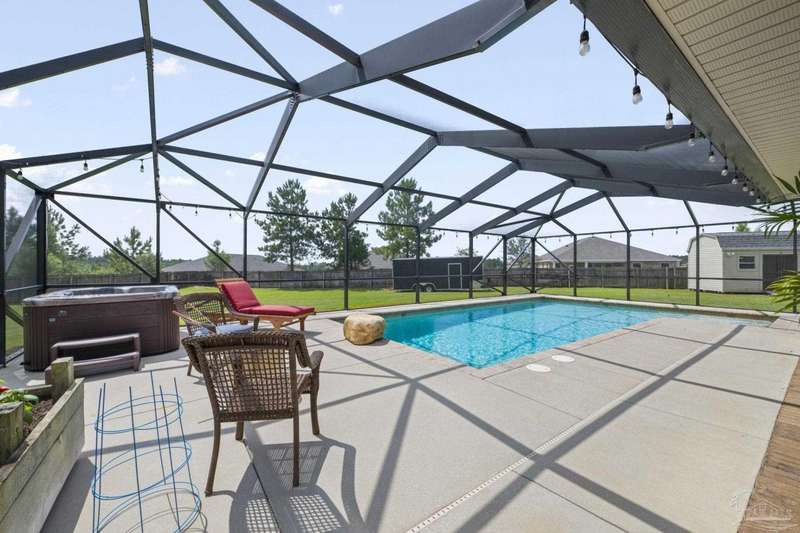 SCREENED GUNITE POOL with SUNSHELF and SEPARATE HOT TUB ~ AMAZING FULLY FENCED PIE SHAPED LOT ~ GATED COMMUNITY ~ 4 bedrooms and 3 full baths ~ Welcome to this beautifully maintained home found in the desirable gated Stonechase community in Pace. Spacious lot with screened pool, hot tub, and covered porch in a sought-after gated community-rarely available. With 2,223 square feet of well-designed living space, this home offers a perfect blend of comfort and style. 3 Separate bedroom wings allow for privacy, each with its own bath. Kitchen features newer appliances and upgraded cherry wood cabinetry. The wrap- around bar is perfect for entertaining and is open to the great room. The kitchen and bathrooms feature granite countertops, while the living and dining room highlight wood-look tile flooring. Ceramic tile is found in the kitchen, bathrooms, and walk-in laundry room for added durability and easy maintenance. Step outside to your private BACKYARD RETREAT with a screened-in gunite pool and a separate hot tub, ideal for relaxing or entertaining. There is a shed for the yard tools as well! The home sits on a HARD TO FIND, FULLY FENCED, oversized lot, providing ample outdoor space for recreation or gardening. Other features include a new HVAC system installed in 2024, a hot water heater installed in 2023, and a 2-car side entry garage. This move-in ready home with the LARGE YARD with sprinkler System, gutters, SCREENED POOL and HOT TUB, side entry garage, extra parking pad, termite bond and a shed, all in a gated sought after subdivision is a rare find! Call today for a personal tour!