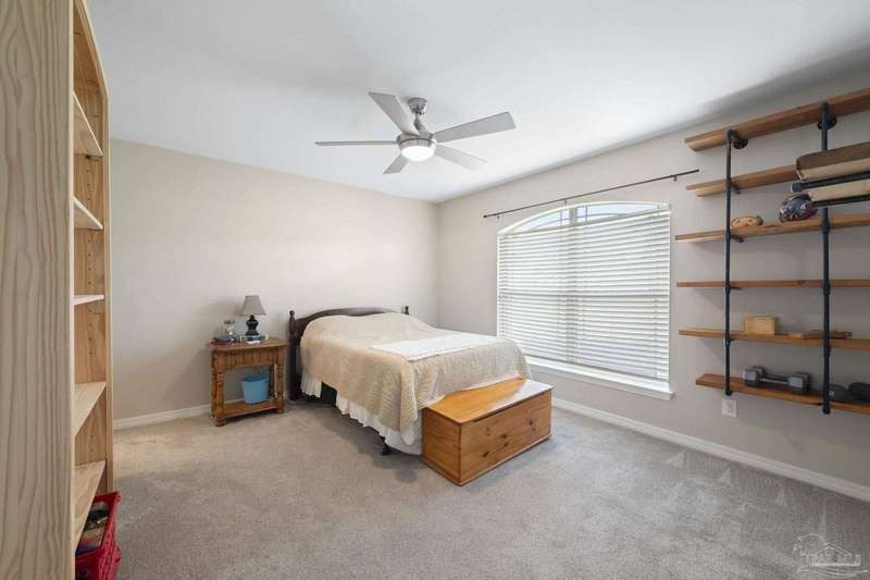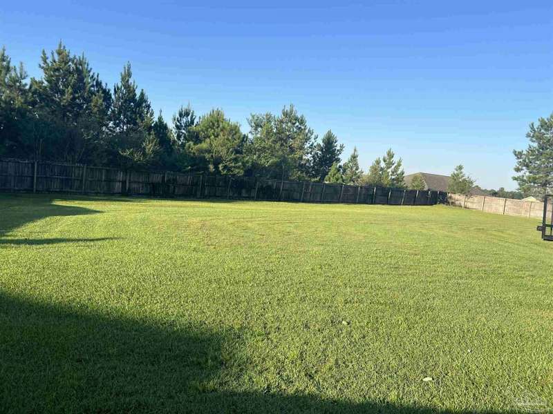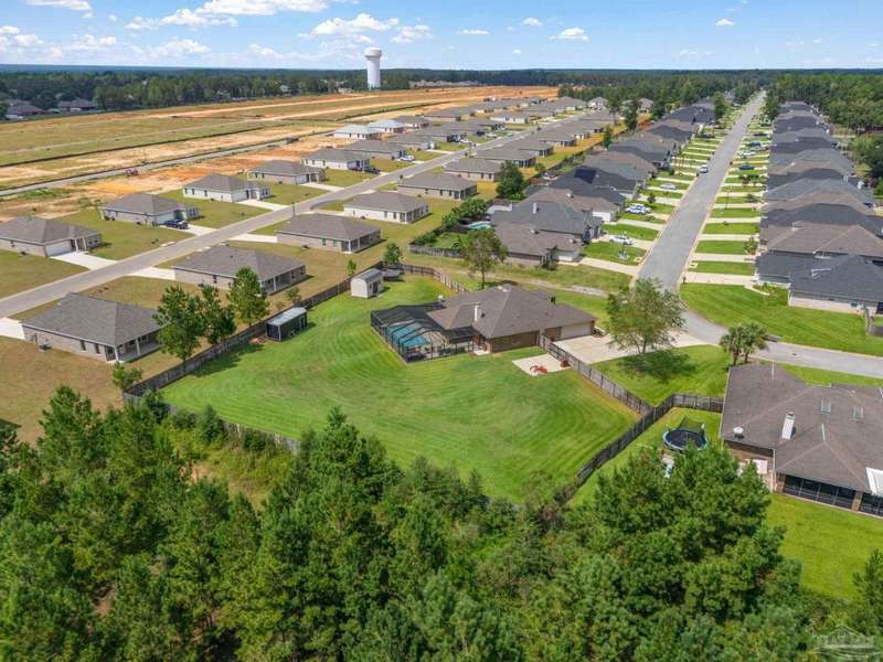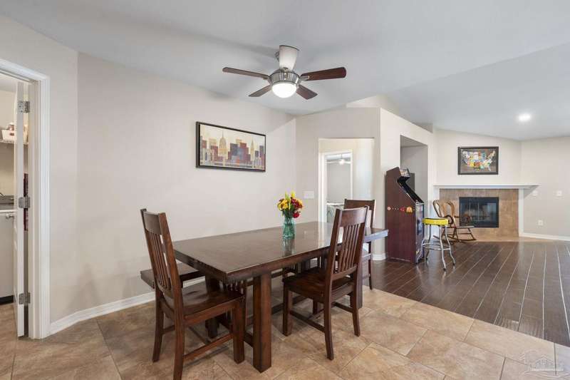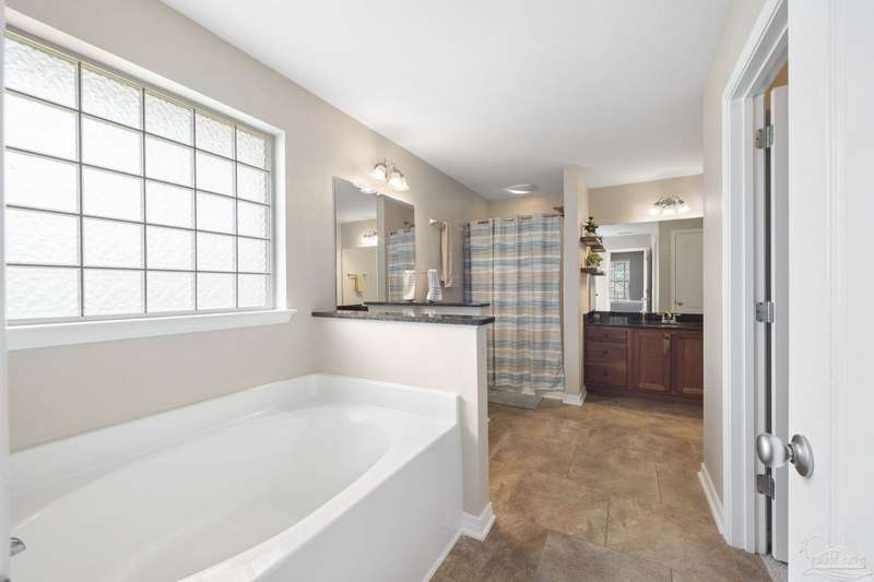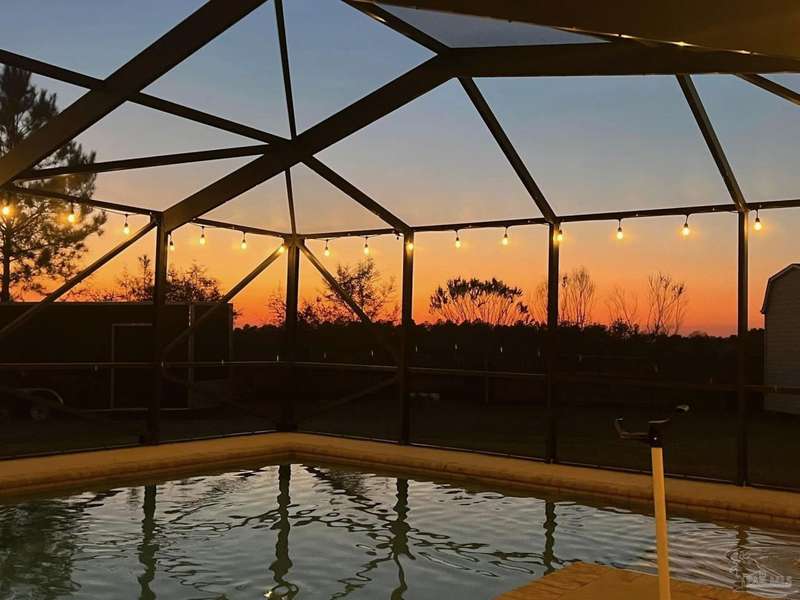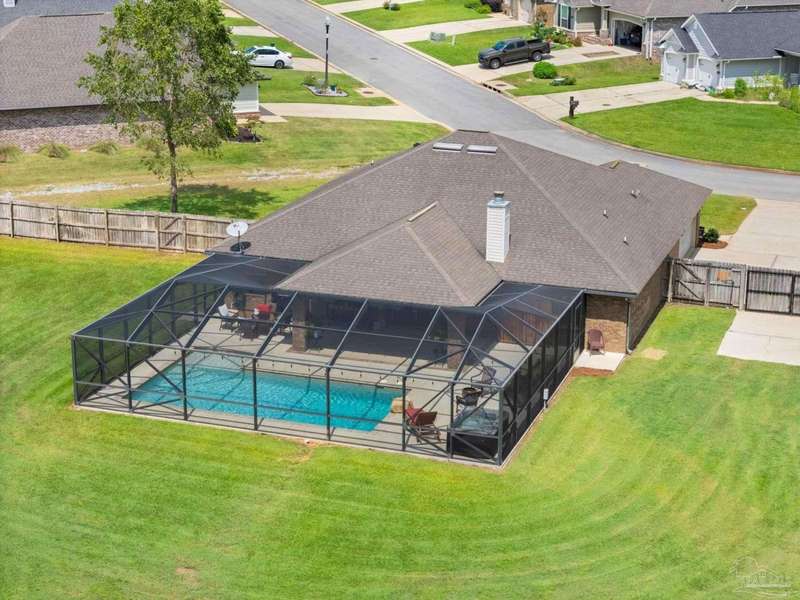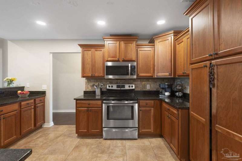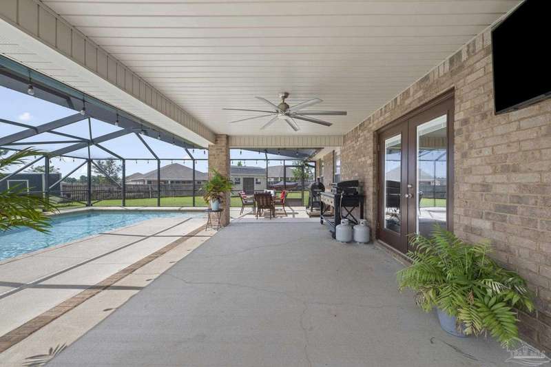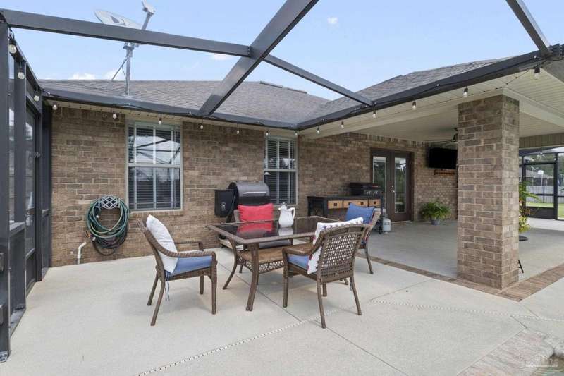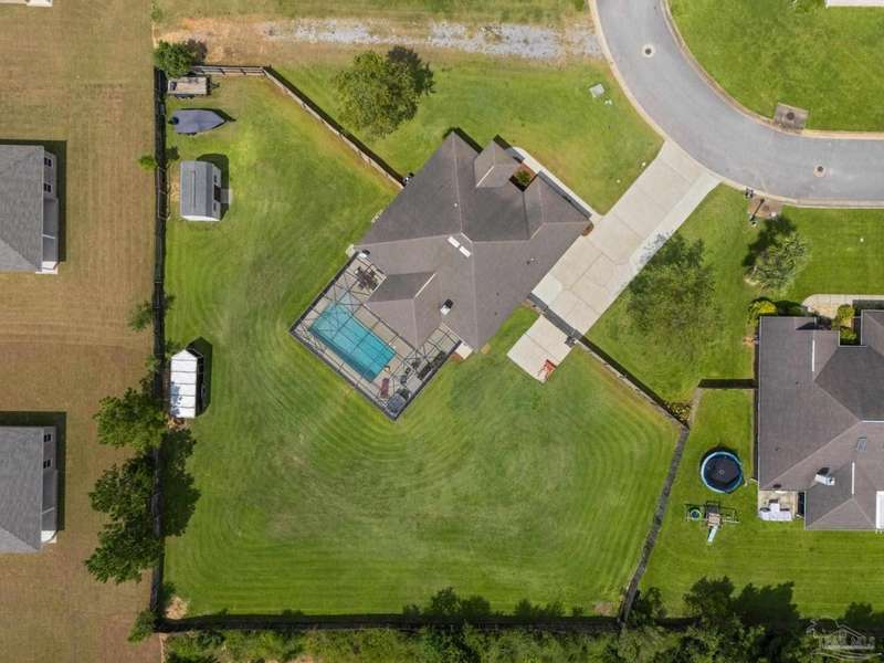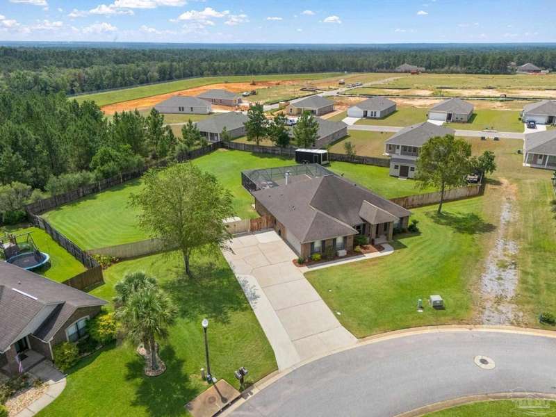 SCREENED GUNITE POOL with SUNSHELF and SEPARATE HOT TUB ~ AMAZING FULLY FENCED PIE SHAPED LOT ~ GATED COMMUNITY ~ 4 bedrooms and 3 full baths ~ Welcome to this beautifully maintained home found in the desirable gated Stonechase community in Pace. Spacious lot with screened pool, hot tub, and covered porch in a sought-after gated community-rarely available. With 2,223 square feet of well-designed living space, this home offers a perfect blend of comfort and style. 3 Separate bedroom wings allow for privacy, each with its own bath. Kitchen features newer appliances and upgraded cherry wood cabinetry. The wrap- around bar is perfect for entertaining and is open to the great room. The kitchen and bathrooms feature granite countertops, while the living and dining room highlight wood-look tile flooring. Ceramic tile is found in the kitchen, bathrooms, and walk-in laundry room for added durability and easy maintenance. Step outside to your private BACKYARD RETREAT with a screened-in gunite pool and a separate hot tub, ideal for relaxing or entertaining. There is a shed for the yard tools as well! The home sits on a HARD TO FIND, FULLY FENCED, oversized lot, providing ample outdoor space for recreation or gardening. Other features include a new HVAC system installed in 2024, a hot water heater installed in 2023, and a 2-car side entry garage. This move-in ready home with the LARGE YARD with sprinkler System, gutters, SCREENED POOL and HOT TUB, side entry garage, extra parking pad, termite bond and a shed, all in a gated sought after subdivision is a rare find! Call today for a personal tour!