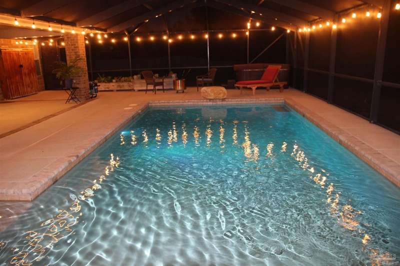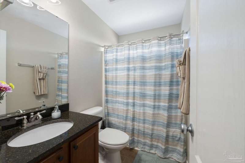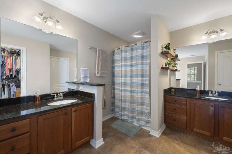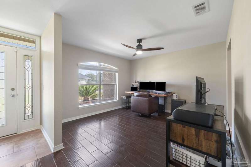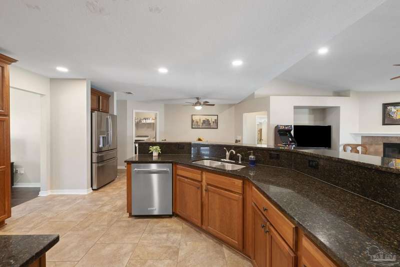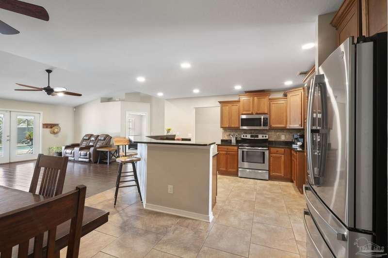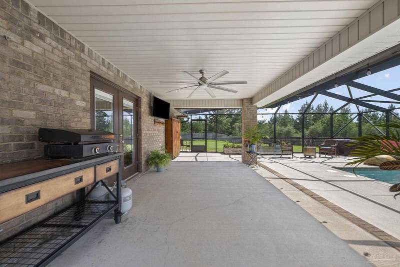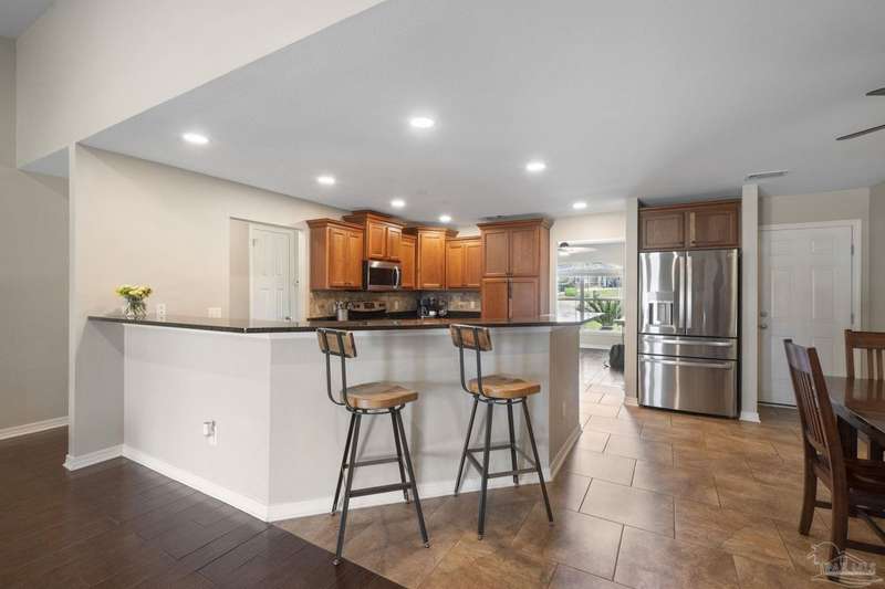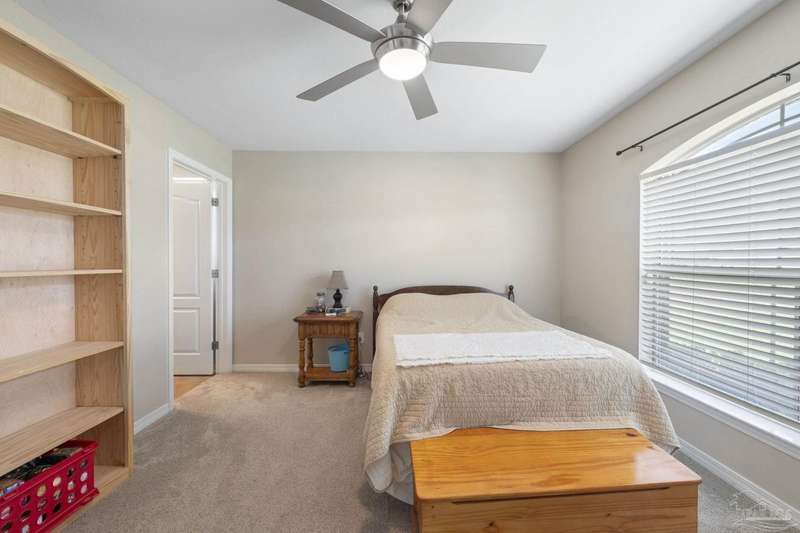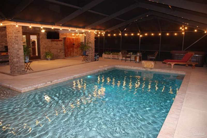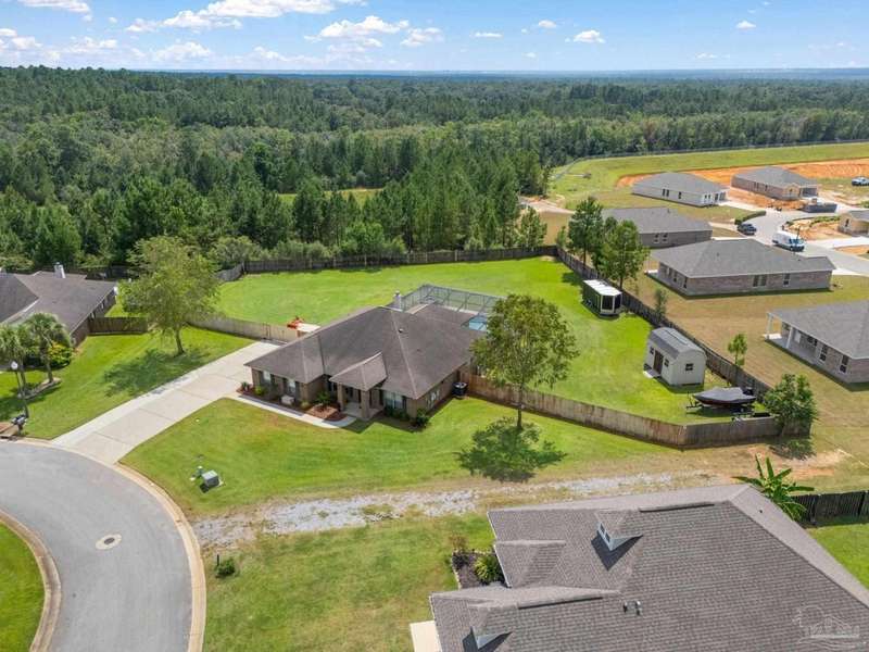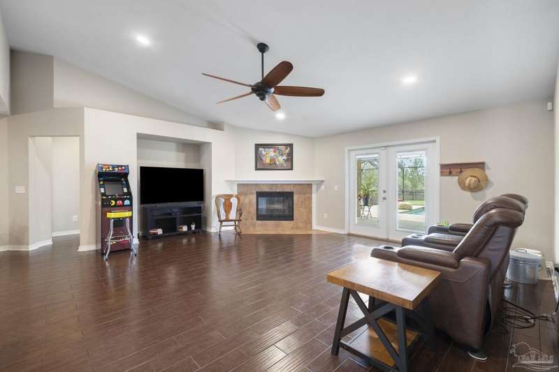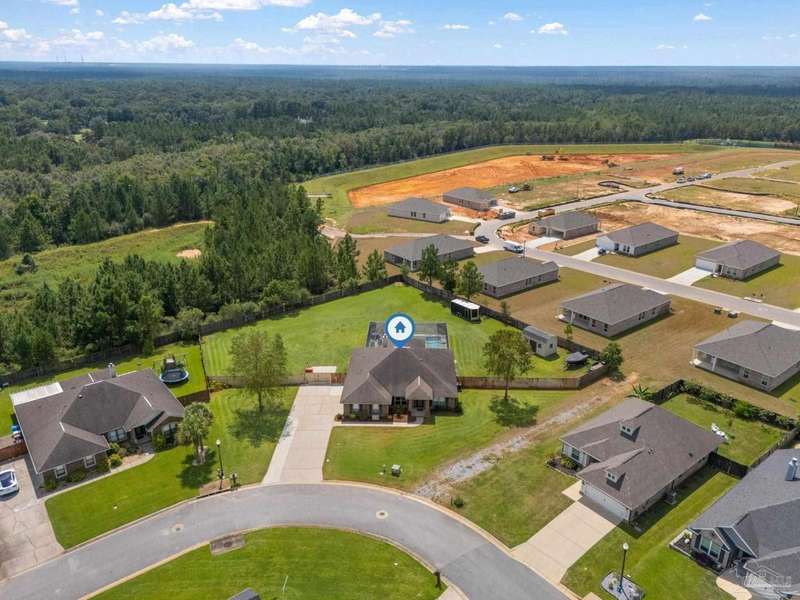SCREENED GUNITE POOL with SUNSHELF and SEPARATE HOT TUB ~ AMAZING FULLY FENCED PIE SHAPED LOT ~ GATED COMMUNITY ~ 4 bedrooms and 3 full baths ~ Welcome to this beautifully maintained home found in the desirable gated Stonechase community in Pace. Spacious lot with screened pool, hot tub, and covered porch in a sought-after gated community-rarely available. With 2,223 square feet of well-designed living space, this home offers a perfect blend of comfort and style. 3 Separate bedroom wings allow for privacy, each with its own bath. Kitchen features newer appliances and upgraded cherry wood cabinetry. The wrap- around bar is perfect for entertaining and is open to the great room. The kitchen and bathrooms feature granite countertops, while the living and dining room highlight wood-look tile flooring. Ceramic tile is found in the kitchen, bathrooms, and walk-in laundry room for added durability and easy maintenance. Step outside to your private BACKYARD RETREAT with a screened-in gunite pool and a separate hot tub, ideal for relaxing or entertaining. There is a shed for the yard tools as well! The home sits on a HARD TO FIND, FULLY FENCED, oversized lot, providing ample outdoor space for recreation or gardening. Other features include a new HVAC system installed in 2024, a hot water heater installed in 2023, and a 2-car side entry garage. This move-in ready home with the LARGE YARD with sprinkler System, gutters, SCREENED POOL and HOT TUB, side entry garage, extra parking pad, termite bond and a shed, all in a gated sought after subdivision is a rare find! Call today for a personal tour!