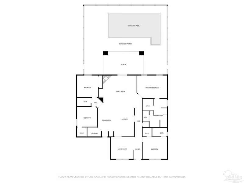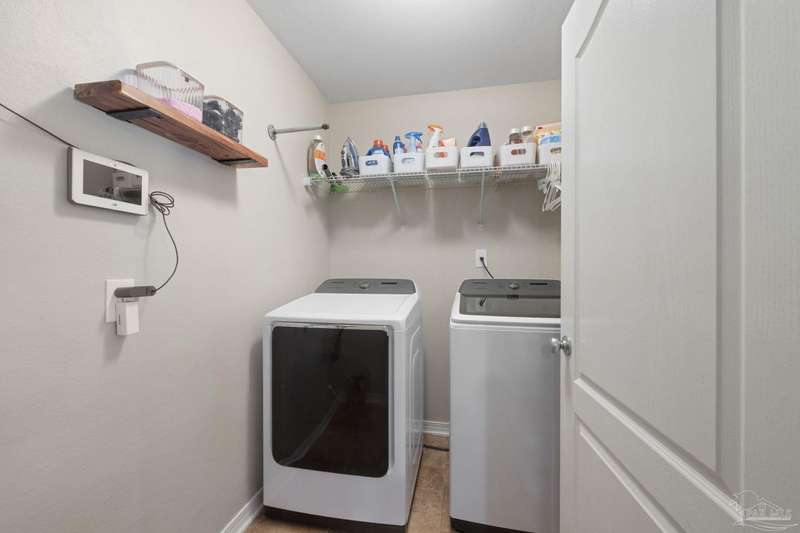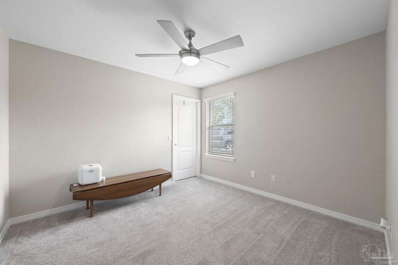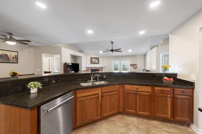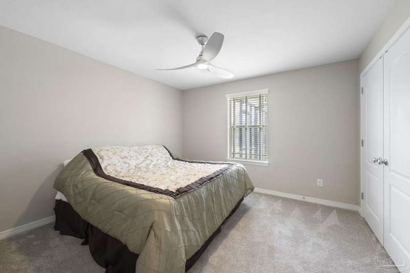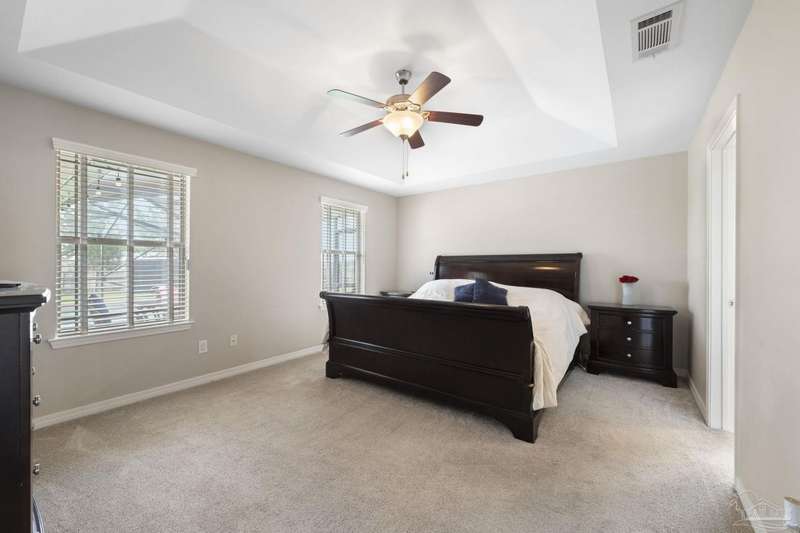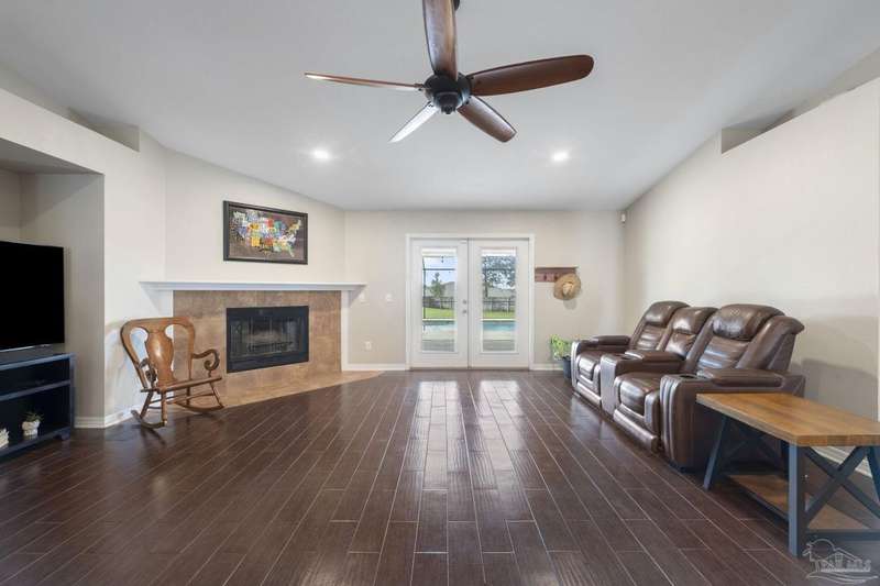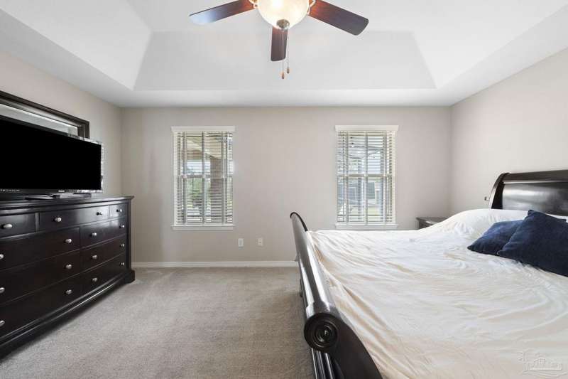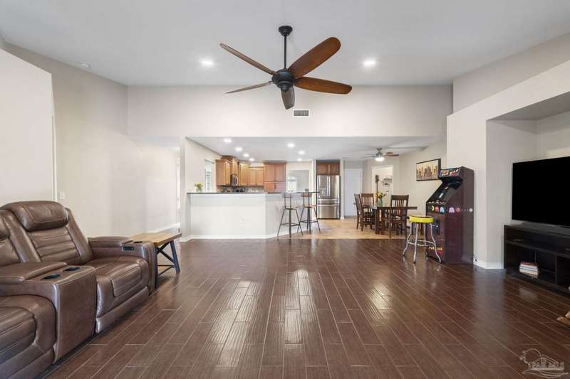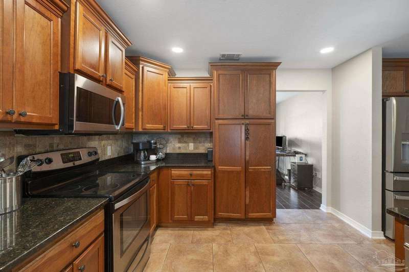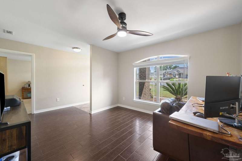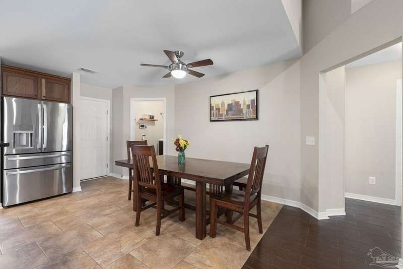 SCREENED GUNITE POOL with SUNSHELF and SEPARATE HOT TUB ~ AMAZING FULLY FENCED PIE SHAPED LOT ~ GATED COMMUNITY ~ 4 bedrooms and 3 full baths ~ Welcome to this beautifully maintained home found in the desirable gated Stonechase community in Pace. Spacious lot with screened pool, hot tub, and covered porch in a sought-after gated community-rarely available. With 2,223 square feet of well-designed living space, this home offers a perfect blend of comfort and style. 3 Separate bedroom wings allow for privacy, each with its own bath. Kitchen features newer appliances and upgraded cherry wood cabinetry. The wrap- around bar is perfect for entertaining and is open to the great room. The kitchen and bathrooms feature granite countertops, while the living and dining room highlight wood-look tile flooring. Ceramic tile is found in the kitchen, bathrooms, and walk-in laundry room for added durability and easy maintenance. Step outside to your private BACKYARD RETREAT with a screened-in gunite pool and a separate hot tub, ideal for relaxing or entertaining. There is a shed for the yard tools as well! The home sits on a HARD TO FIND, FULLY FENCED, oversized lot, providing ample outdoor space for recreation or gardening. Other features include a new HVAC system installed in 2024, a hot water heater installed in 2023, and a 2-car side entry garage. This move-in ready home with the LARGE YARD with sprinkler System, gutters, SCREENED POOL and HOT TUB, side entry garage, extra parking pad, termite bond and a shed, all in a gated sought after subdivision is a rare find! Call today for a personal tour!