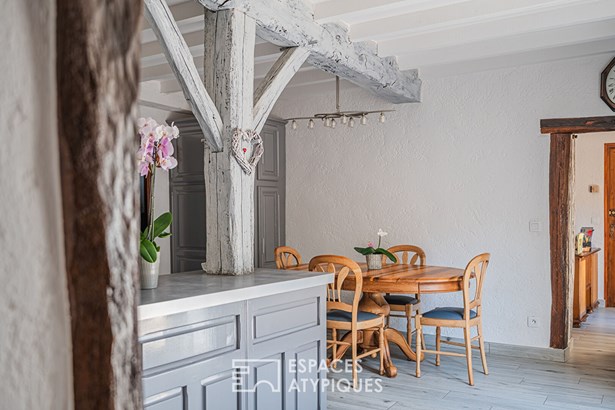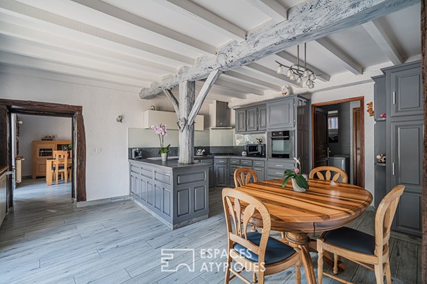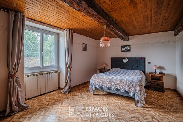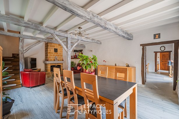 The ground floor, having undergone a recent and careful renovation, offers a beautiful, bright living room, enhanced by exposed beams and a stone fireplace. The large kitchen, office, and laundry room with toilet harmoniously complete this functional and welcoming single-story space. Upstairs, three bedrooms, a dressing room, a bathroom, and toilet await to be revisited to reveal their full potential. The upper level houses a 35 sqm attic games room, ideal for a children's area, a cinema room or the creation of additional bedrooms. In continuity, convertible attic space completes the whole. Extended by an outbuilding grouping garage, boiler room and attic mezzanine, the house has numerous additional spaces for DIY or storage.