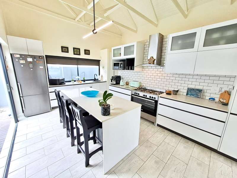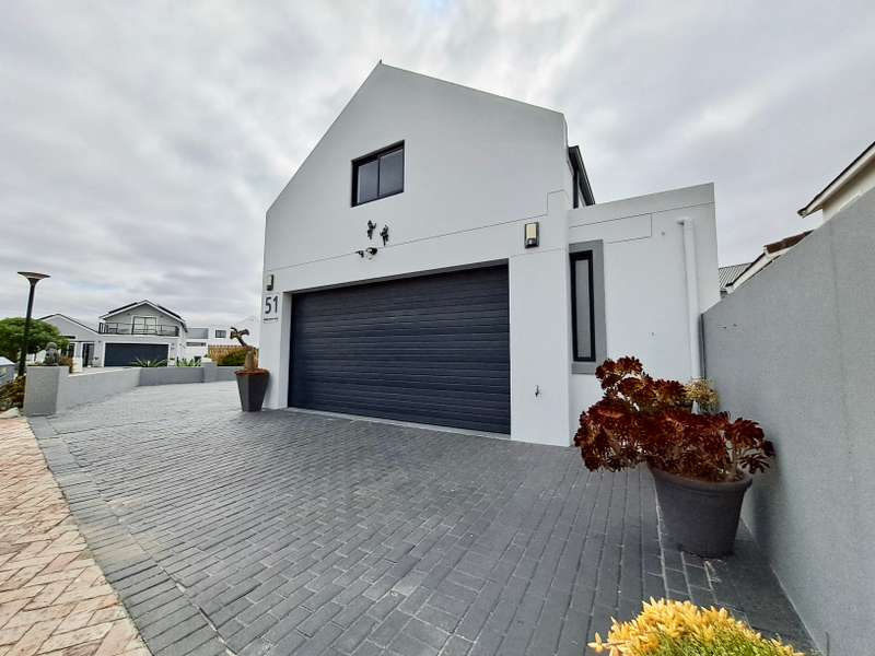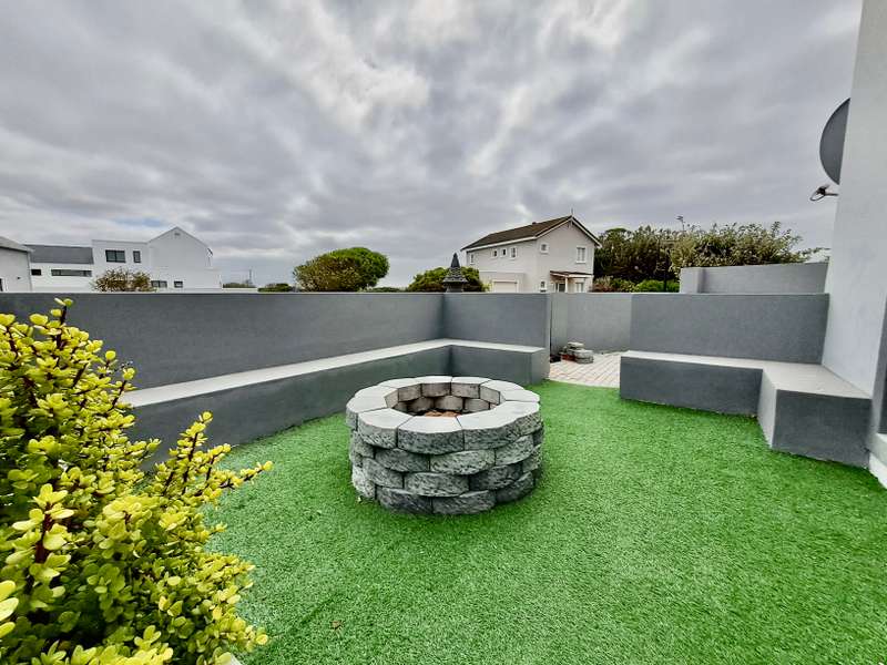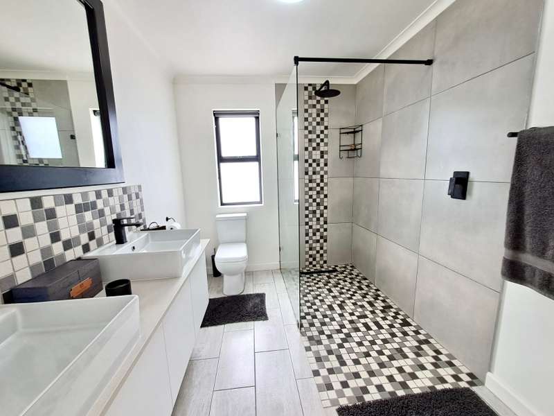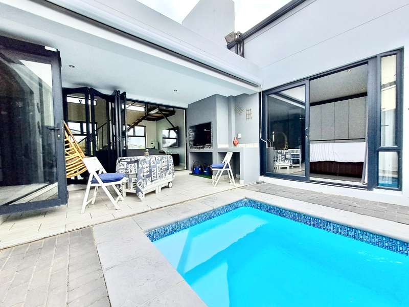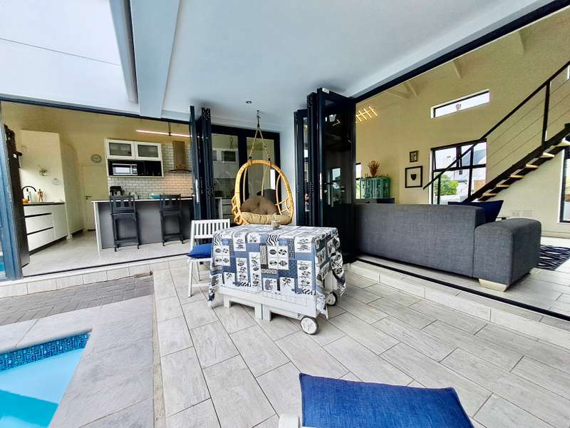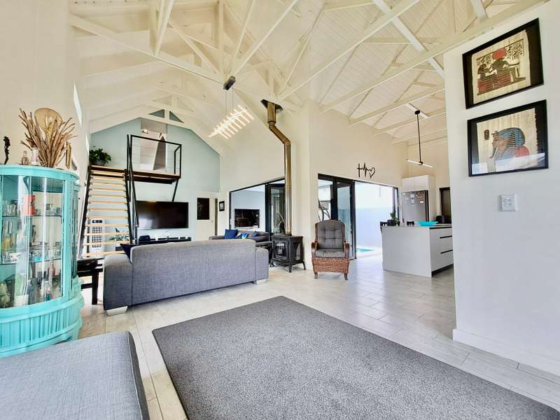 Description: This beautifully designed, modern 3-bedroom house is located within a secure beachfront estate in Yzerfontein, offering an ideal coastal lifestyle just steps from the ocean. Blending contemporary design with functional living, this property provides an exquisite retreat with ample space for family living and entertaining. Interior Features: Open-plan Living Area: The home’s layout integrates the living, dining, and kitchen areas seamlessly. White high-peaked ceilings, exposed wooden beams, and elegant wood-look tiles throughout create a sense of space and sophistication. Kitchen: A sleek, modern kitchen perfect for those who love to cook. It includes white cabinetry, white engineered stone countertops, a black prep sink, extractor fan, and a center island with seating for four. The kitchen also includes a coffee nook, and the adjacent scullery offers extra storage with a water point for a dishwasher and a double Franke sink. Stacker doors open to the backyard, providing convenient outdoor access. Living/Dining Area: Spacious and inviting, the living room features an enclosed combustion fireplace for cozy winter nights. Large stacker doors create a natural flow from the indoors to the outdoor entertainment area. Loft Bedroom: Accessed via a steel and wooden staircase, the loft bedroom offers a versatile space for both relaxation and sleeping, complete with an abundance of natural light. Ground Floor Bedrooms: First Bedroom: Equipped with built-in cupboards and large windows, this bedroom has an en-suite bathroom featuring a glass shower, floating vanity, and toilet. Main Bedroom: Spacious with sliding doors that lead directly to the pool and backyard. The main bathroom is equally luxurious, featuring a glass shower, double floating vanity, and toilet. Outdoor Features: Entertainment Area: A fantastic undercover patio equipped with a built-in braai and weather blinds ensures year-round enjoyment. A sparkling splash pool and artificial grass lawn provide a low-maintenance outdoor experience. The garden also features a fire pit with concrete seating and a separate area for a washing line. Garage and Parking: The property includes a double garage with enough space for two cars and a motorbike. Additionally, there is off-street parking for four more vehicles in front of the house. Additional Highlights: Solar Geyser: Energy-efficient hot water system. Security: Equipped with an alarm system, security beams, and sun-block blinds for added privacy. Windows & Doors: Aluminium windows and doors throughout the house. Beach Access: The estate provides direct access to the beach, enhancing the appeal of this coastal property. Summary: Located in the secure Mile 16 Beachfront Estate, this Yzerfontein property is a gem for those seeking luxury, comfort, and the convenience of beachfront living. Thoughtfully designed with both style and functionality in mind, this home offers a perfect balance of indoor and outdoor spaces for relaxation and entertainment.