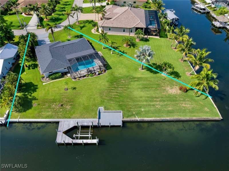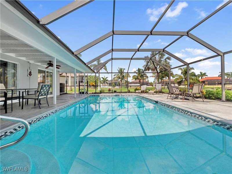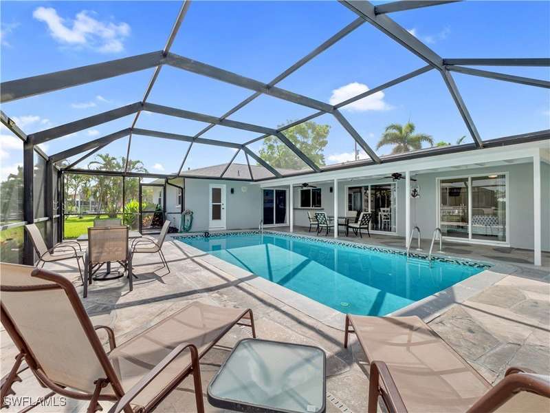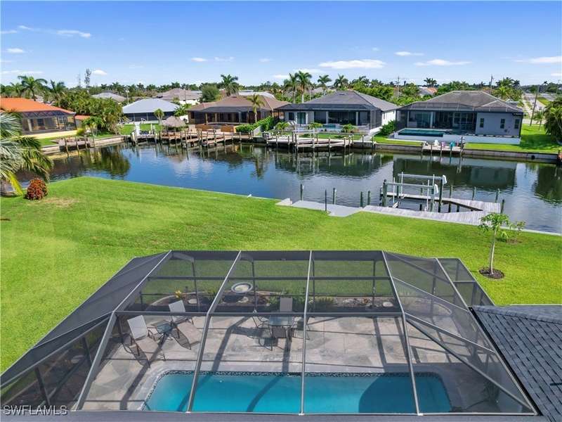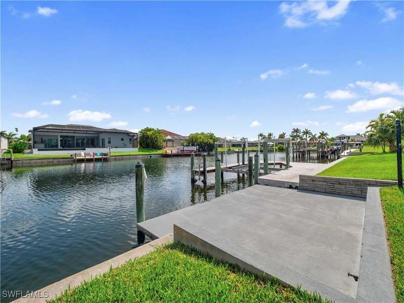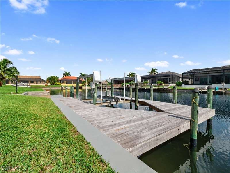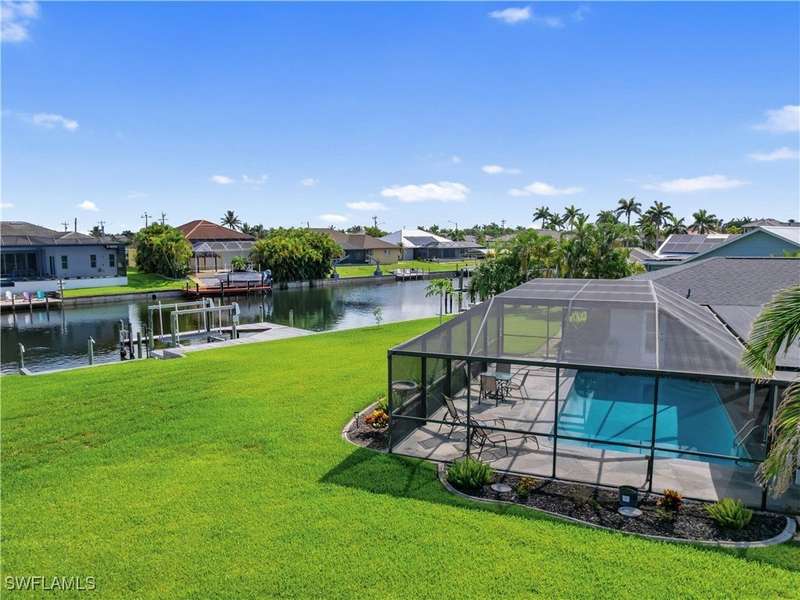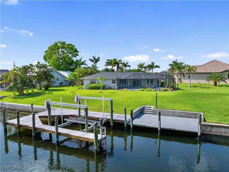 Your Boater's dream in Cape Coral is here! This Gulf access pool home sits on an oversized corner lot with wide waterfront views and no HOA. The property includes a private dock with a 10,000 lb boat lift, complete with electric and water hookups -perfect for fishing/boating lovers! Major updates have already been taken care of, including a brand-new seawall, new roof, and a new pool heater, City water & sewer utilities are paid in full! Beautiful landscaping surrounds the home, adding curb appeal and enhancing the tropical, laid-back vibe from the moment you arrive. The home features 3 bedrooms, 2 bathrooms, and roughly 1,600 sq ft of living space. Inside, you'll find a bright and functional split floor plan with tile throughout, stainless steel appliances, and a layout designed for everyday comfort and entertaining. Natural light pours in through windows and doors that frame the water views, with the kitchen centrally located at the heart of the home. Enjoy a refreshing dip in the pool after long boat days or simply relax in your spacious backyard ... a rare find for canal-front properties. The 2-car garage offers storage for your car, jet ski, or gear. With no HOA restrictions, this home is ideal for full-time residents, seasonal getaways, or as a vacation rental opportunity. Located just a short boat ride from Cape Harbour and minutes to local beaches like Sanibel, Captiva, and Fort Myers Beach, you're perfectly positioned to enjoy waterfront dining, shelling, fishing, and all that the Florida lifestyle has to offer.