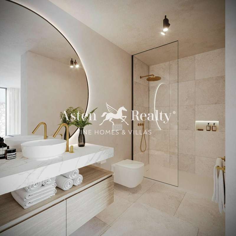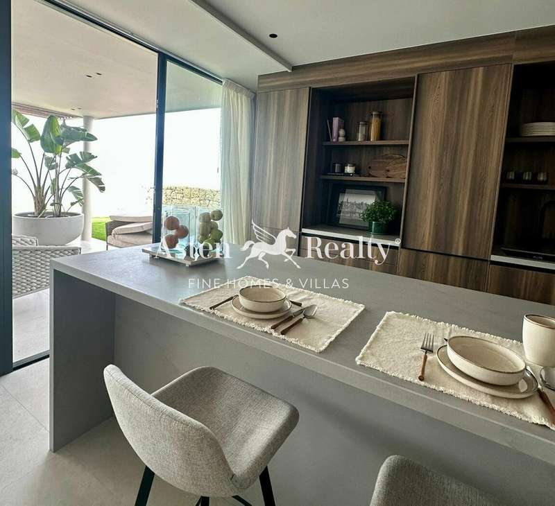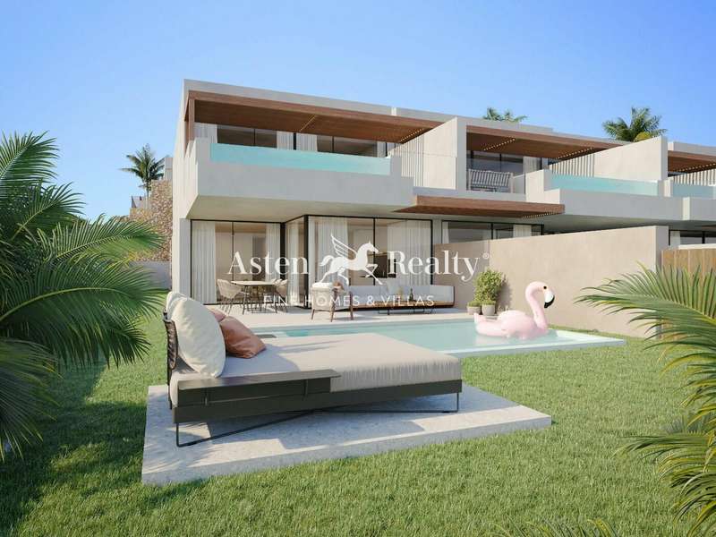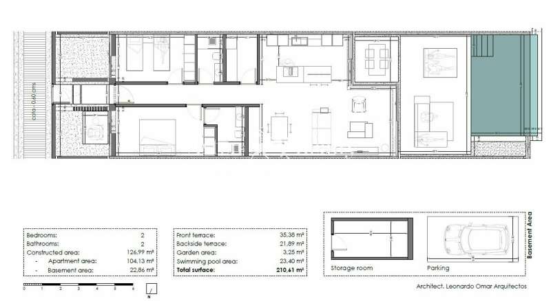 It has two bedrooms, two bathrooms, living room, kitchen with island, terrace and private pool. They are built with local, contemporary and quality materials.