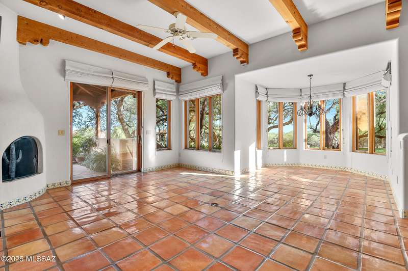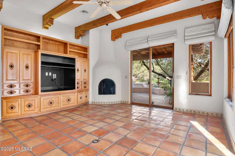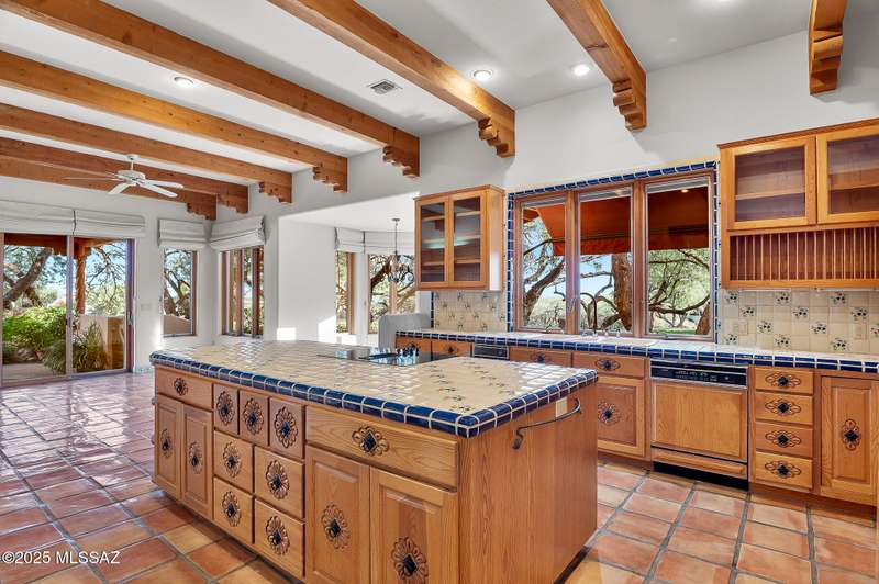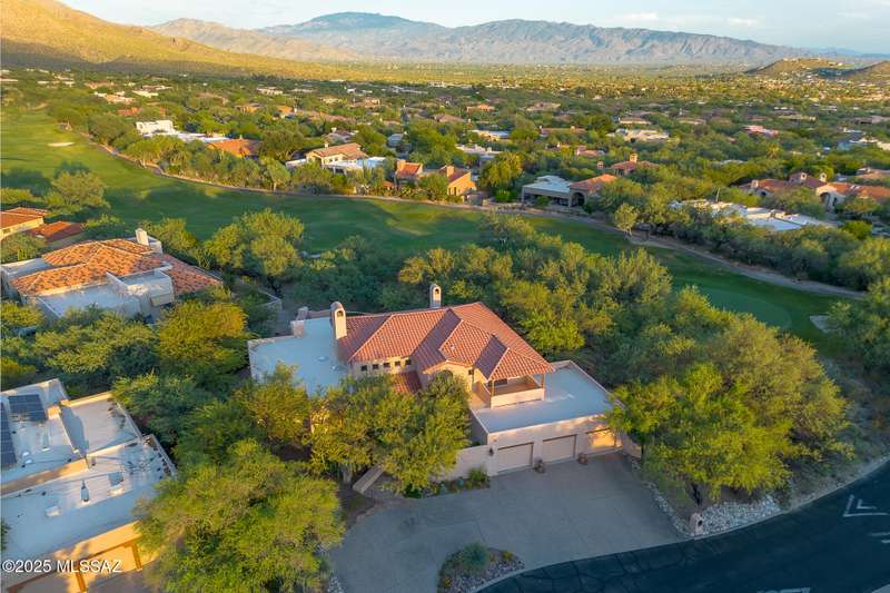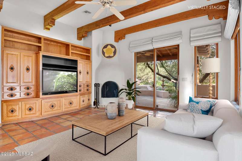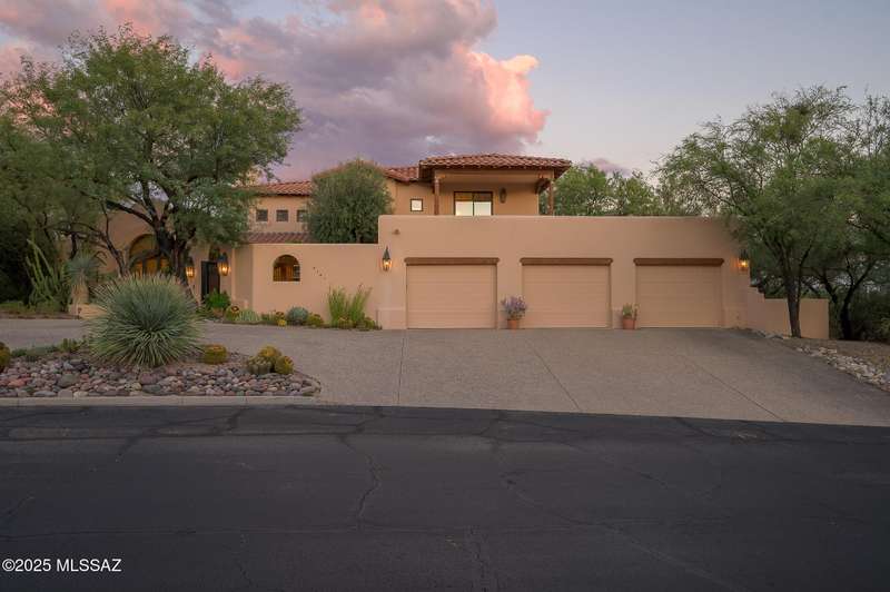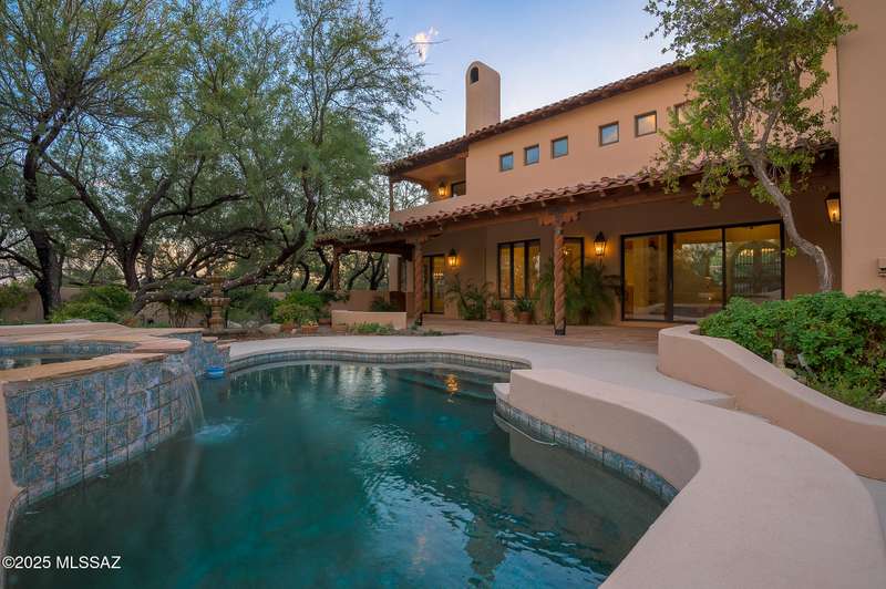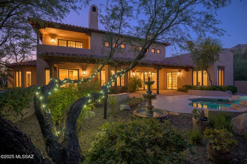 Situated in prestigious Ventana Canyon Estates, this exceptional Mike Wachs Southwestern Style Home overlooks hole #7 of the Canyon Golf Course. This fantastic masonry/stucco home features 4090 sf, 3BR/4BA/Den, private, corner lot, high, beamed ceilings and beautiful back yard with pool, spa, fountain, fireplace and golf course views.Entering through the courtyard gates and entry door to the open foyer, exposes hand crafted beams, Saltillo tile floor and custom cabinetry. The large living room is immediately evident, complete with the large, custom fireplace and view of the phenomenal back yard. A large dining area and wet bar complete this area and make entertaining a breeze.The superb chef's kitchen features a large island with electric cooktop, dbl ovens and ample cabinetry.