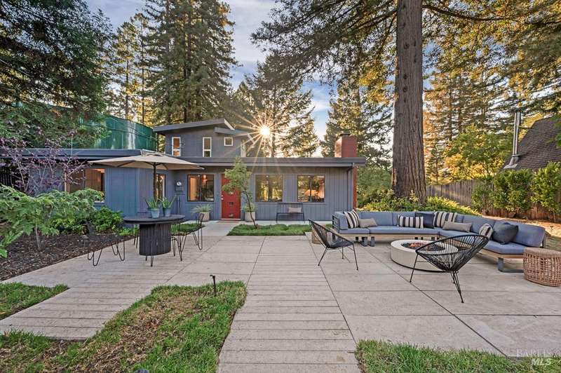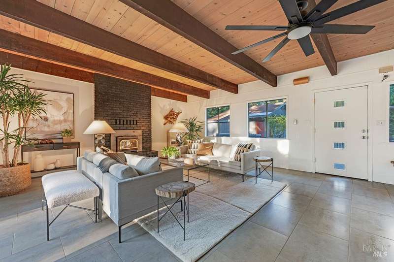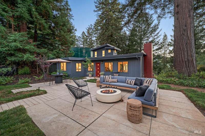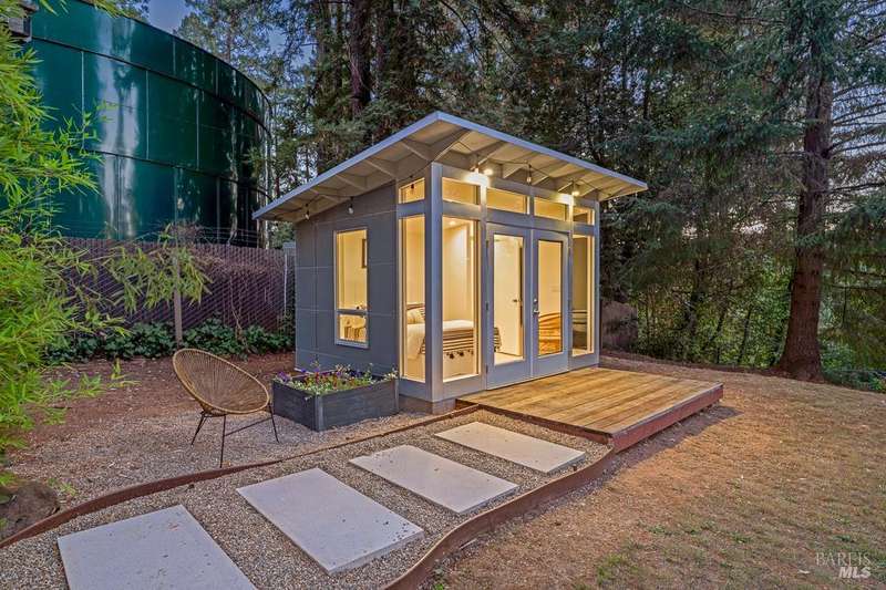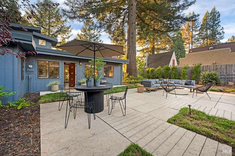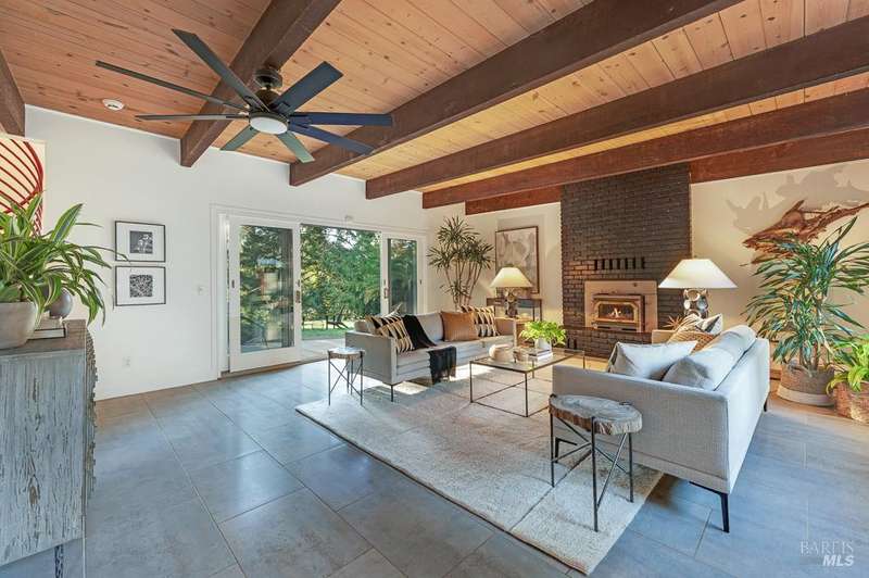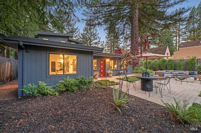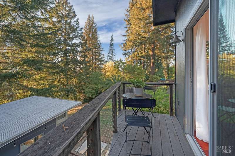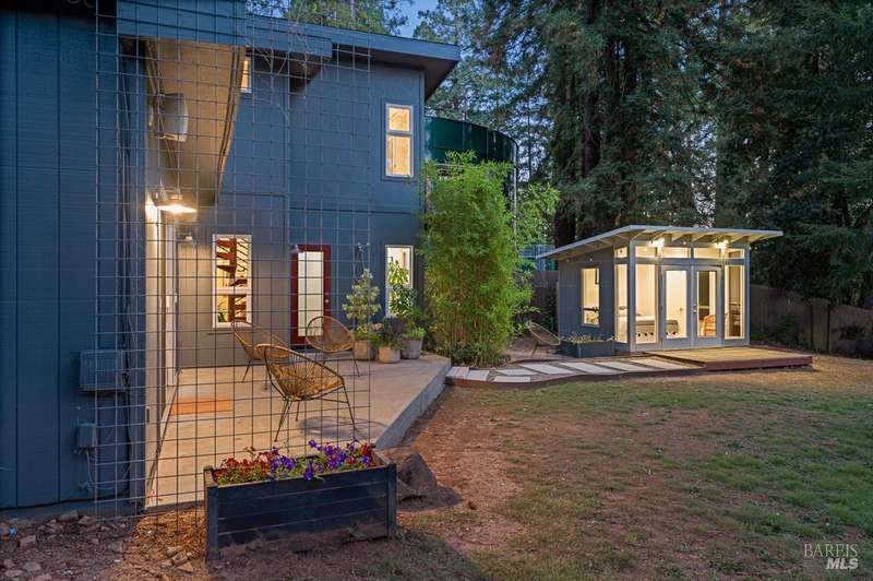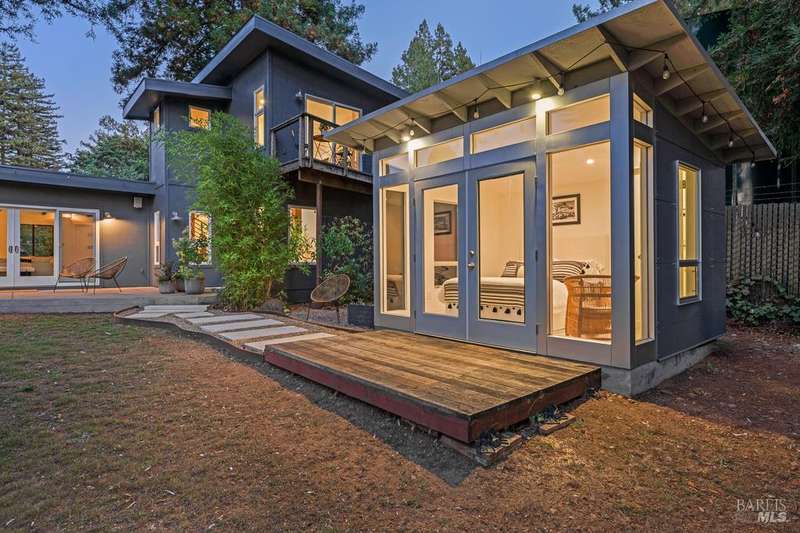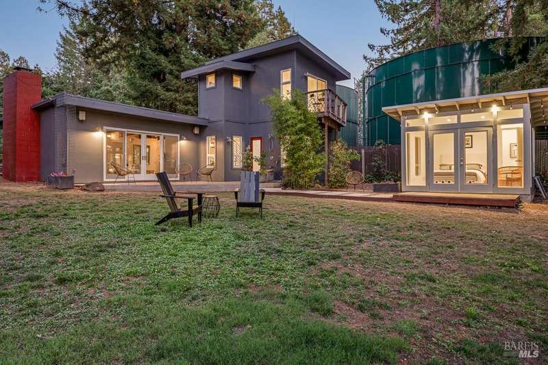 Perched above the Russian River on the Coveted Flamingo Hill - just moments from downtown Guerneville - this Mid-Century Modern jewel is the epitome of the golden era of design. Behind private gates, impeccable style unfolds: a 1BR, 1.5BA retreat that celebrates both epic design and the river and redwoods. From the instant you arrive, the mood is set. The front courtyard, anchored by a firepit and framed with lush landscaping, feels tailor-made for a cocktail reception, martinis in hand, laughter rising into the evening air. Inside open-beam ceilings and a handsome brick fireplace meet double French sliders that blur the line between indoors and out. The open kitchen flows seamlessly into the living space, perfect for hosting with ease, while the back deck and gently sloping lawn invite summer afternoons and long evenings under the stars. Upstairs, the bedroom retreat is pure sanctuary, complete with Juliet balcony overlooking the grounds of just over .5 acres. A detached studio with half bath offers space for guests, an office, or creative pursuits, while the oversized garage with EV charging adds utility. Your own mid-century escape awaits - both a statement piece and sanctuary.