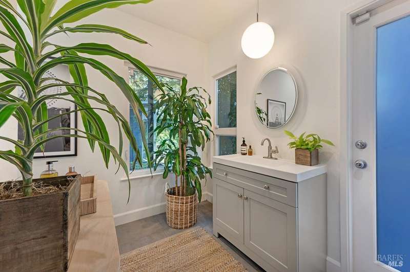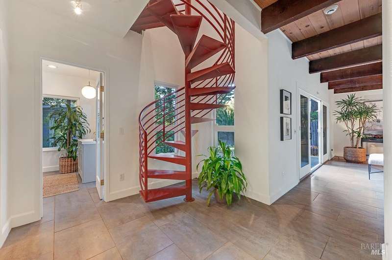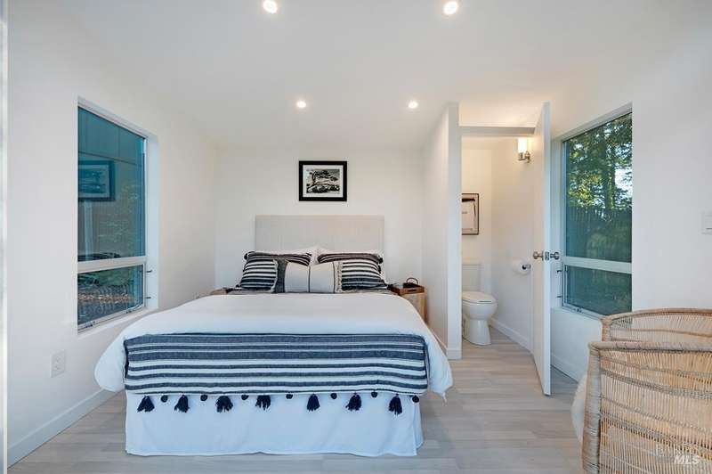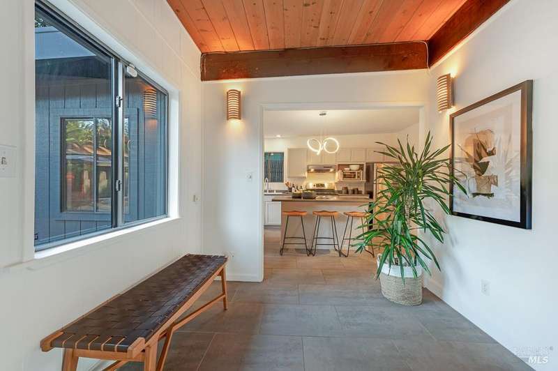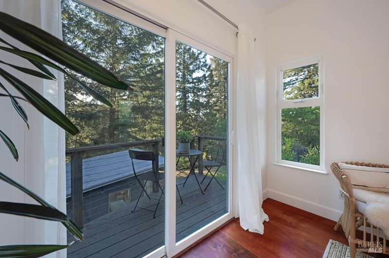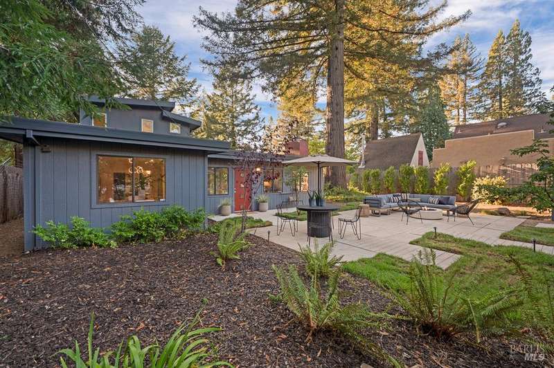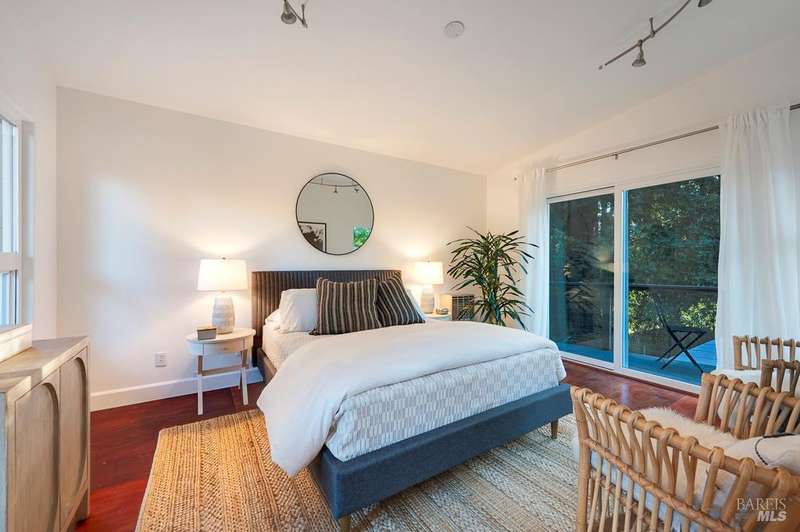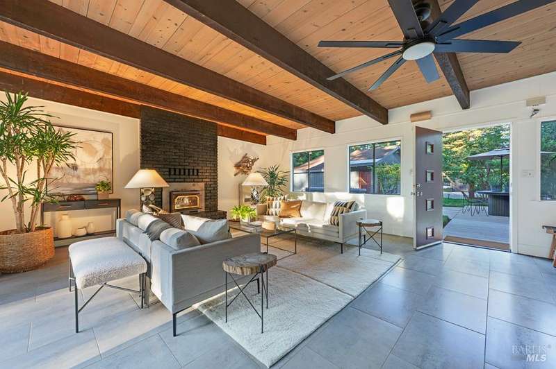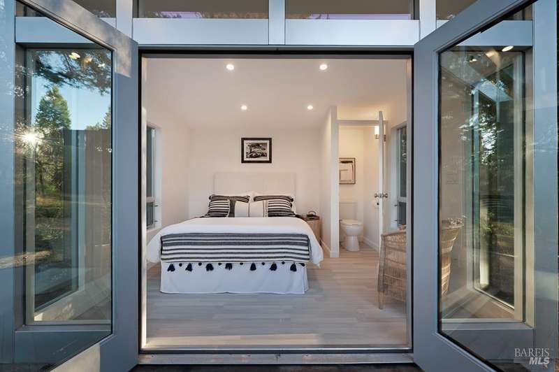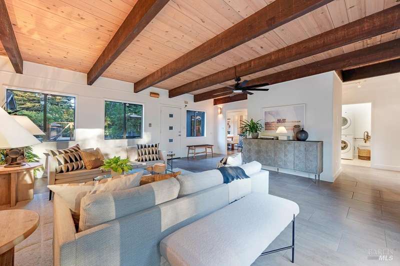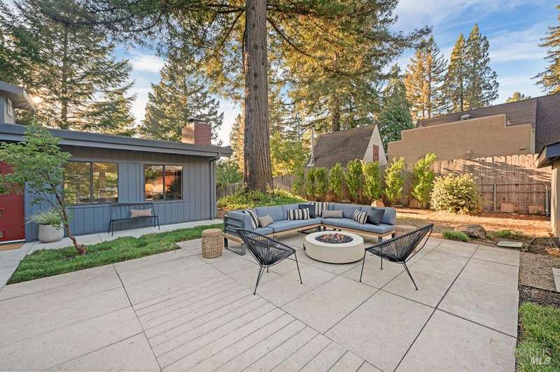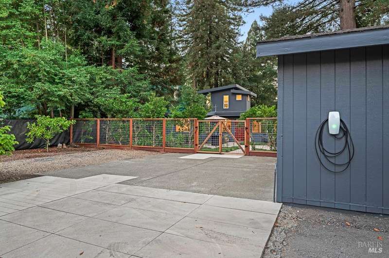 Perched above the Russian River on the Coveted Flamingo Hill - just moments from downtown Guerneville - this Mid-Century Modern jewel is the epitome of the golden era of design. Behind private gates, impeccable style unfolds: a 1BR, 1.5BA retreat that celebrates both epic design and the river and redwoods. From the instant you arrive, the mood is set. The front courtyard, anchored by a firepit and framed with lush landscaping, feels tailor-made for a cocktail reception, martinis in hand, laughter rising into the evening air. Inside open-beam ceilings and a handsome brick fireplace meet double French sliders that blur the line between indoors and out. The open kitchen flows seamlessly into the living space, perfect for hosting with ease, while the back deck and gently sloping lawn invite summer afternoons and long evenings under the stars. Upstairs, the bedroom retreat is pure sanctuary, complete with Juliet balcony overlooking the grounds of just over .5 acres. A detached studio with half bath offers space for guests, an office, or creative pursuits, while the oversized garage with EV charging adds utility. Your own mid-century escape awaits - both a statement piece and sanctuary.