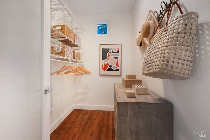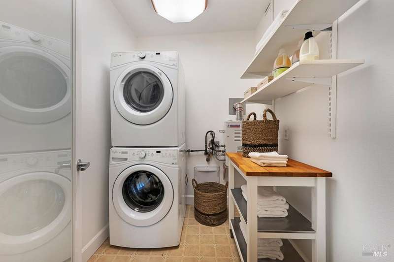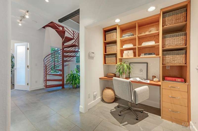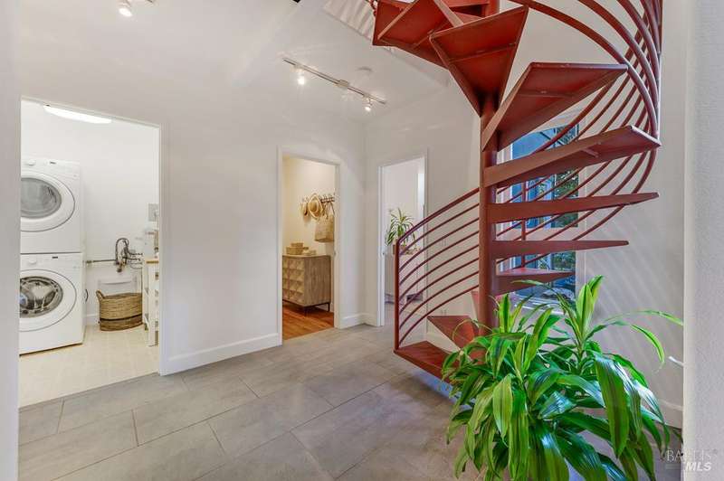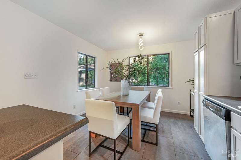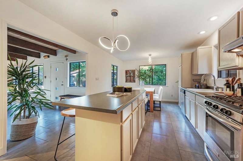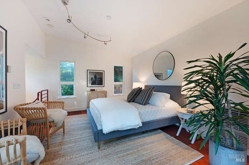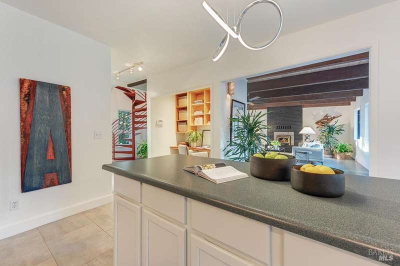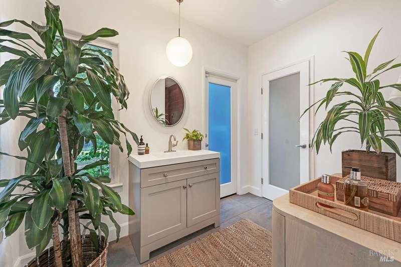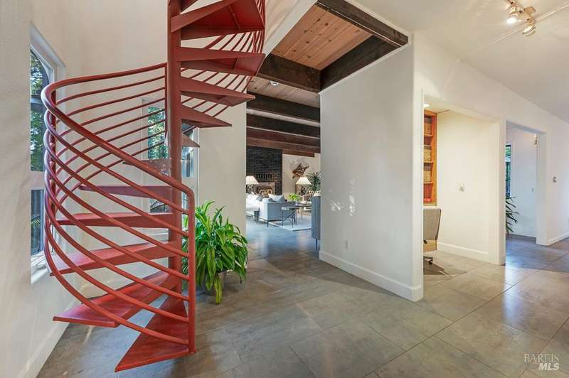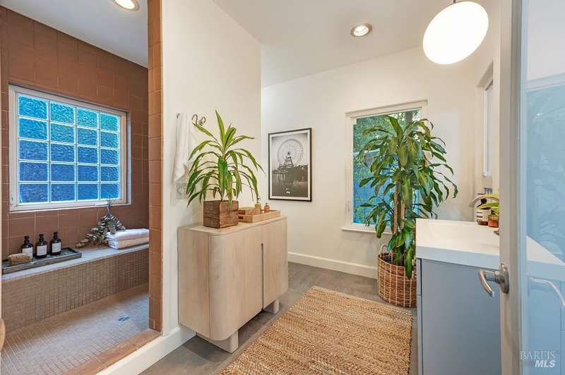 Perched above the Russian River on the Coveted Flamingo Hill - just moments from downtown Guerneville - this Mid-Century Modern jewel is the epitome of the golden era of design. Behind private gates, impeccable style unfolds: a 1BR, 1.5BA retreat that celebrates both epic design and the river and redwoods. From the instant you arrive, the mood is set. The front courtyard, anchored by a firepit and framed with lush landscaping, feels tailor-made for a cocktail reception, martinis in hand, laughter rising into the evening air. Inside open-beam ceilings and a handsome brick fireplace meet double French sliders that blur the line between indoors and out. The open kitchen flows seamlessly into the living space, perfect for hosting with ease, while the back deck and gently sloping lawn invite summer afternoons and long evenings under the stars. Upstairs, the bedroom retreat is pure sanctuary, complete with Juliet balcony overlooking the grounds of just over .5 acres. A detached studio with half bath offers space for guests, an office, or creative pursuits, while the oversized garage with EV charging adds utility. Your own mid-century escape awaits - both a statement piece and sanctuary.