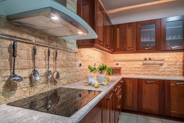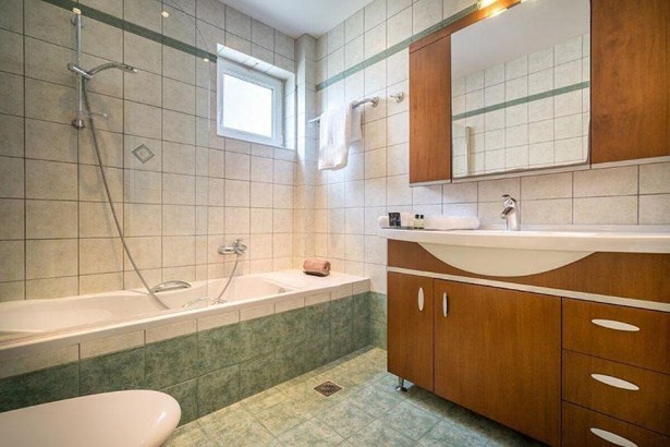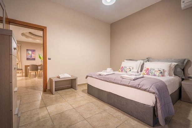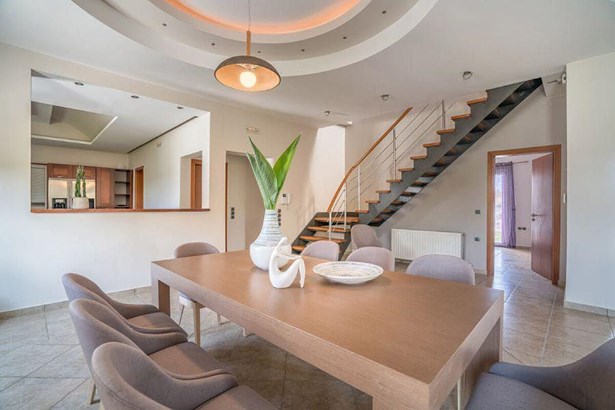This stunning two-storey villa, just 300 meters from the sea, features 5 bedrooms and accommodates up to 12 guests. The ground floor boasts a spacious modern living room, a fully equipped open-plan kitchen, two dining areas, a twin bedroom, and a bathroom with a shower. Upstairs, you'll find four bedrooms (one master with an en-suite bathroom and three with twin beds), an additional living area, and a bathroom with a bathtub.