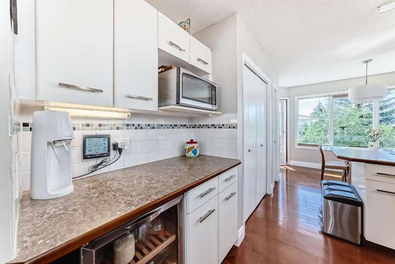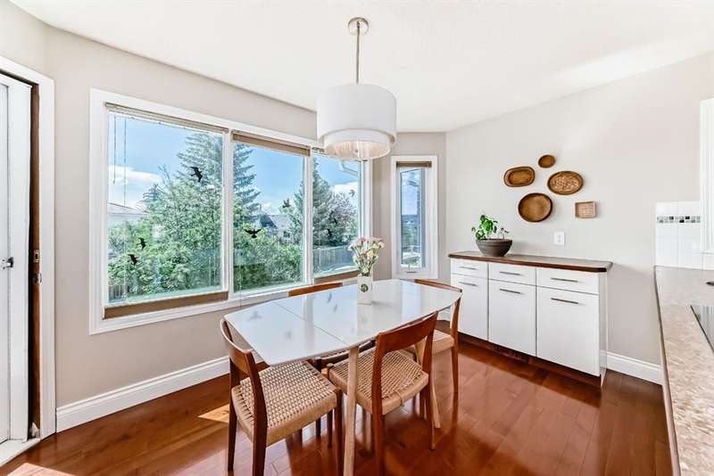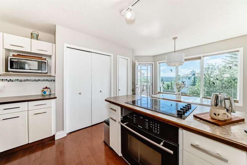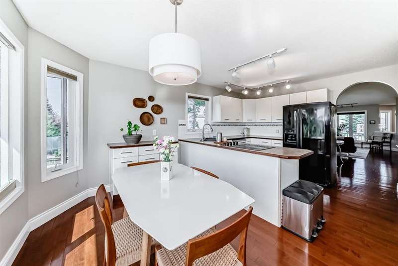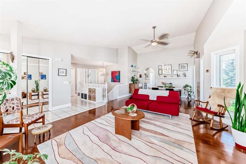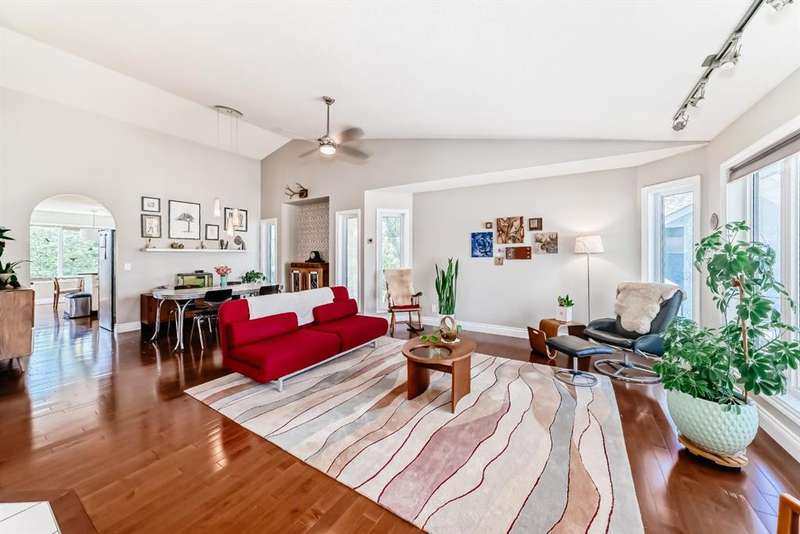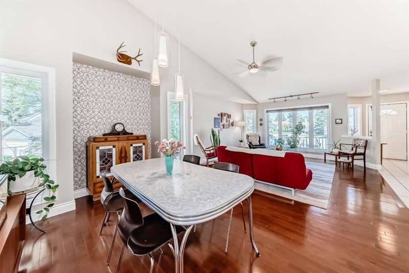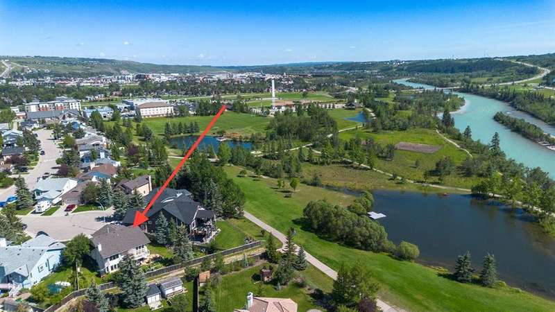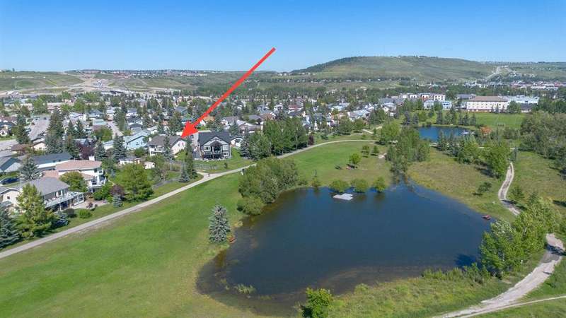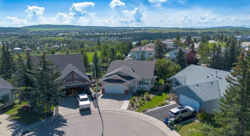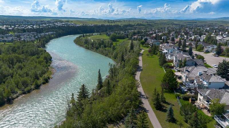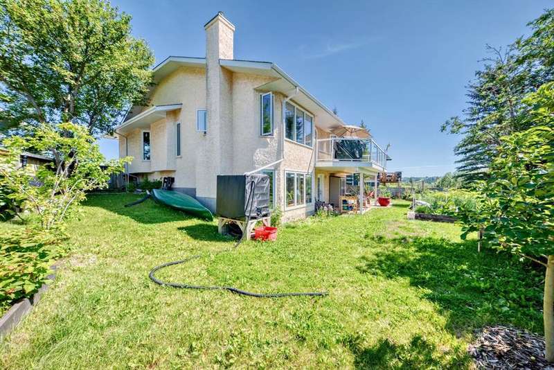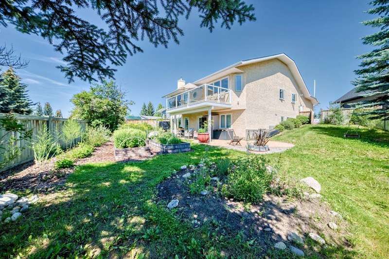 INCREDIBLE LOCATION. This WALKOUT BUNGALOW sits on an OVERSIZED,PIE-SHAPED LOT in the desirable and well established community of WEST VALLEY. Situated in a QUIET CUL DE SAC and backing onto the trails leading directly to the expansive MITFORD PARK, this idyllic setting boasts the convenience of suburban living with the solitude of nature. Enjoy the VIEW OF MITFORD PONDS and abundant birdlife from your upper deck or indoor breakfast nook, or the morning sun with your morning coffee on the front deck. As you enter the house you are greeted with an impressive open concept living/dining area with vaulted ceilings and an amazing east facing picture window with views of Cochrane’s famous Big Hill. From the dining area you enter the well laid out kitchen that provides easy access to the upper patio, perfect for bbqing and outdoor dining. The main floor contains a spacious primary bedroom with west views and a luxurious updated 5pc ensuite with soaker tub and 2 additional bedrooms perfect for kids rooms, office/library or guest room spaces plus a 3pc bath. Easy access to the attached INSULATED, HEATED, OVERSIZED GARAGE/workshop makes everyday living easy. Downstairs find a sunlit, cozy family area centred around a gas fireplace where you can enjoy movie nights or reading your favourite books with adjacent flex space perfect for a home gym or craft area. Two more bedrooms on the lower level provide options for a growing family, guests, or a home office/studio space. A 3 pc bath/laundry room completes this level which also boasts a large utility room with ample storage. Enter the SW facing backyard from your walkout basement into a private, established garden space filled with raised garden boxes, pollinator gardens, fruit bearing shrubs and plants as well as developed rain capture and composting systems. Take this permaculture project to the next level or make it your own kind of backyard oasis! A covered porch and firepit provide any outdoor lover with even more vantage points to enjoy the peace and quiet of this rare property. Access trails straight out the back gate and be at the river in 10 min, soccer fields and skate park in 5 min, or the bluffs overlooking the Bow River with mountain views in 2 min. Right out your back gate, take your fishing rod to the stocked ponds in the summer or ice skates to the lit ice rink and community firepit in the winter! Whether you’re looking to move out of the city, downsize from country living or rightsize for your family, this home’s practical 2500+ sq ft layout, convenient and tranquil location close to nature, schools, shopping, restaurants and all essential amenities will not disappoint. This lovingly maintained home also features central AC, newer vinyl windows, a 2018 roof, exposed aggregate backyard patio, low maintenance front perennial/pollinator garden, loads of storage, double hot water tanks and updated LED lighting. Ideal locations like this are exceedingly hard to find, so don’t miss out on this one! It is a true gem.
