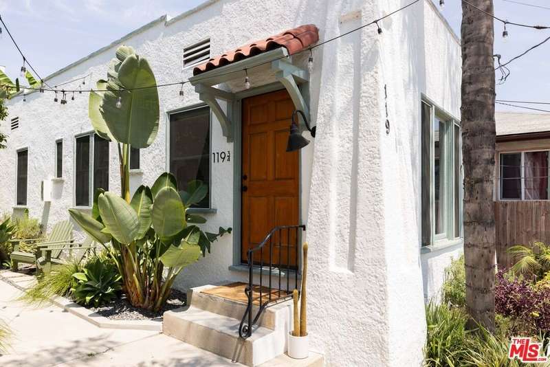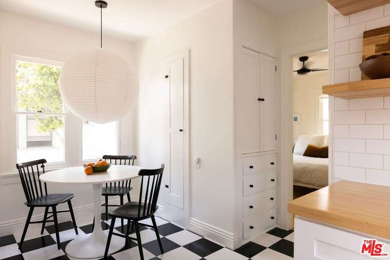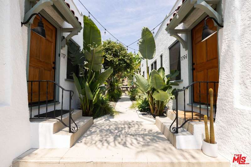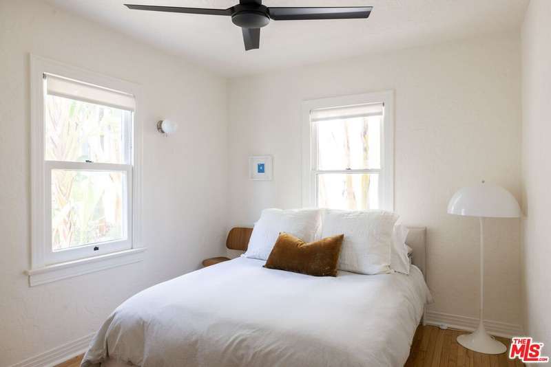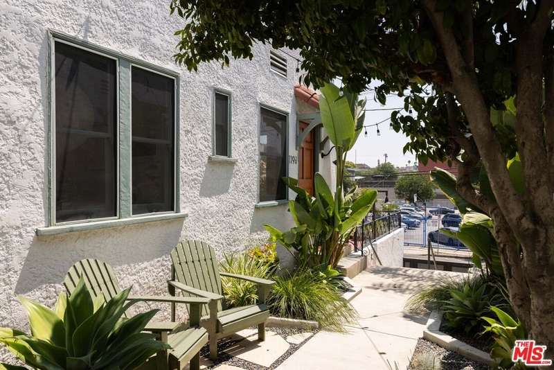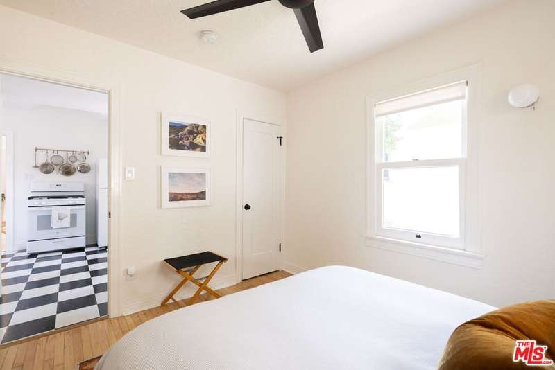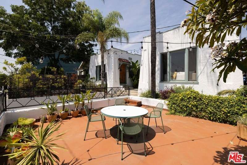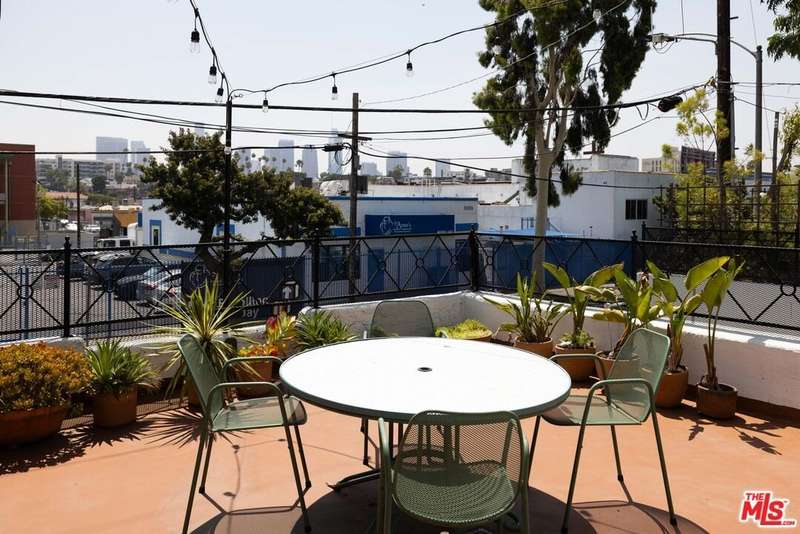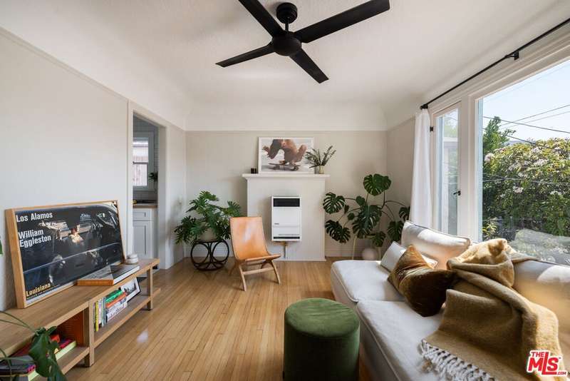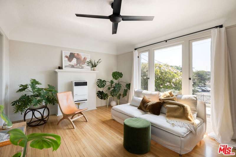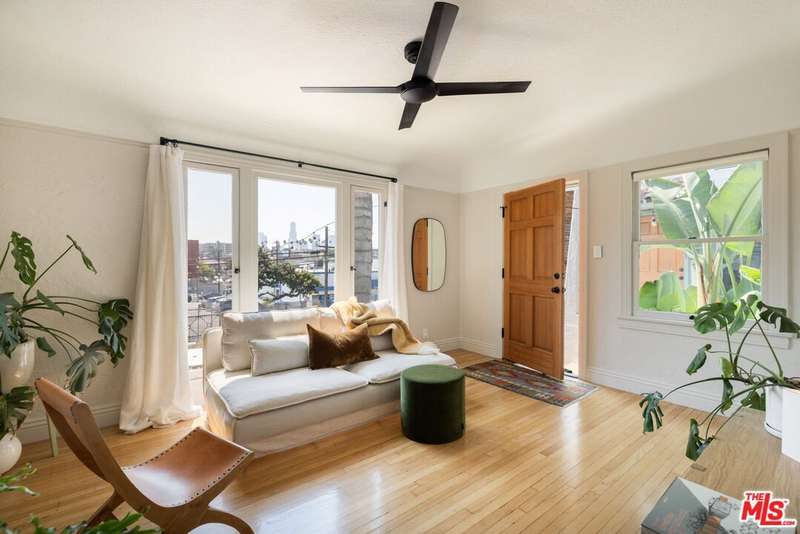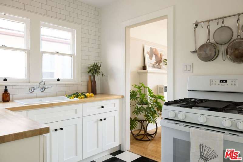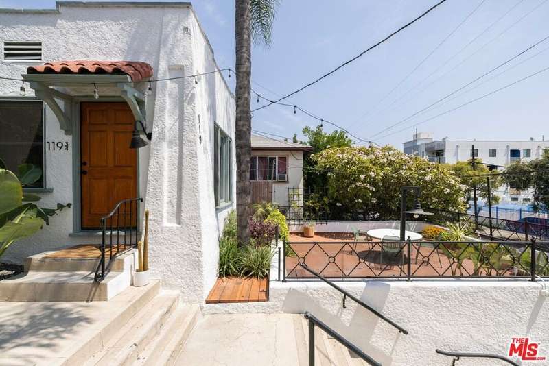 The house stands above the street in a gated Tenants-in-Common community. Tastefully updated, the one-bedroom, one-bath bungalow opens to a living room with hardwood floors, cove ceilings, a decorative fireplace, and large windows that frame views of the Downtown skyline. The deck, exclusive to this unit, is visible below, where you can imagine your future garden beds laden with herbs and lush potted greenery. At golden hour, light reflects off the Downtown towers and illuminates the eat-in kitchen, featuring checkerboard floors, butcher block countertops, open shelving, built-ins, and a backsplash of subway tile that reaches from the counter to the ceiling. A small hallway leads to the laundry area, which has sufficient room for utility shelving, and the bedroom, featuring an en-suite bathroom. Zia tile lines the bathroom floor and surrounds the combination tub/shower, complemented by Hans Grohe fixtures and a Duravit sink. Located near the center of Historic Filipinotown's thriving culinary and cultural scene, you'll enjoy Woon, Doubting Thomas, Gigi's, Brooklyn Bagel, 2220 Arts + Archives, and its close proximity to Silver Lake, Echo Park, and other beloved neighborhoods.