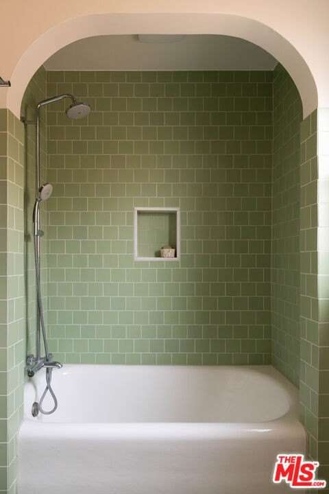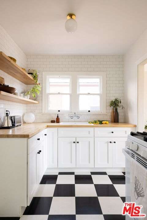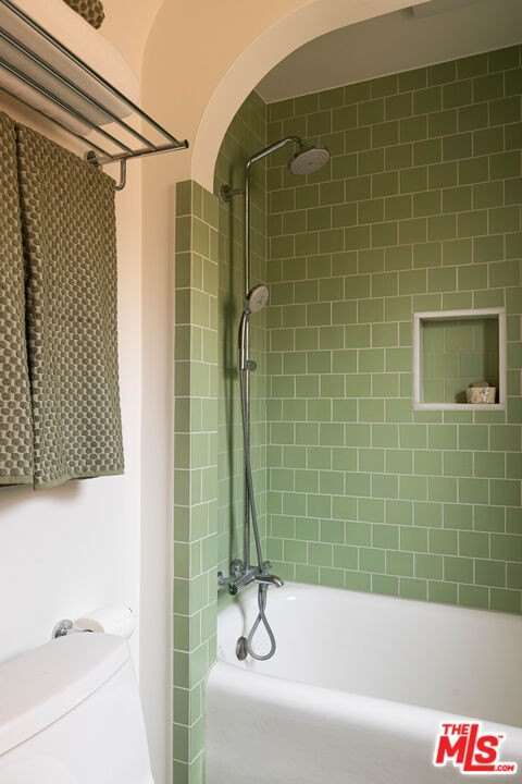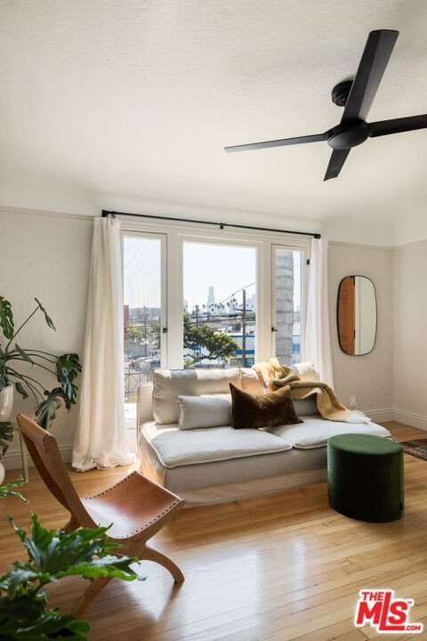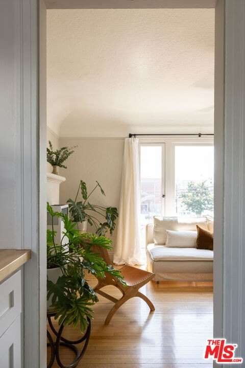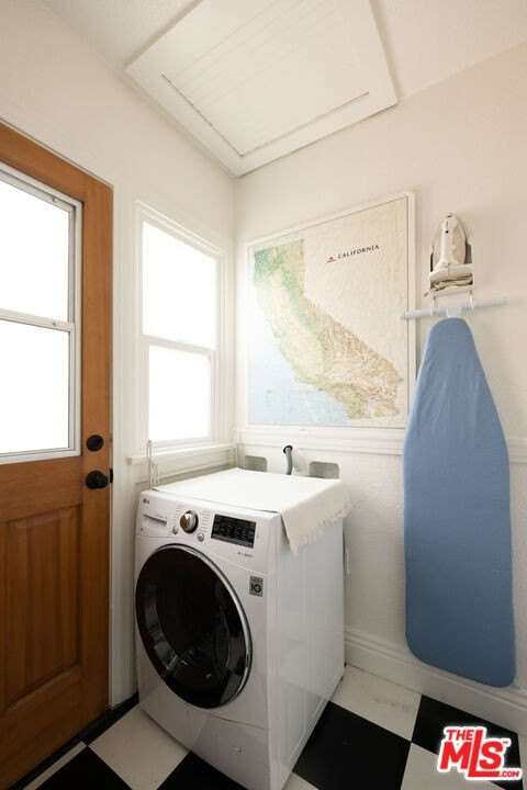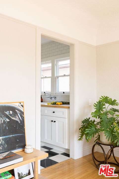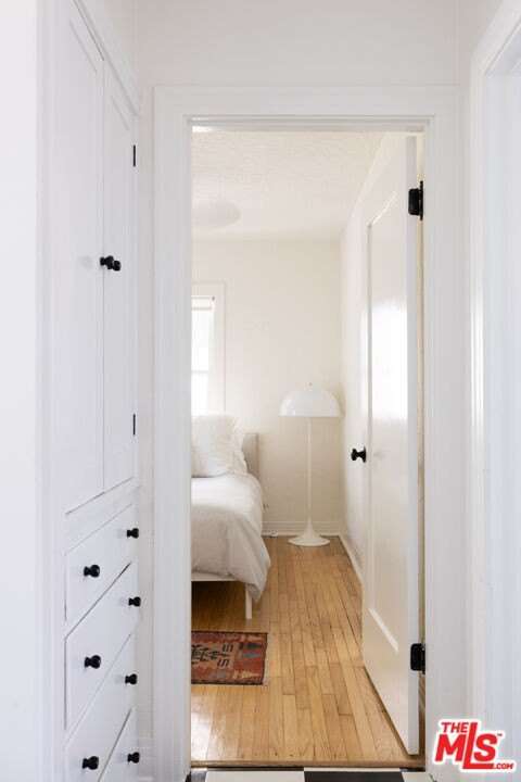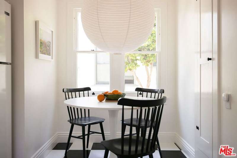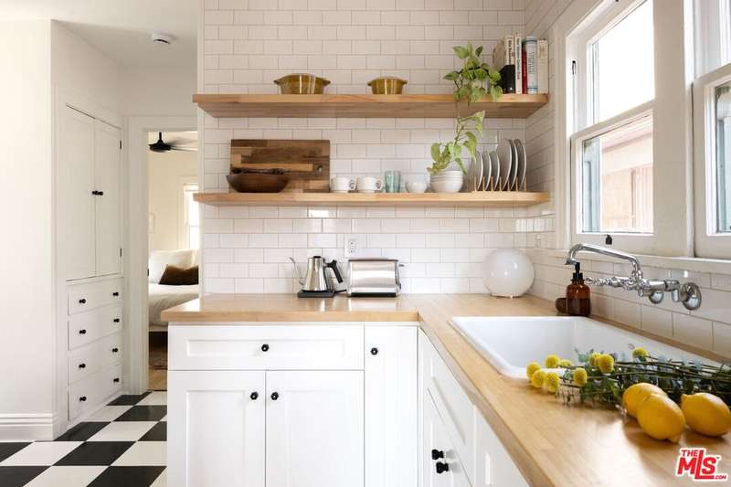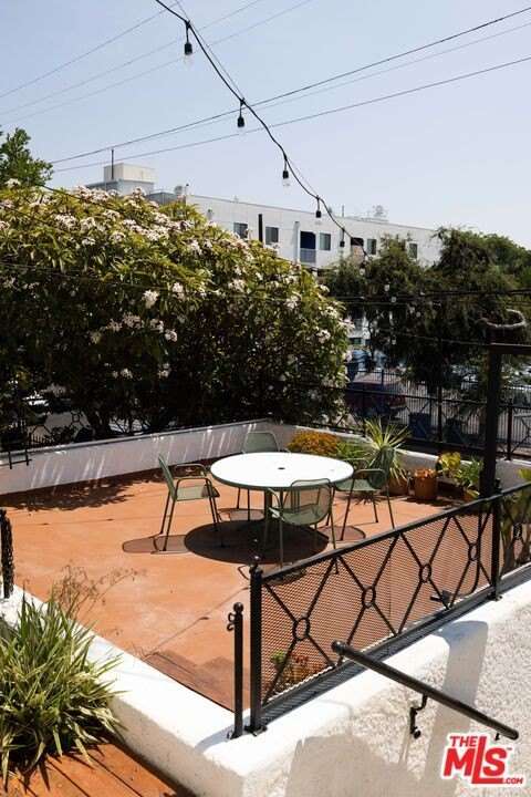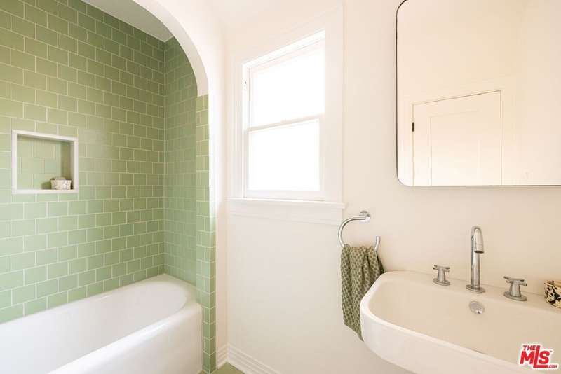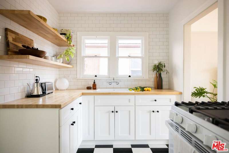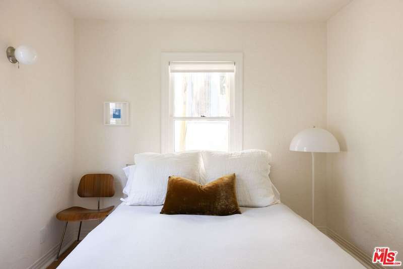 The house stands above the street in a gated Tenants-in-Common community. Tastefully updated, the one-bedroom, one-bath bungalow opens to a living room with hardwood floors, cove ceilings, a decorative fireplace, and large windows that frame views of the Downtown skyline. The deck, exclusive to this unit, is visible below, where you can imagine your future garden beds laden with herbs and lush potted greenery. At golden hour, light reflects off the Downtown towers and illuminates the eat-in kitchen, featuring checkerboard floors, butcher block countertops, open shelving, built-ins, and a backsplash of subway tile that reaches from the counter to the ceiling. A small hallway leads to the laundry area, which has sufficient room for utility shelving, and the bedroom, featuring an en-suite bathroom. Zia tile lines the bathroom floor and surrounds the combination tub/shower, complemented by Hans Grohe fixtures and a Duravit sink. Located near the center of Historic Filipinotown's thriving culinary and cultural scene, you'll enjoy Woon, Doubting Thomas, Gigi's, Brooklyn Bagel, 2220 Arts + Archives, and its close proximity to Silver Lake, Echo Park, and other beloved neighborhoods.