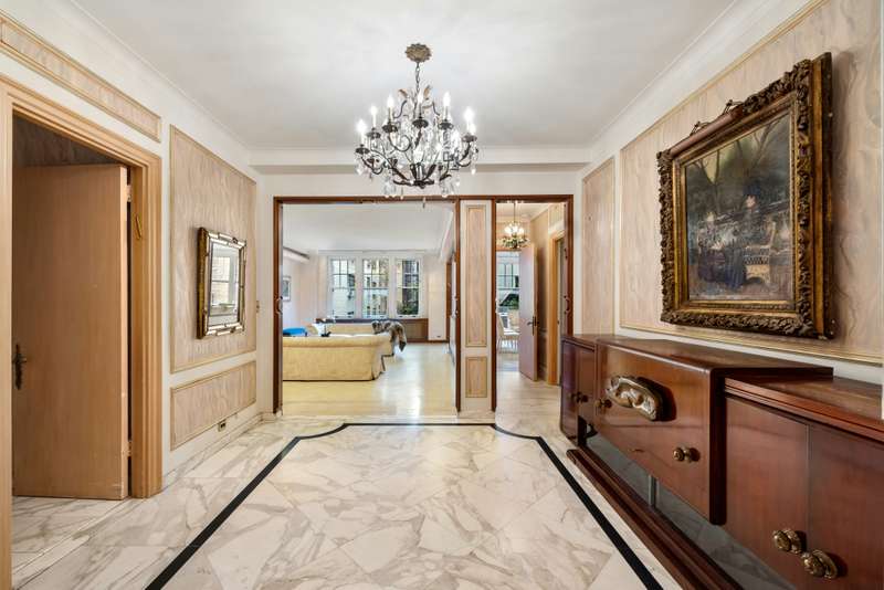 Entered by way of a semi-private landing, this residence opens to a gracious square gallery laid in timeless white marble with striking black inlay. The residence's layout is elegant and intuitive, with an easy flow between rooms and unusually large proportions throughout. The entertaining areas are all situated in the West wing of the home, crowned by a stately living room stretching nearly 24' deep. The living room is anchored by a handsome decorative marble fireplace and a West-facing wall of windows that overlook leafy courtyard gardens, drawing in warm afternoon sun. ;