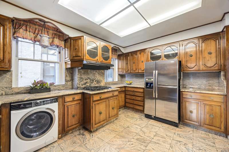 The formal dining room is immediately adjacent to the living room and easily accommodates large holiday gatherings or the most elaborate dinner parties. Currently partially opened to the living room by a half wall, the room may be restored with a full for more traditional entertaining or opened entirely for loft-like living. West facing as well, it is also filled with afternoon sun. Just beyond, the oversized double-windowed eat-in kitchen includes a separate breakfast area for casual dining. To the West, there is a large service room which originally contained a bathroom as well and thereby offers wonderful flexibility of use as a bedroom or home office as it now, or divided to accommodate a restored bathroom or laundry room, per your needs. Please see alternate floor plan.