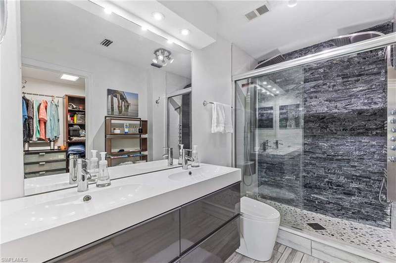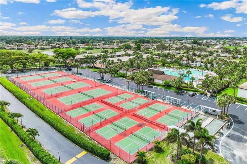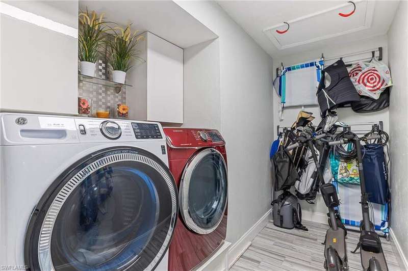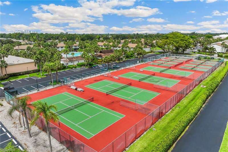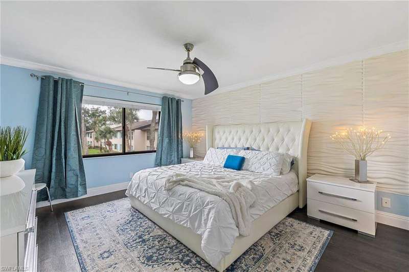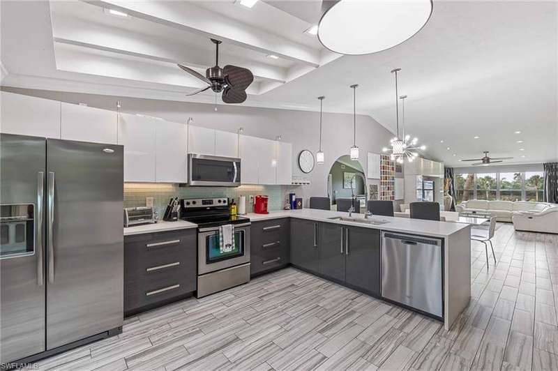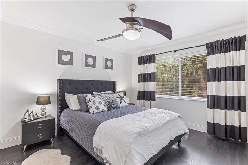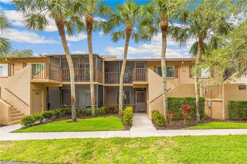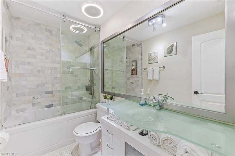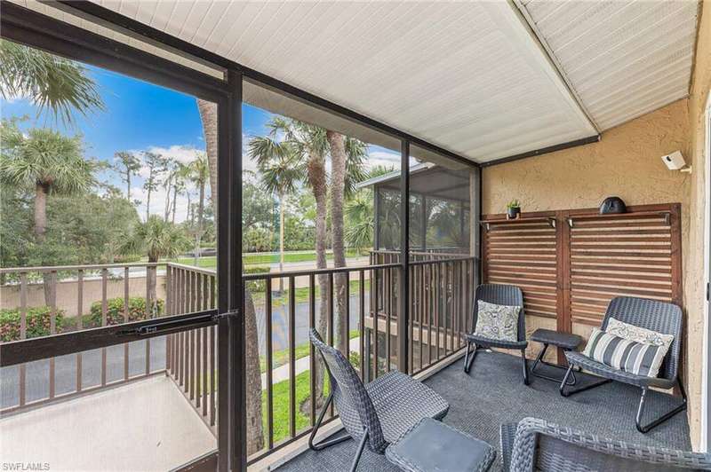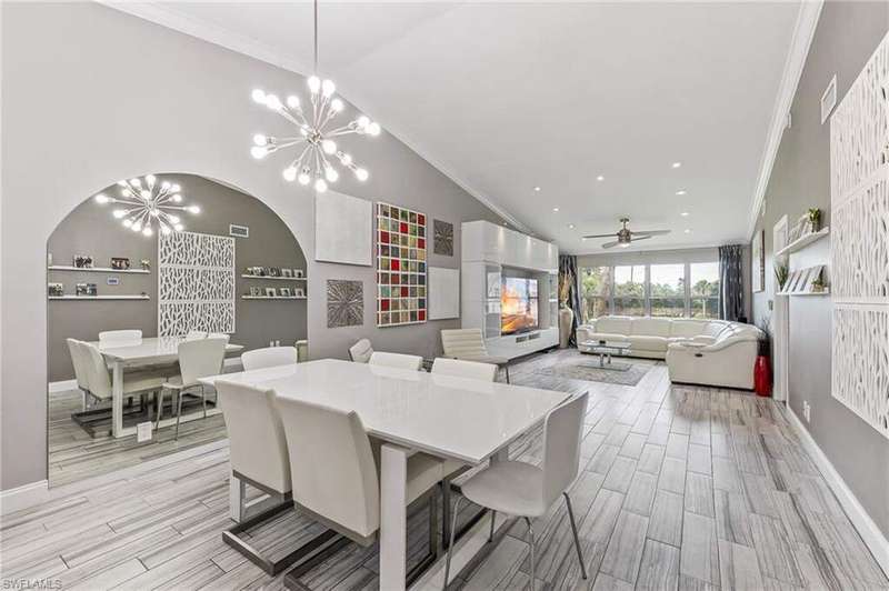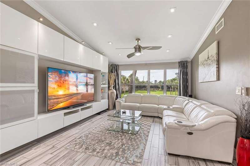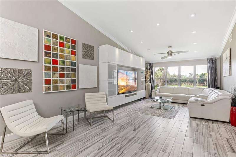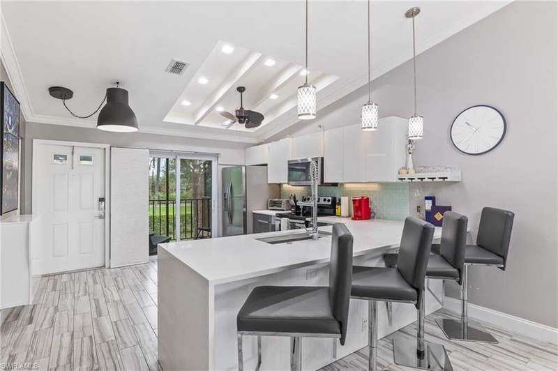 THIS WINTERPARK VIII ASSOC CONDO HAS LOWEST HOA FEES IN WINTERPARK + INCLUDES FLOOD INSURANCE!!! Perfectly positioned with easy access to downtown Naples and area beaches, this 2B/2BA unit is ideal for buyers looking to downsize or escape the harsh winters up north. The completely remodeled open floor plan features a custom-built wall unit in living room with lots of storage, (2023) HVAC unit, vaulted ceiling, smart thermostat and modern updates with an inspiring crisp/clean grey & white interior color palette throughout to compliment the wood-like plank tile flooring. Kitchen boasts sleek white + charcoal Euro-style cabinets, glass tile backsplash, dramatic quartz waterfall counter w/ bar seating and stainless-steel appliances. Both baths have been modernized as well. The primary ensuite also features Euro-style sleek cabinetry, 3" thick counters, dual sinks & showerheads. Guest bath has stunning white vanity with glass countertop, decorative tile, jetted tub w/ rain showerhead and bluetooth fan. In addition, this bright and sunny second floor unit offers a screened outdoor patio to relax and unwind with a book or favorite beverage. Pet friendly and great resort-style amenities including large community pool, bocce, shuffleboard, pickleball and tennis courts. Truly a coastal get-a-way you'll love coming home to.