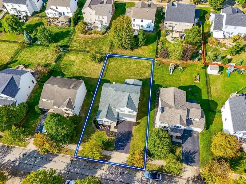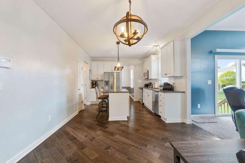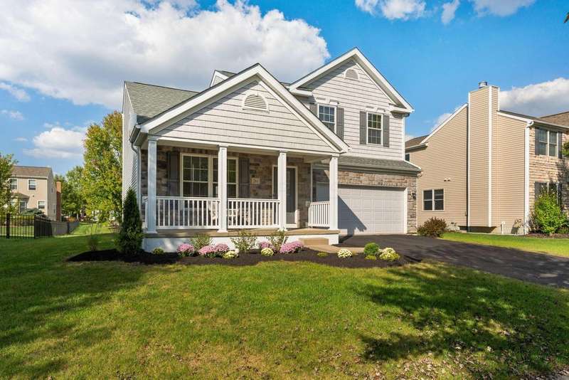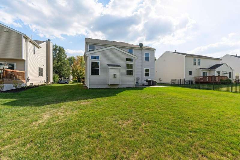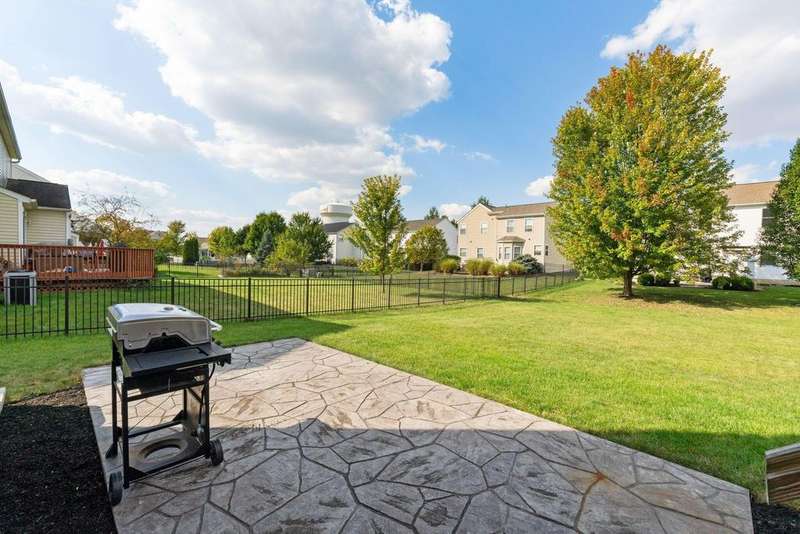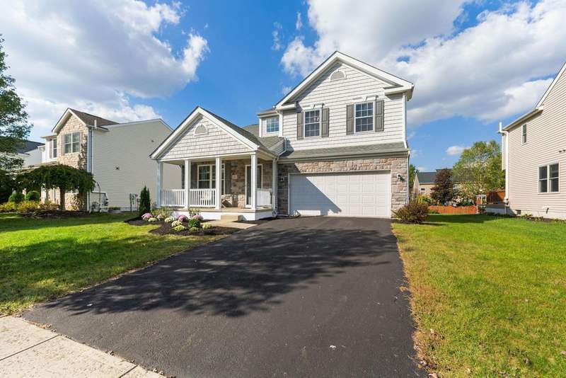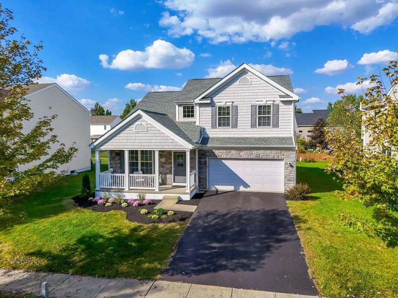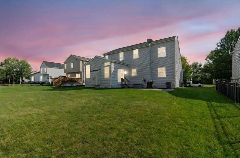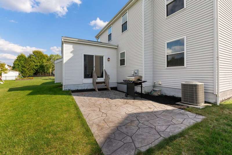 This spacious 4 bedroom, 2.5 bath home boasts a vaulted open floor plan filled with upgrades. A dramatic two-story entry sets the tone, complemented by crisp white trim and six-panel doors throughout. The gourmet kitchen features 42'' cabinets, granite countertops, stainless steel appliances, a large island with pendant lighting, and a generous eating area.Hardwood floors flow through the front entry, kitchen, and formal dining room. The family room opens seamlessly to the kitchen and showcases a cozy gas log fireplace.Upstairs, the vaulted owner's suite offers a large walk-in closet, whirlpool soaking tub, and separate shower. Three additional bedrooms and a full bath complete the second floor.The full basement includes a rough-in for a future bath, while the stamped concrete patio provides a private outdoor retreat?perfect for entertaining. NEW ROOF April 2024. Home Warranty Provided through HomeGard.This home is designed for both everyday living and memorable gatherings?don't miss your chance!